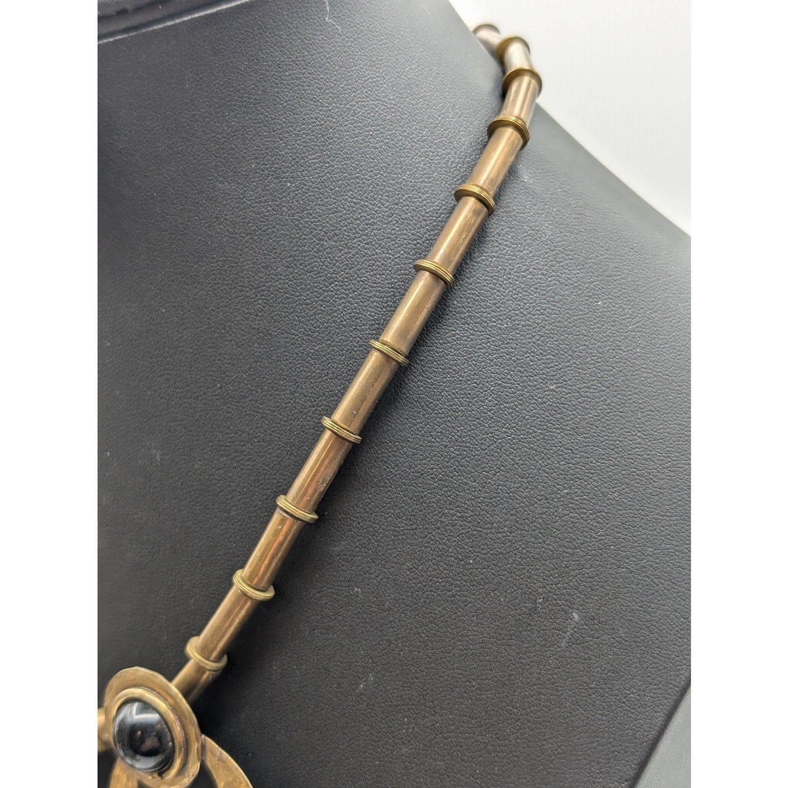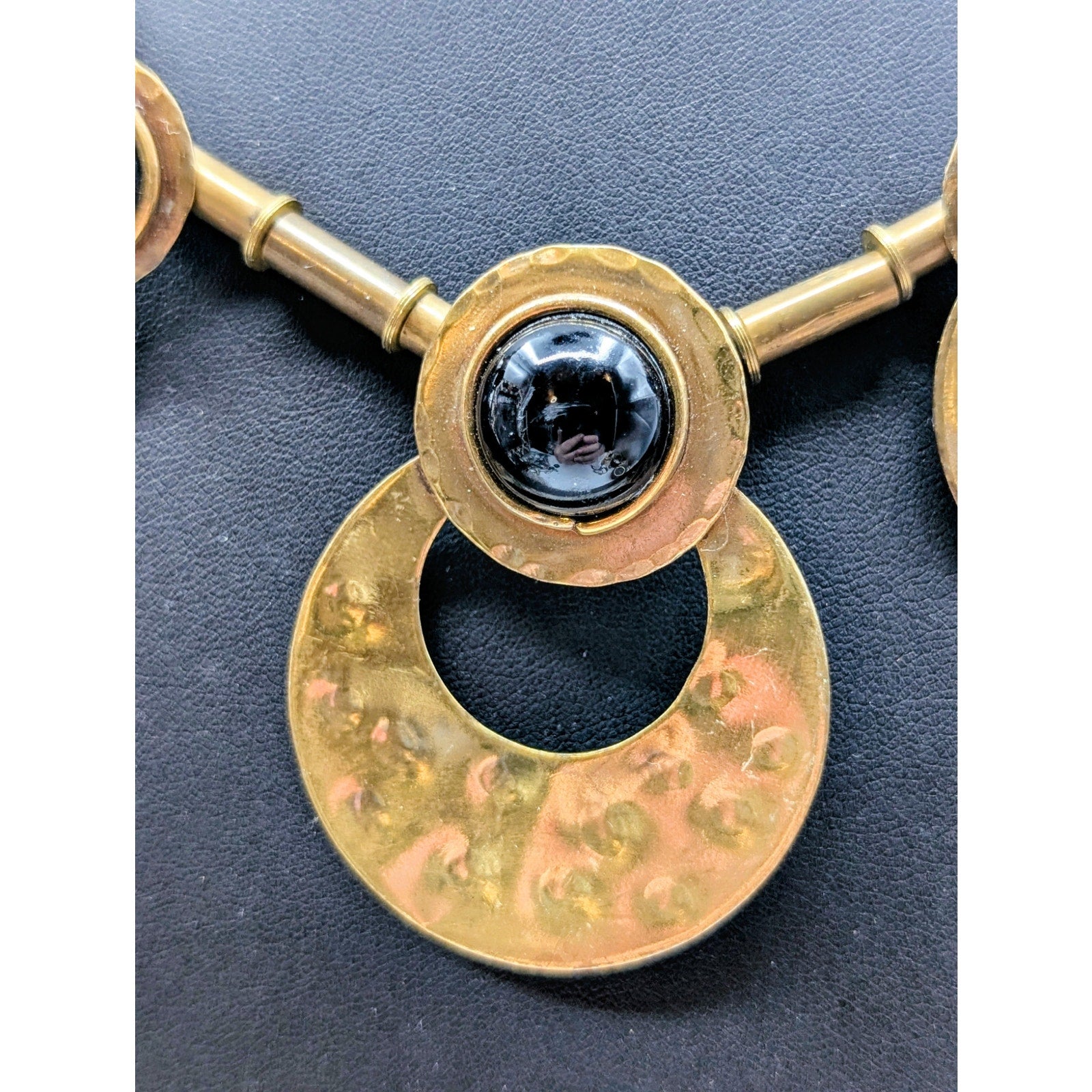 Vintage Brass Open Circles Black Cabochon Tribal Statement Necklace