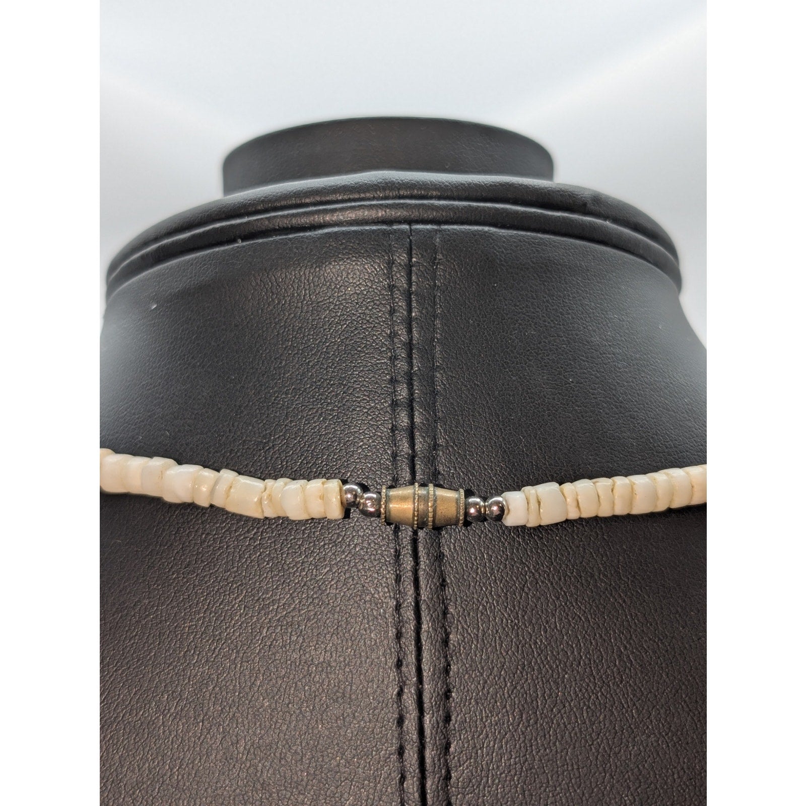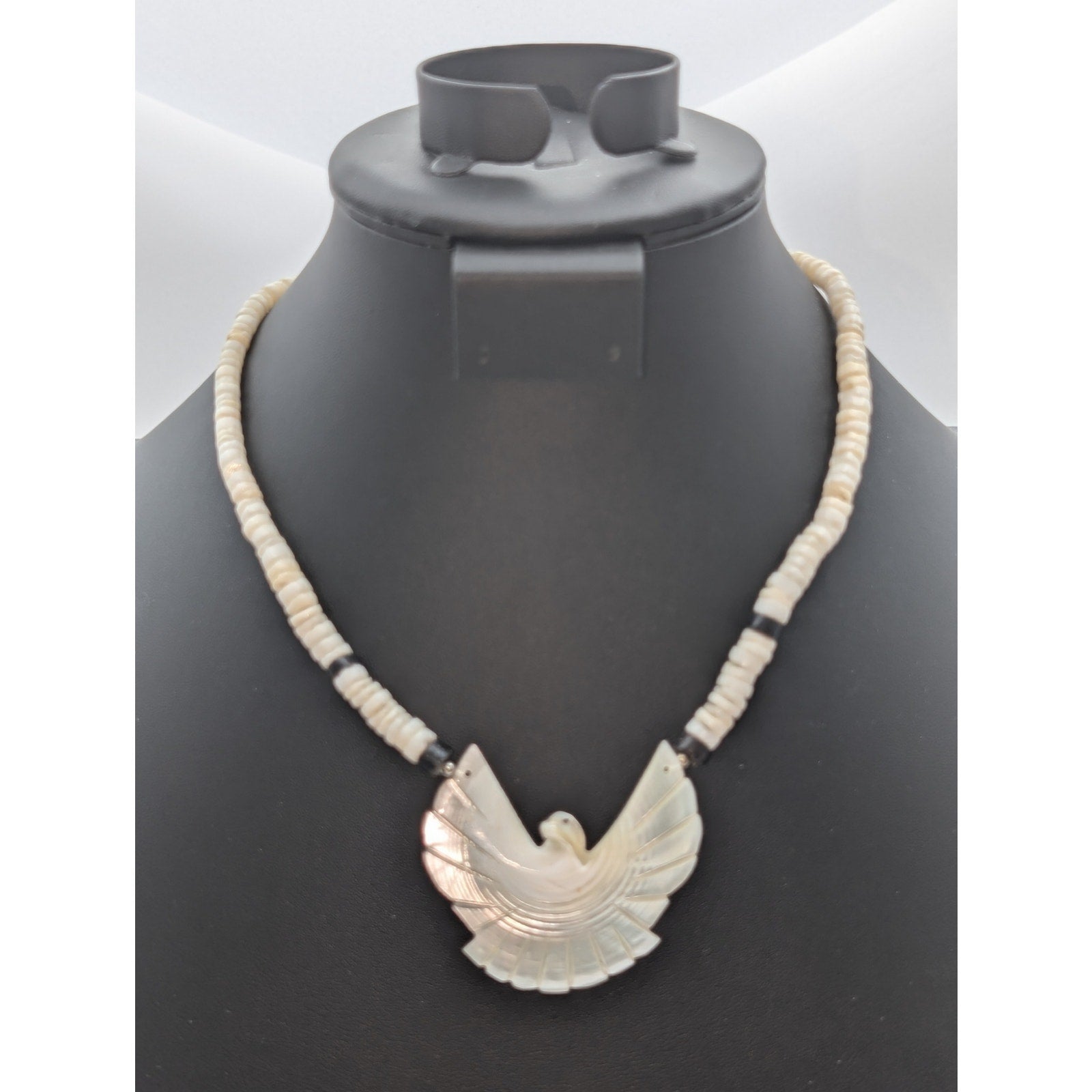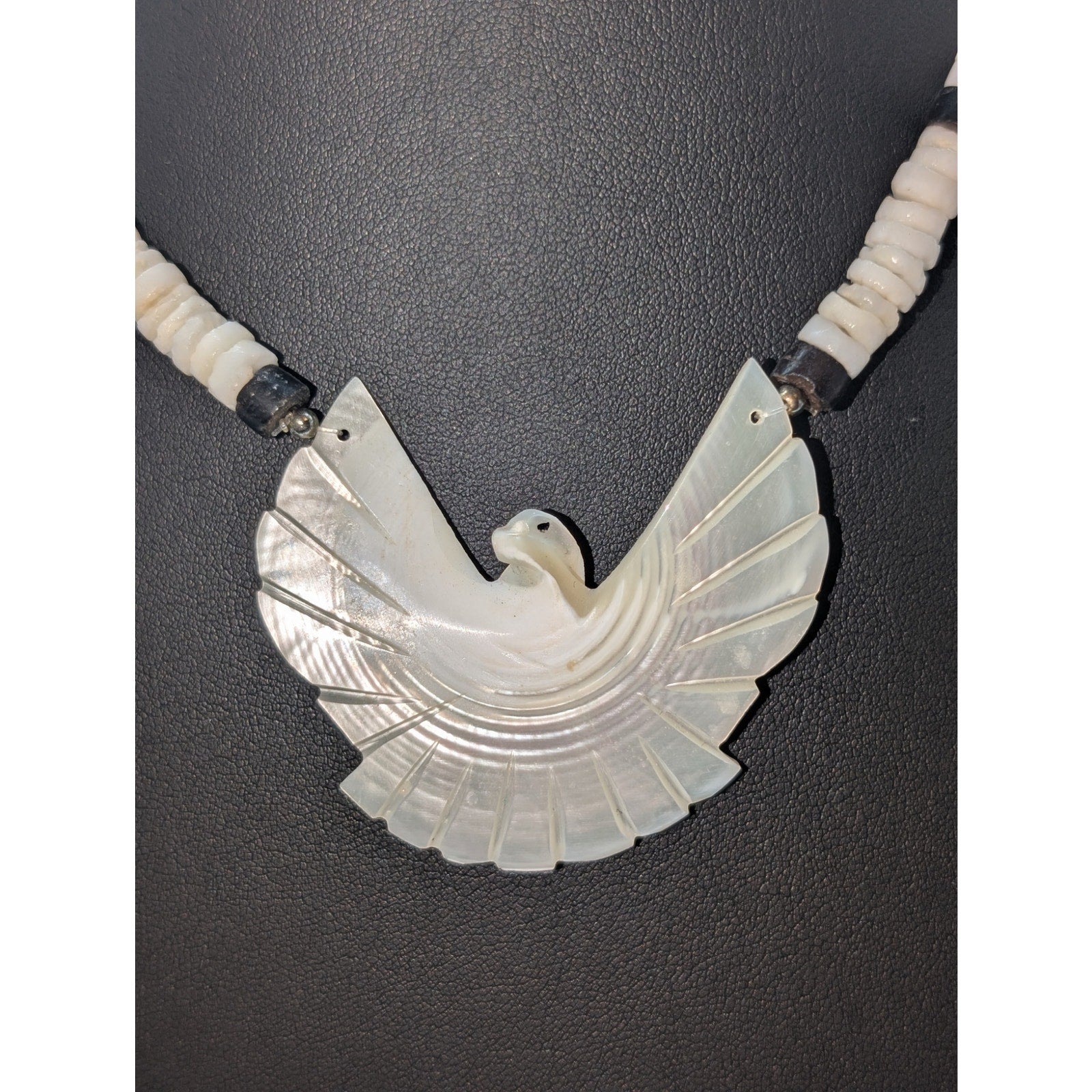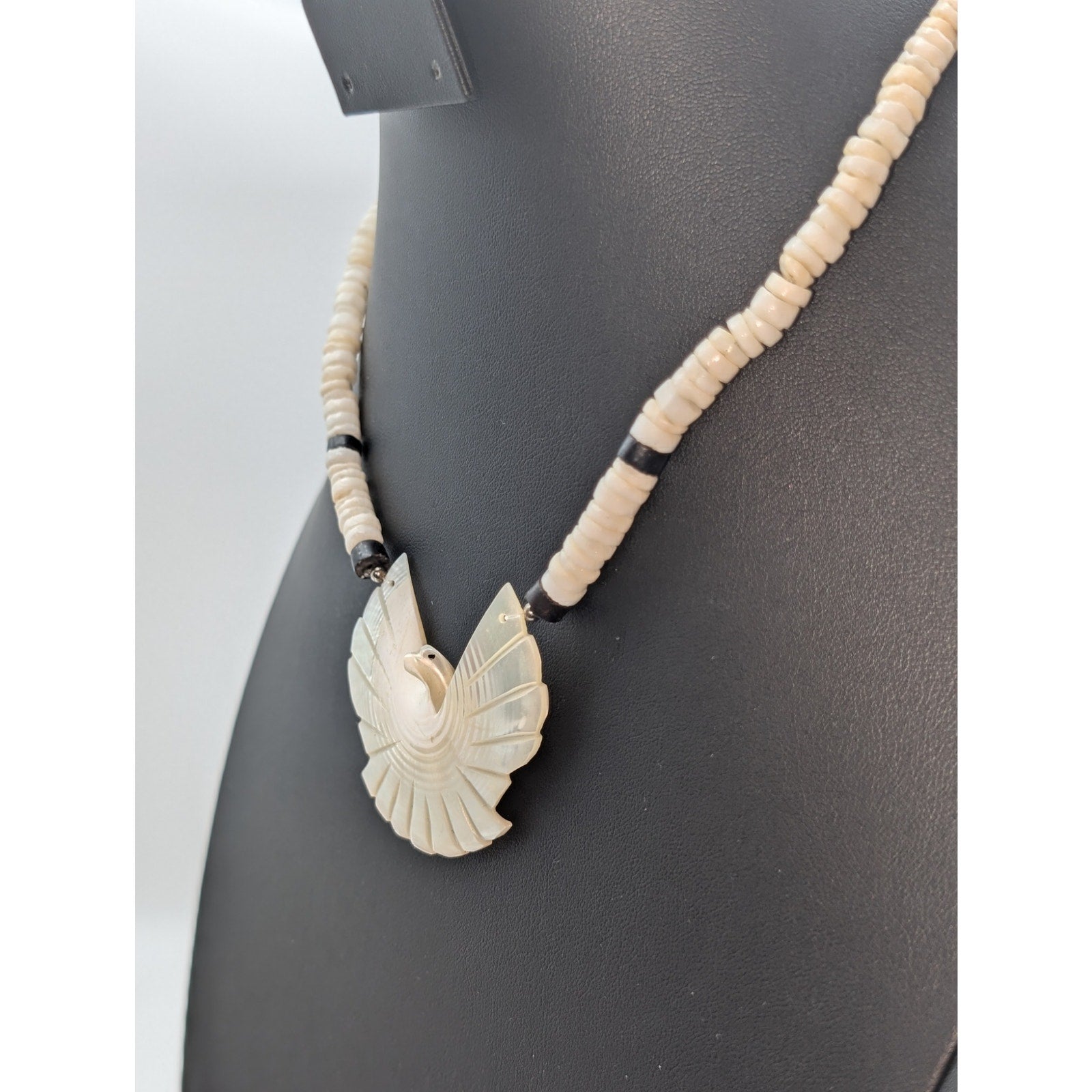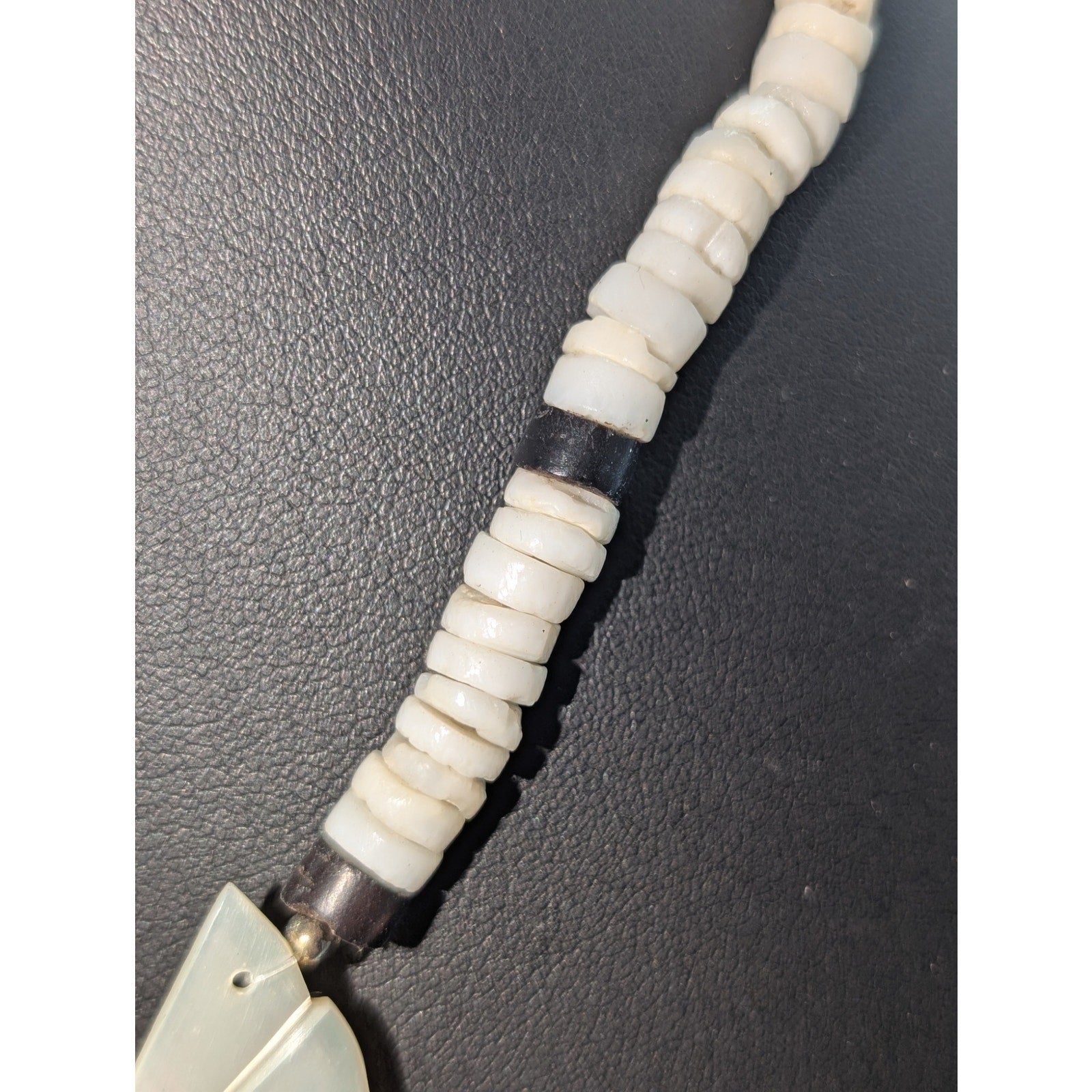 Vintage Carved MOP Island Bird White & Black Accent Shell Bead 18" Necklace. Pre-owned, this necklace is in excellent condition. Bird in flight. Barrel clasp.