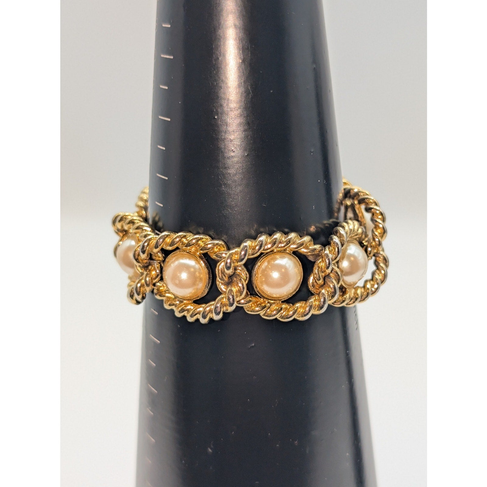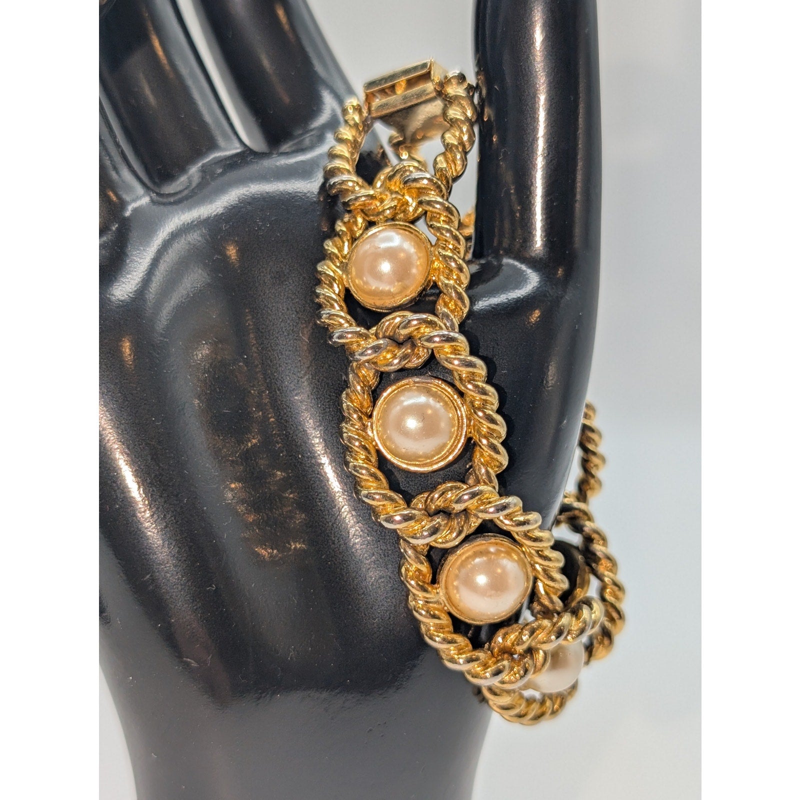 Vintage Chunky Twisted Gold Tone Chain Link Bezel Set Faux Pearl Bracelet