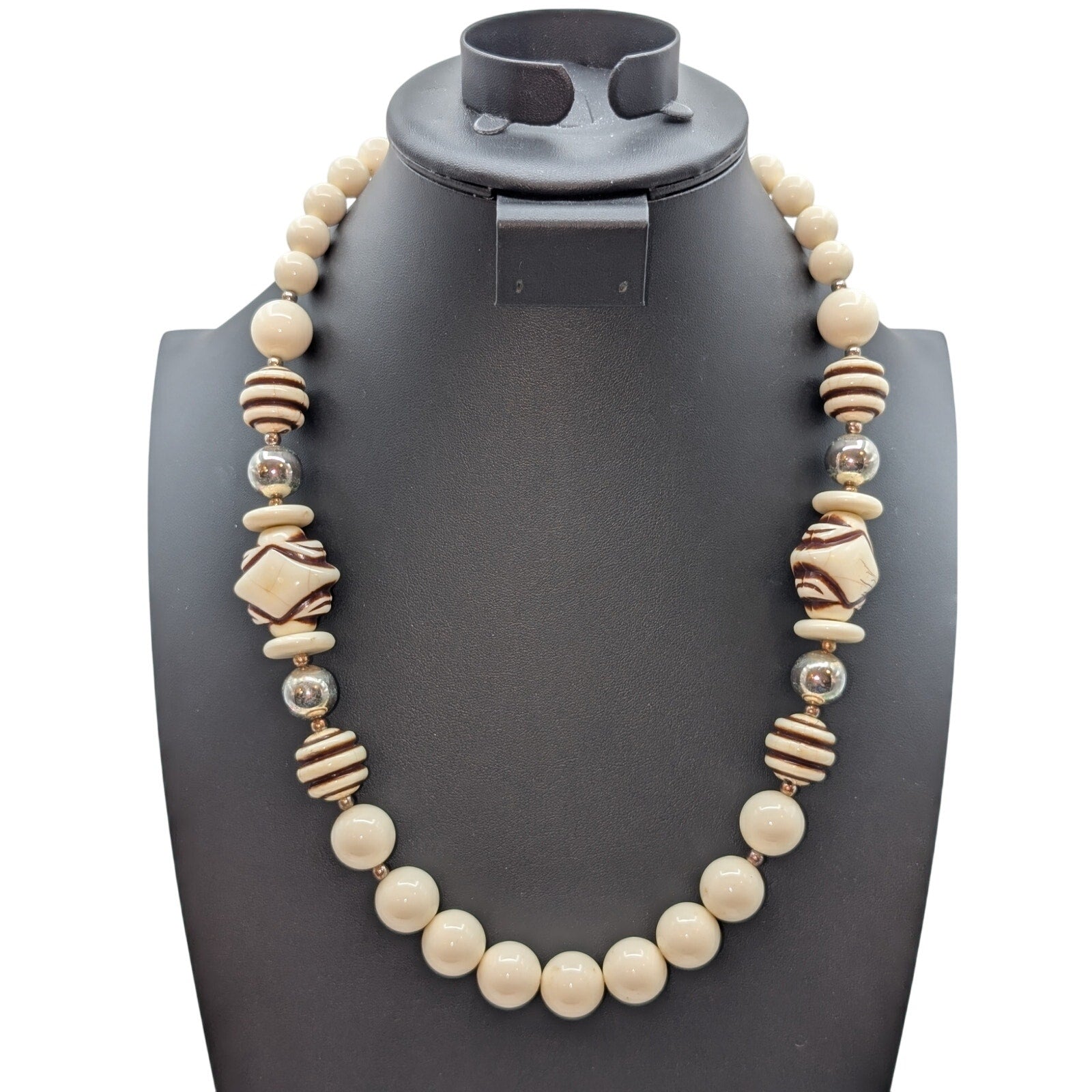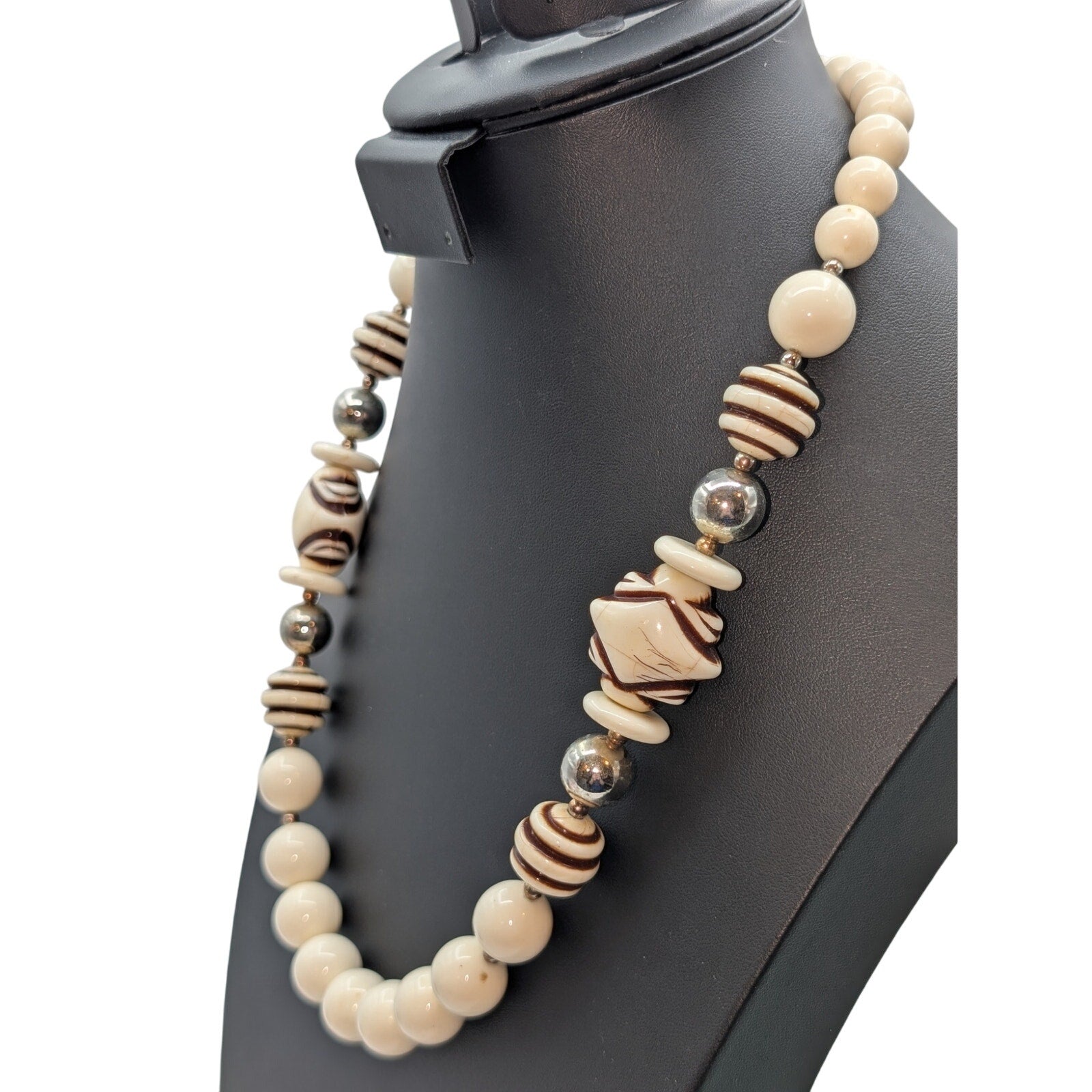 Vintage Cream Brown Stripe Silver Tone Beaded 25" Necklace
