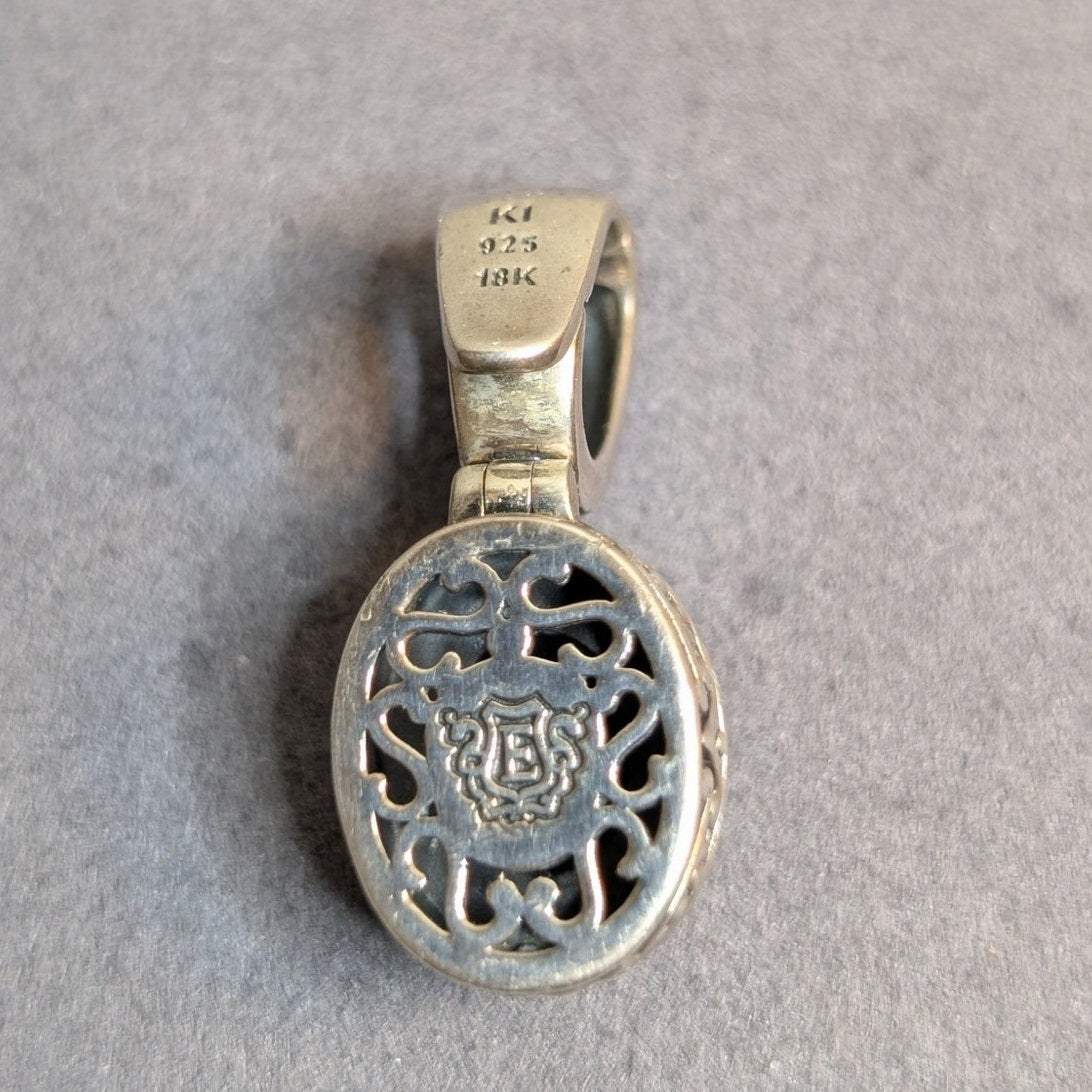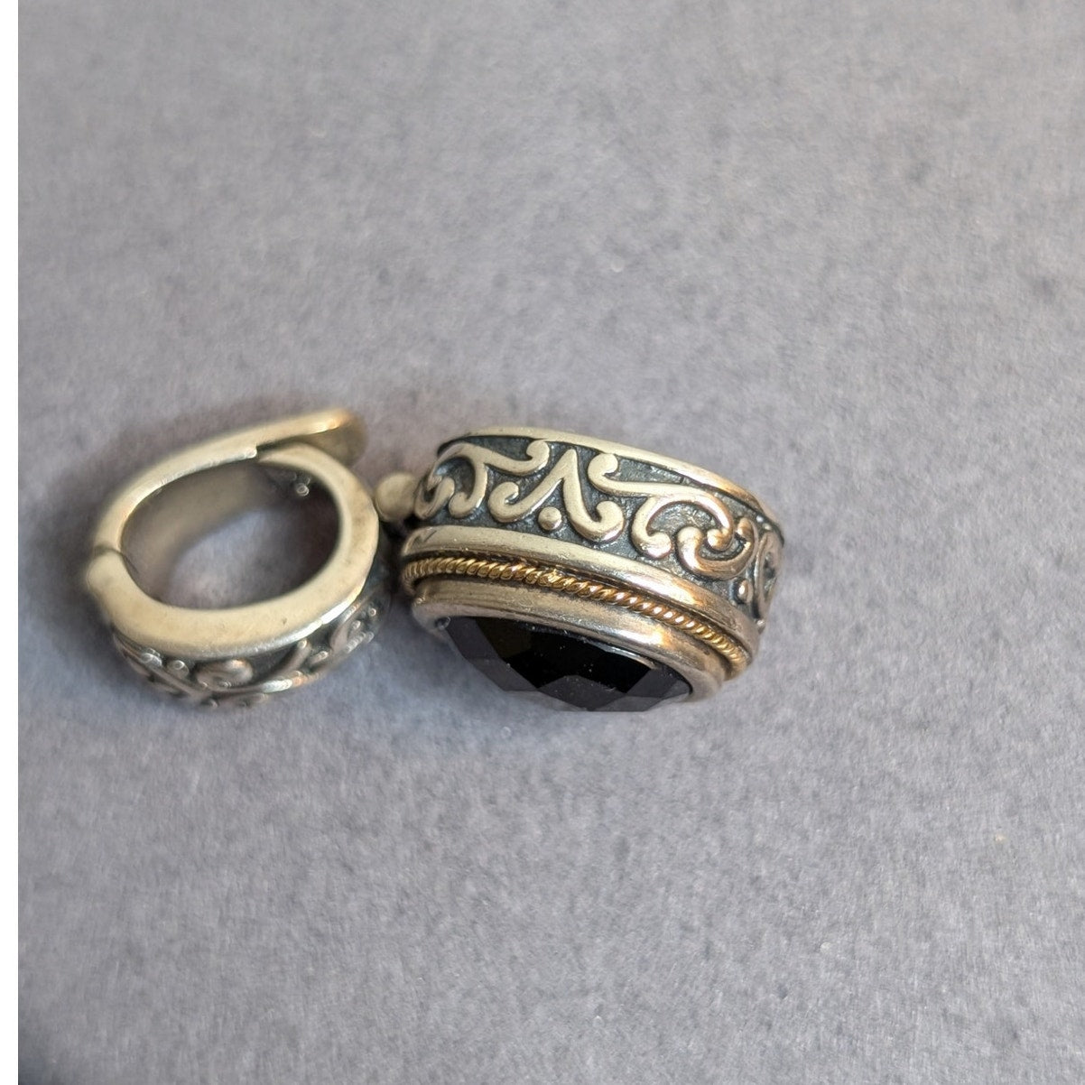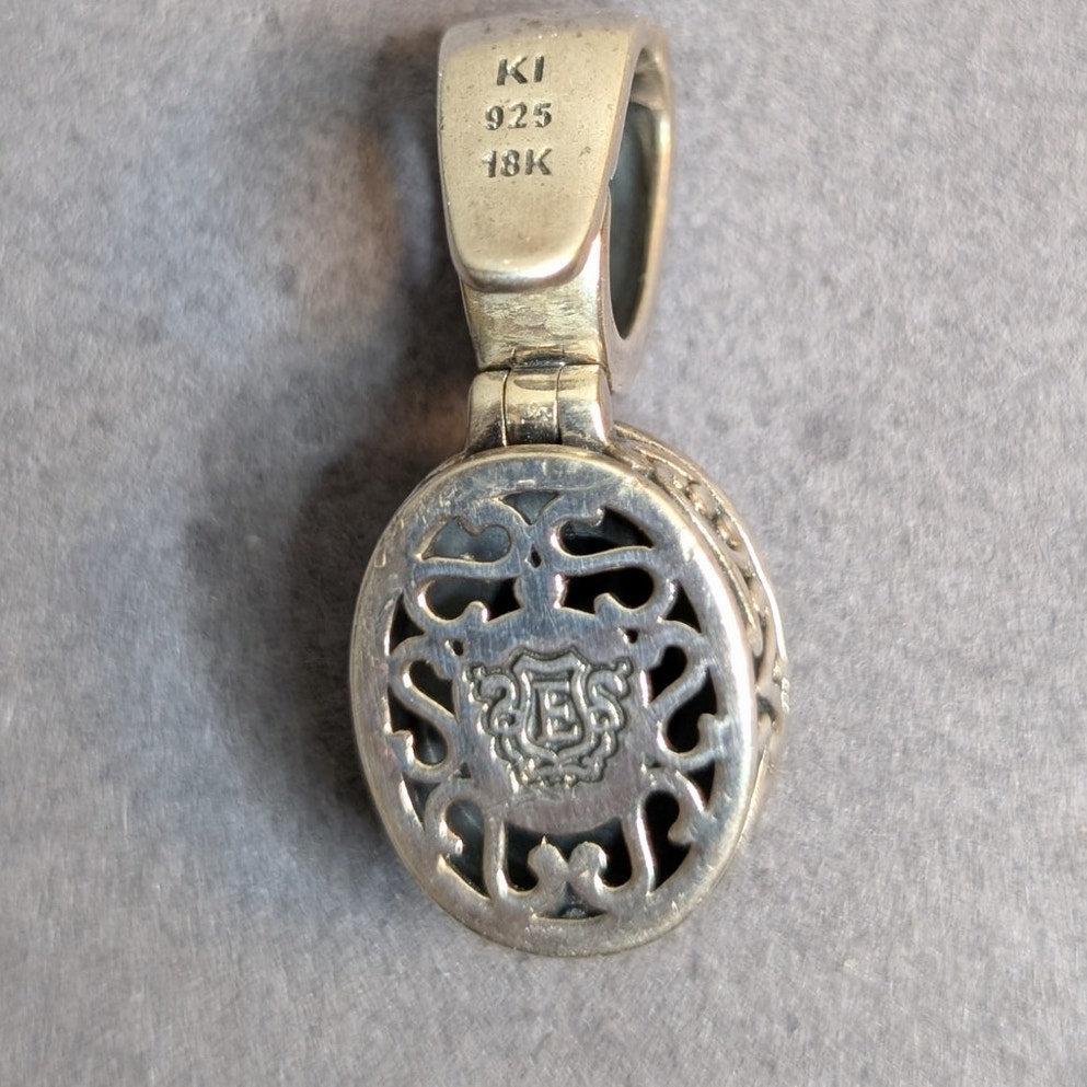 Vintage Faceted Black Onyx Sterling Silver 18K Yellow Gold Enhancer Pendant by Eleganza. Pre-owned, this enhancer pendant is in excellent condition.