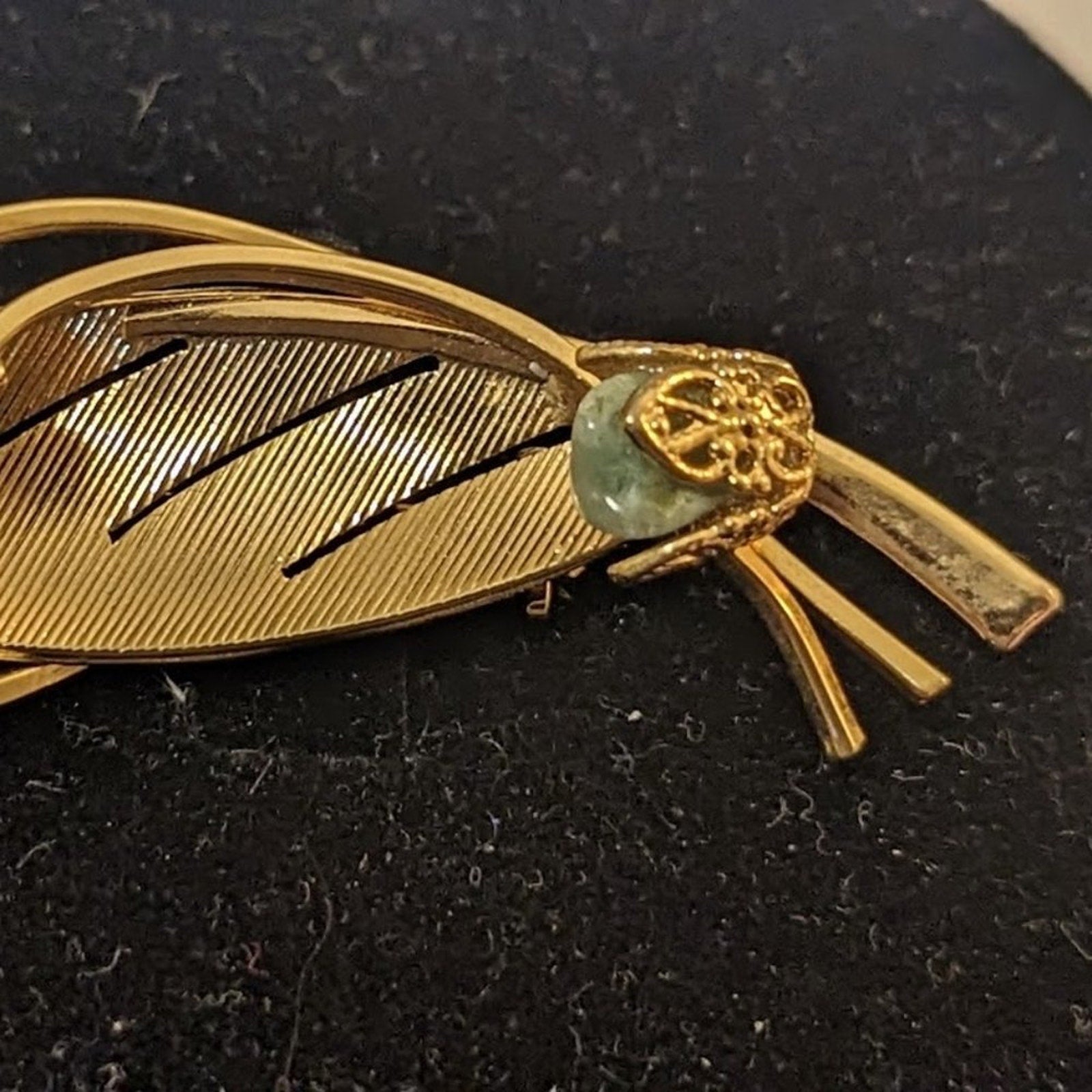Vintage Faux Pearl and Adventurine Gold Tone Leaf Brooch. Pre-owned, this brooch is in excellent vintage condition. I remember these brooches back in the 60s. It measures almost 3" long.