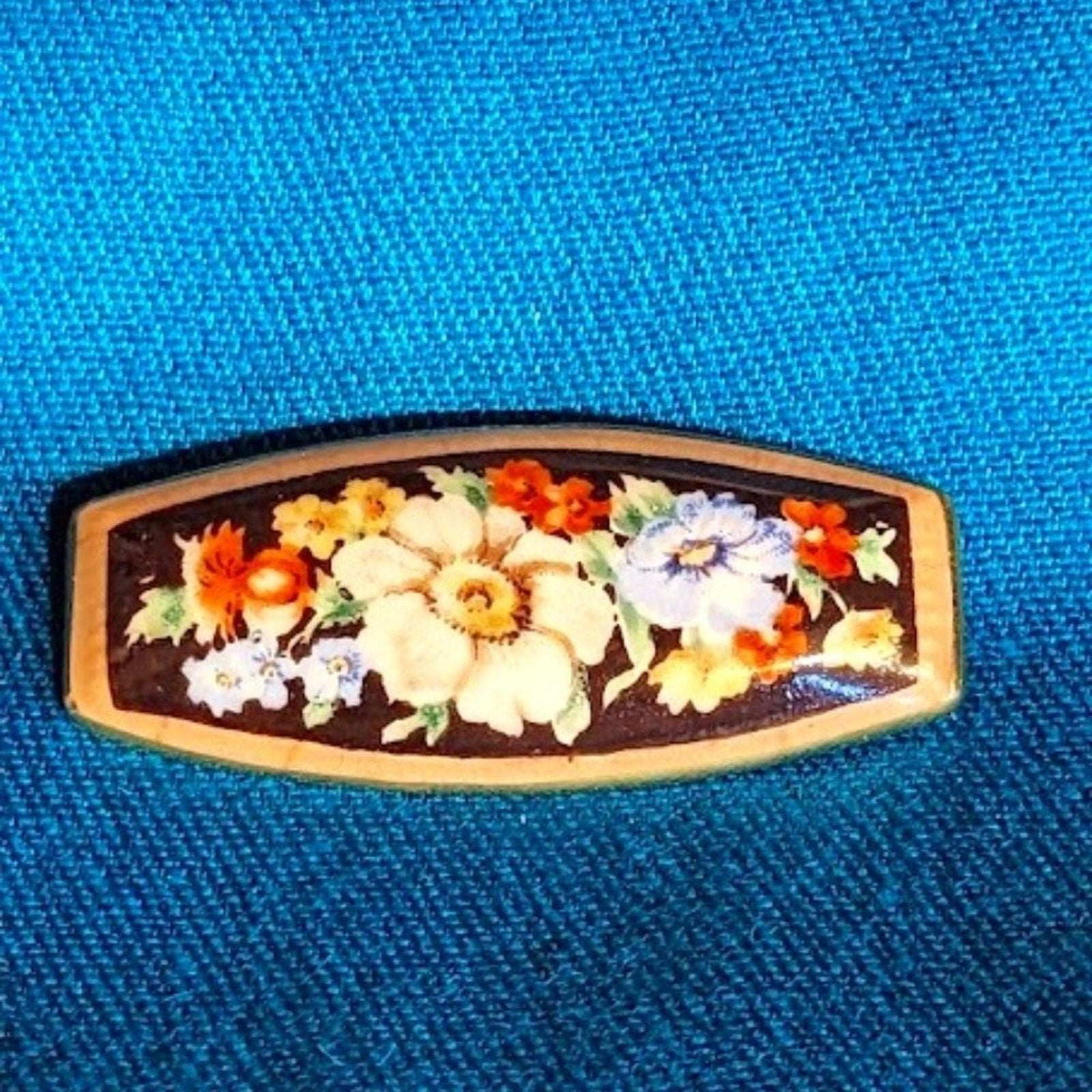 Vintage Germany Ceramic Purple Flower Brooch. Pre-owned, this brooch is in good vintage condition. Old hook clasp. Measures 2 1/8" across and 1" H. Hand painted with gold gild paint on the edges.
