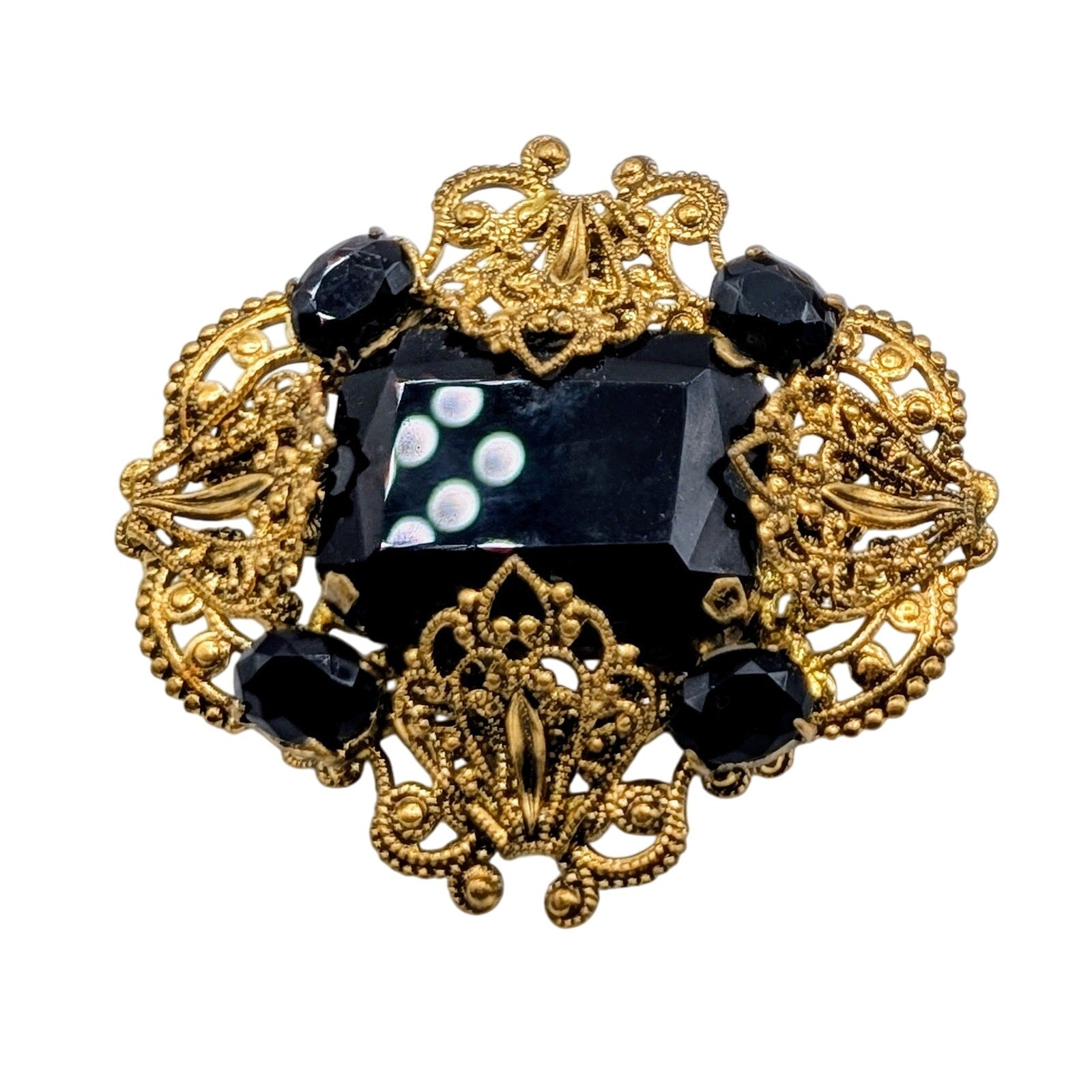 Vintage Gilded Filigree Three Piece Brooch Lot. Vintage Czech Gilded Ornate Filigree Jet Black Glass Tone Brooch, Made in West Germany Flower Open Cut Flower Brooch, and W. Germany Celestial Fish Cameo Brooch. Pre-owned, these brooches are in great vintage condition. Look stunning grouped together.