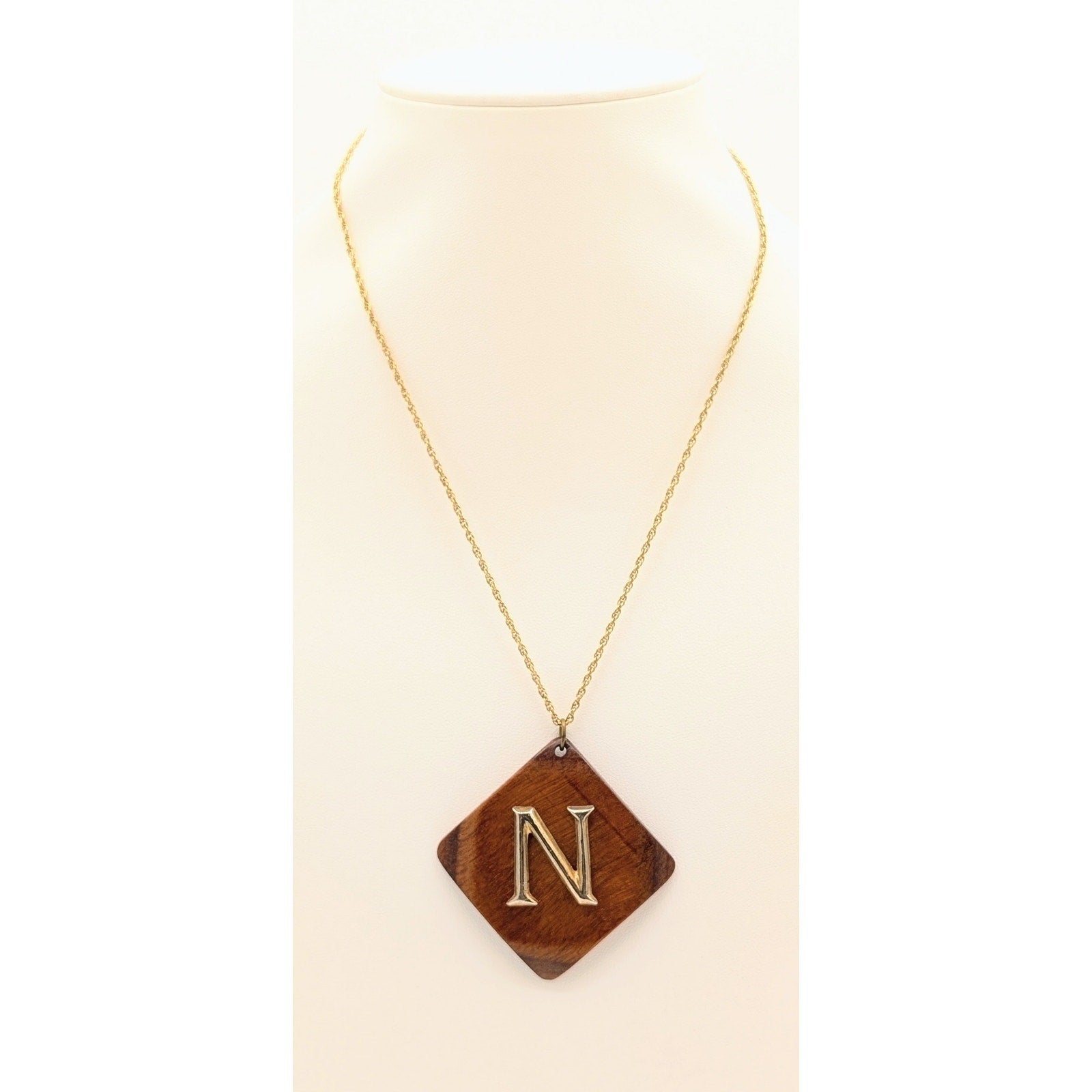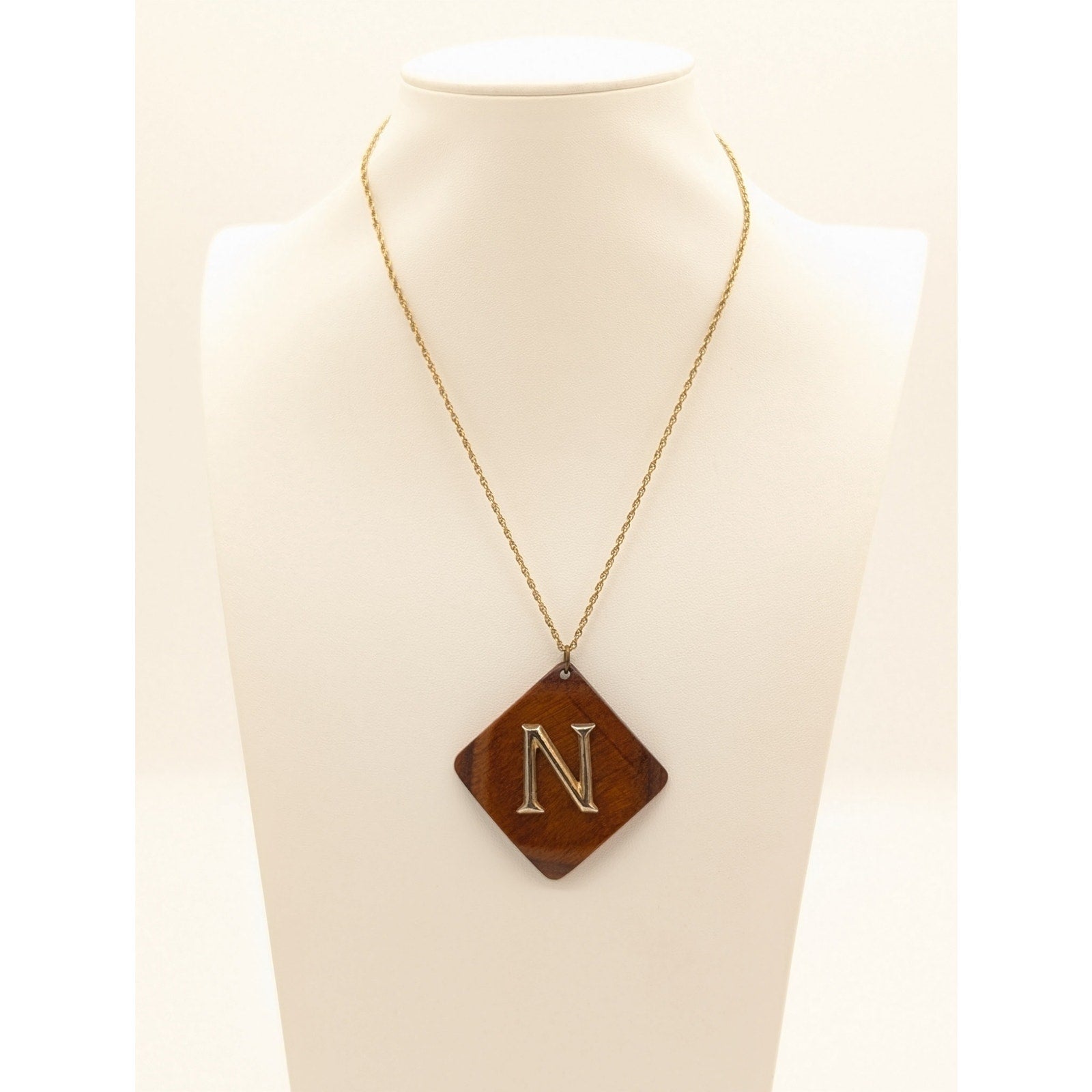 Vintage Gold Tone Wooden Initial 'N' 1.5" Pendant 17" Necklace