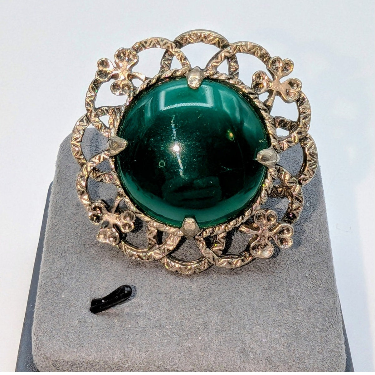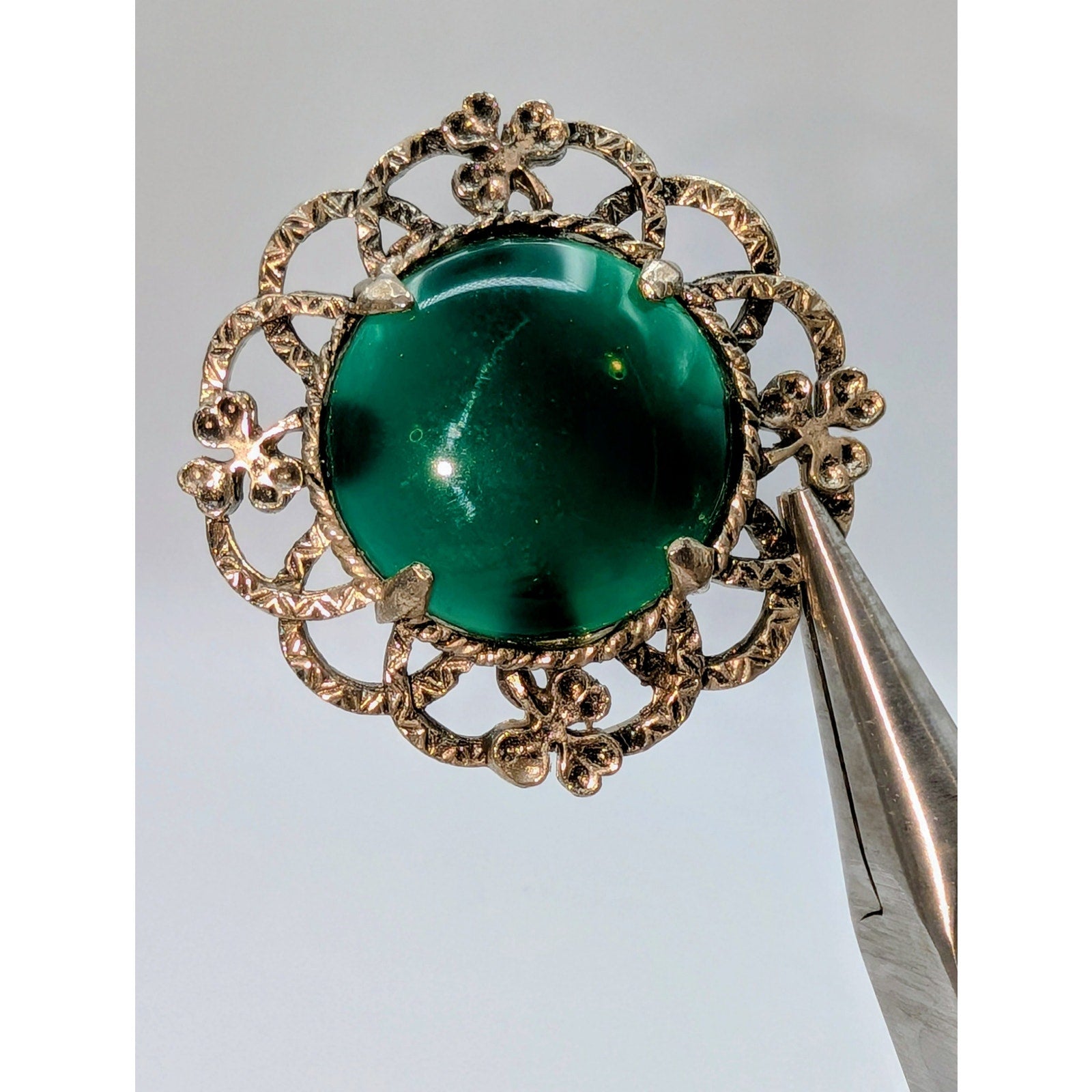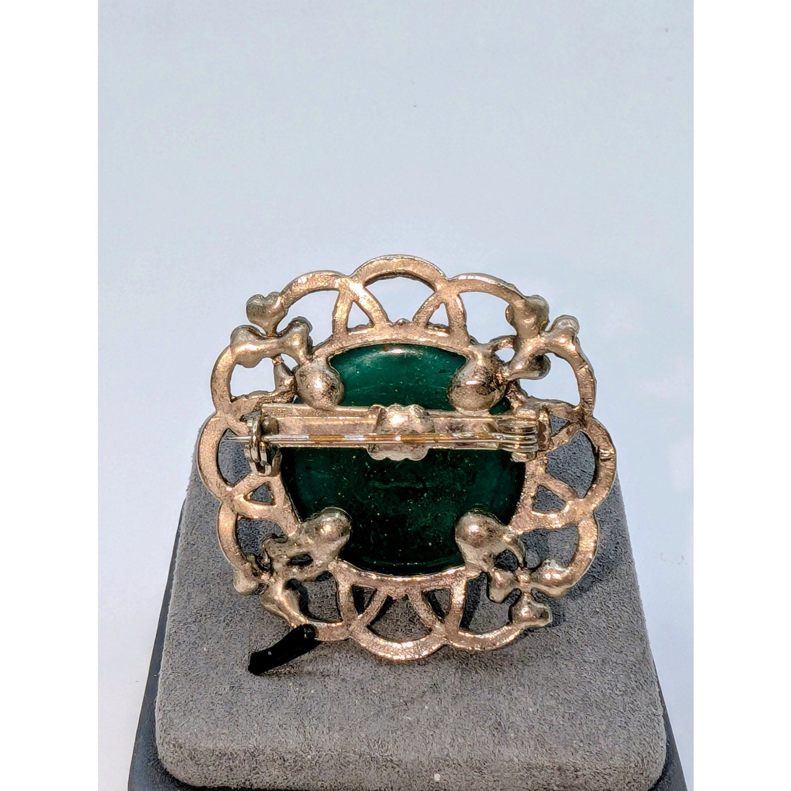 Vintage Green Glass Shamrock Silver Tone Brooch. Pre-owned, this brooch is in excellent vintage condition. Some wear on the pin back hardware.