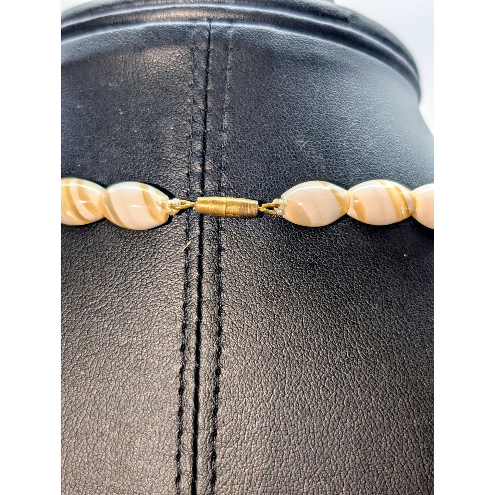 Vintage Hand Carved Balamuti Mother of Pearl Graduated Elongated Bead 17" Necklace. Traditional creamy white vintage (1930-40's) hand carved natural mother of pearl beads with a gold toned barrel clasp. Great vintage condition with one or two small chips on the end of a couple beads. 69 grams