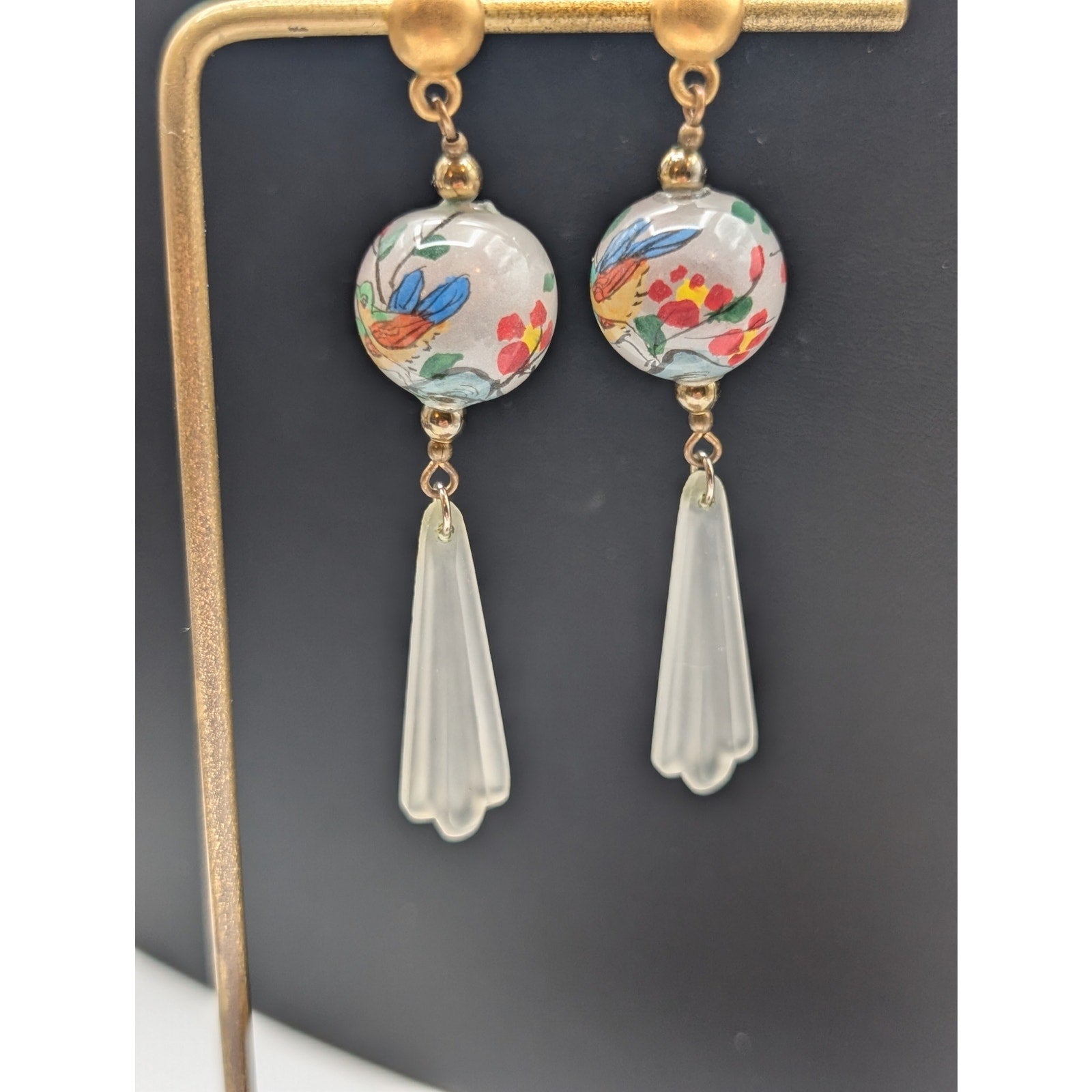 Vintage Japanese Painted Glass Bead White Frosted Dangle Earrings
