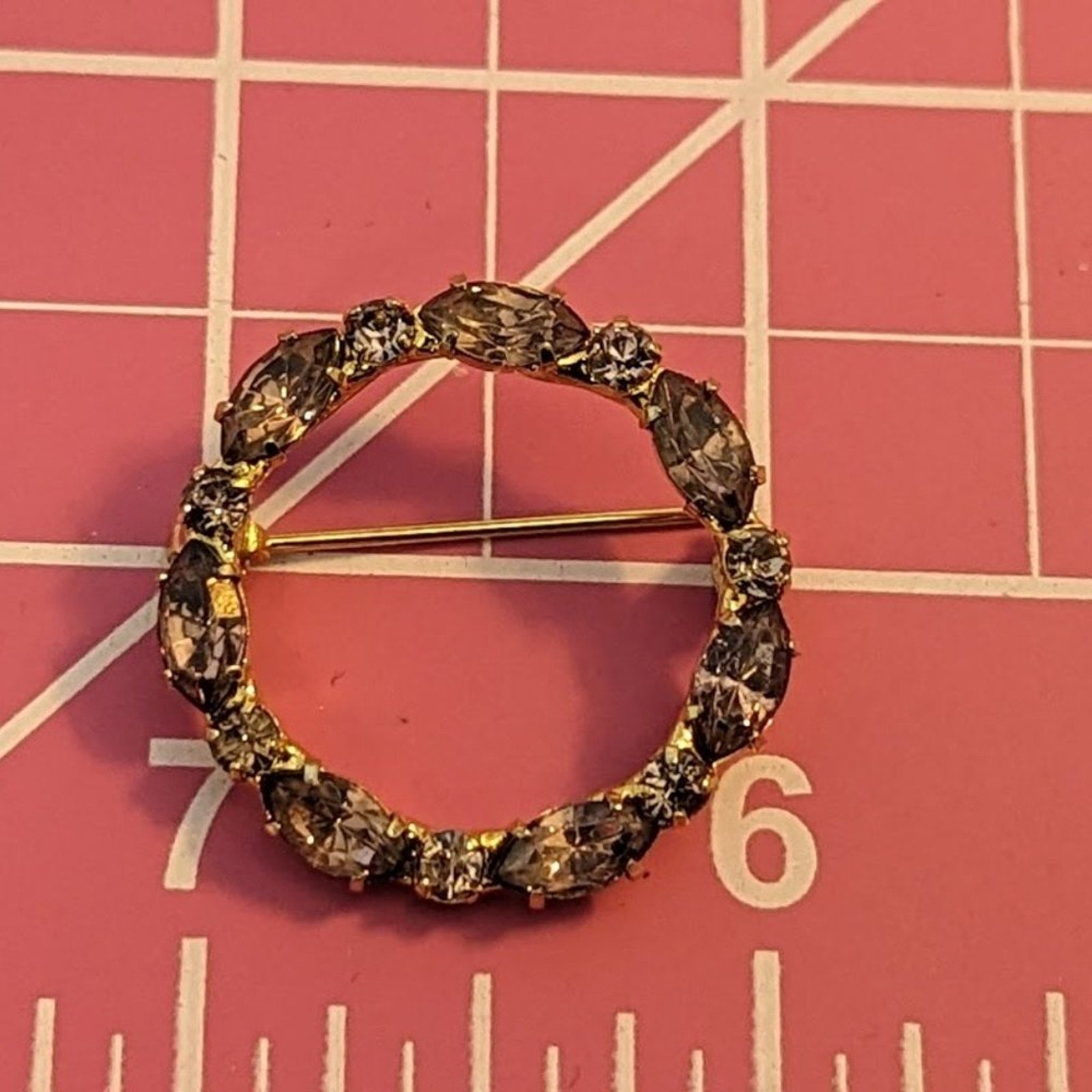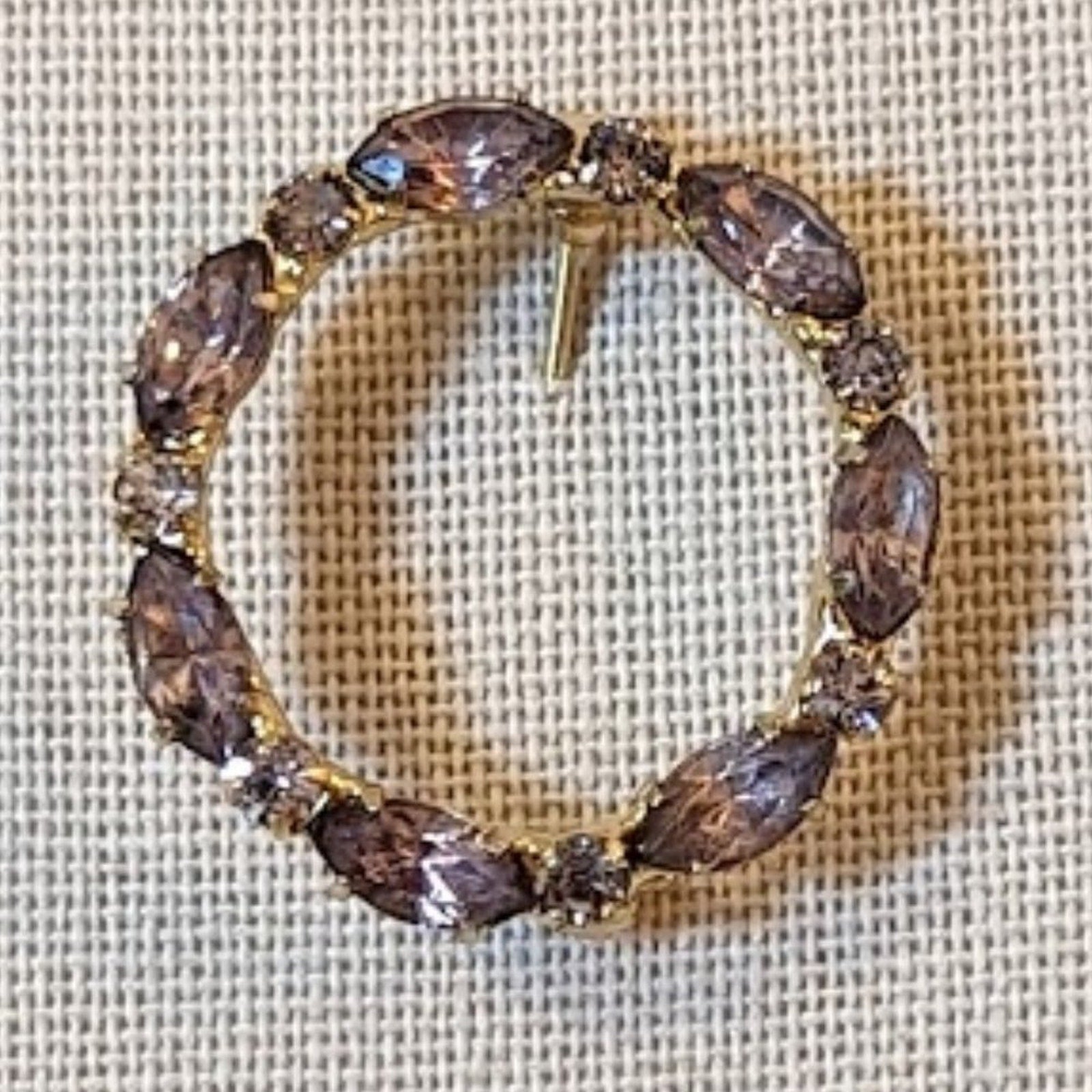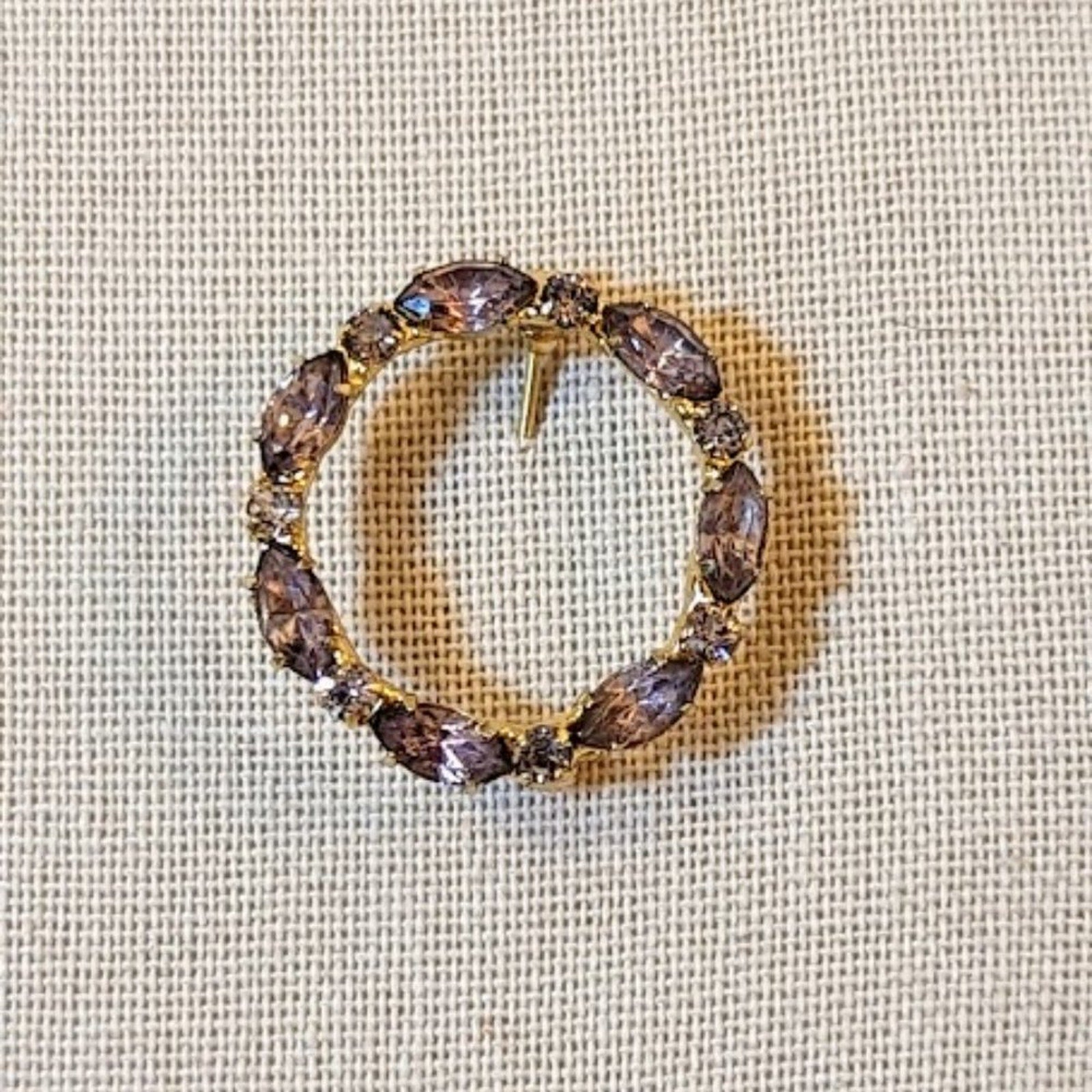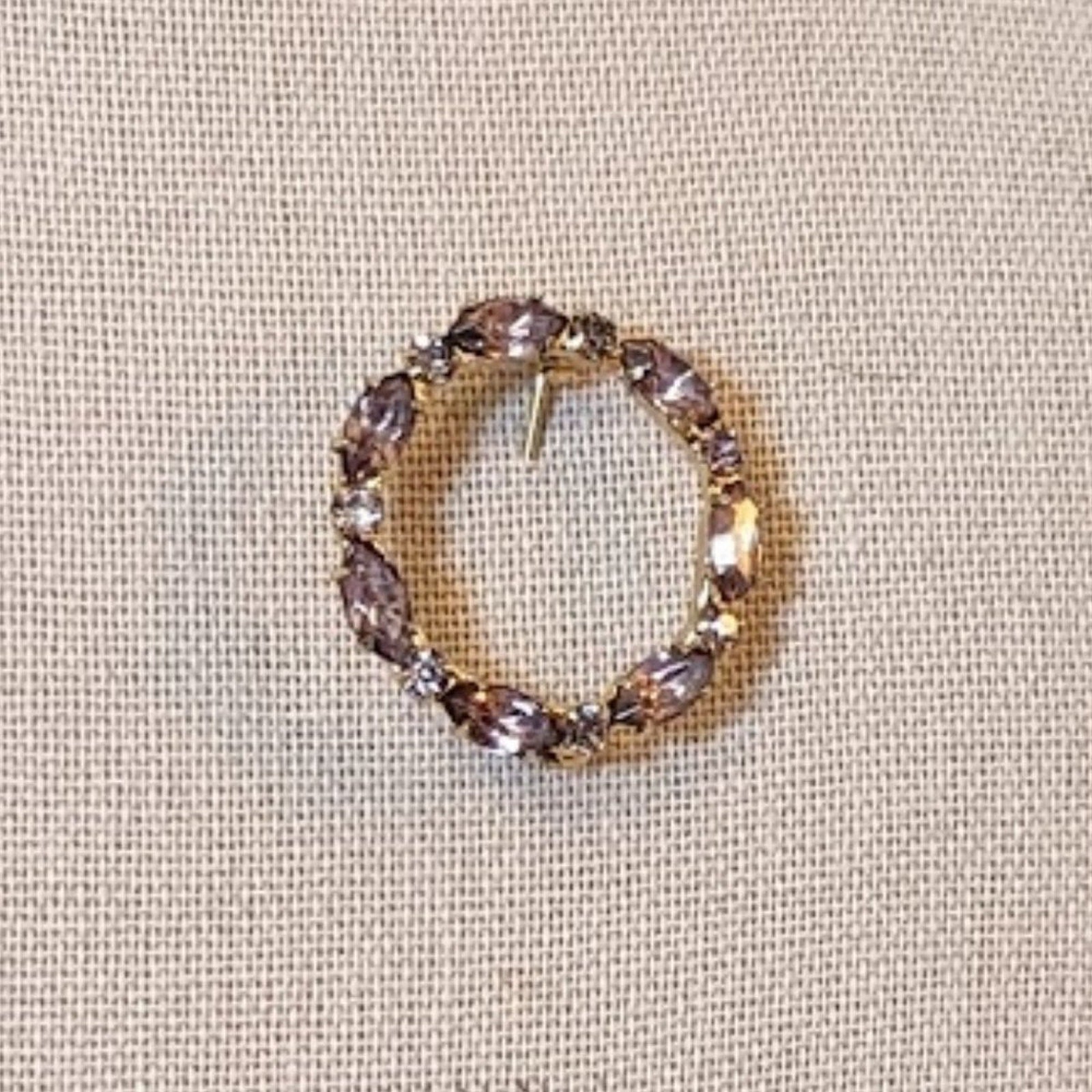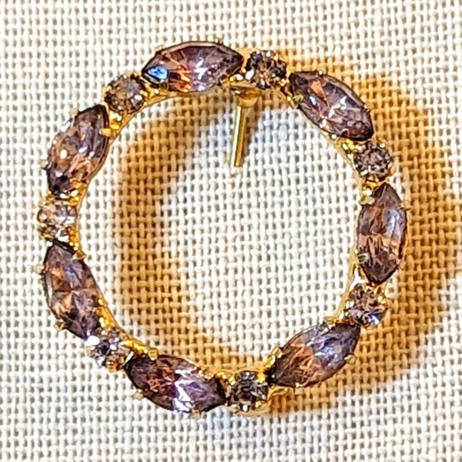 Vintage lavender crystal round gold tone brooch. All crystals present and prong set. No maker's mark, but this is well made. Pre-owned, this brooch is in great vintage condition. Bundle this with other items in my closet, and I'll give you a sweet deal!