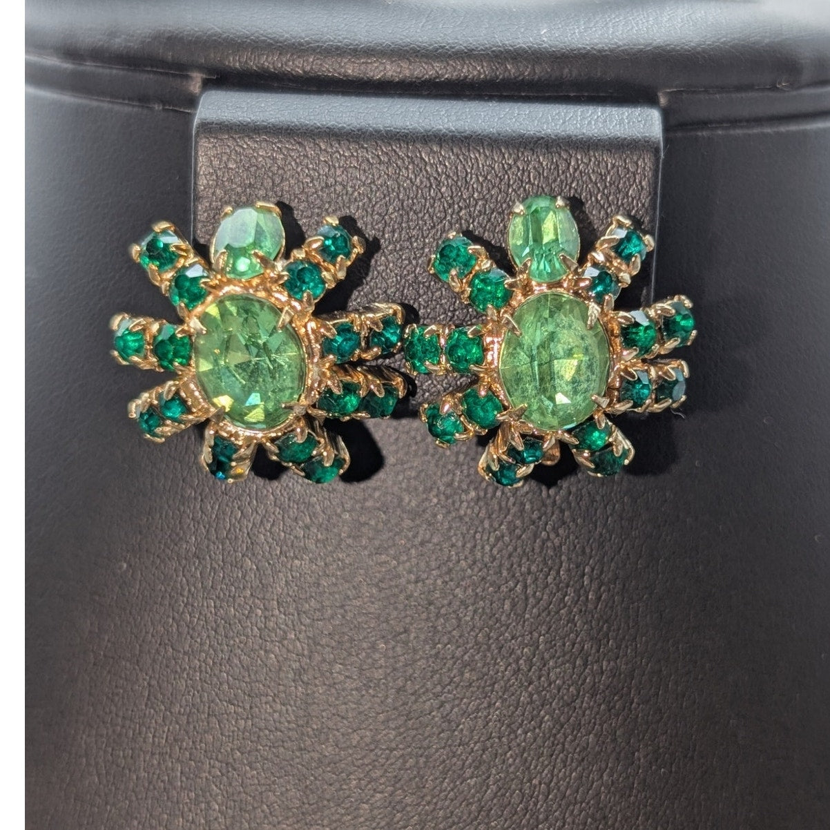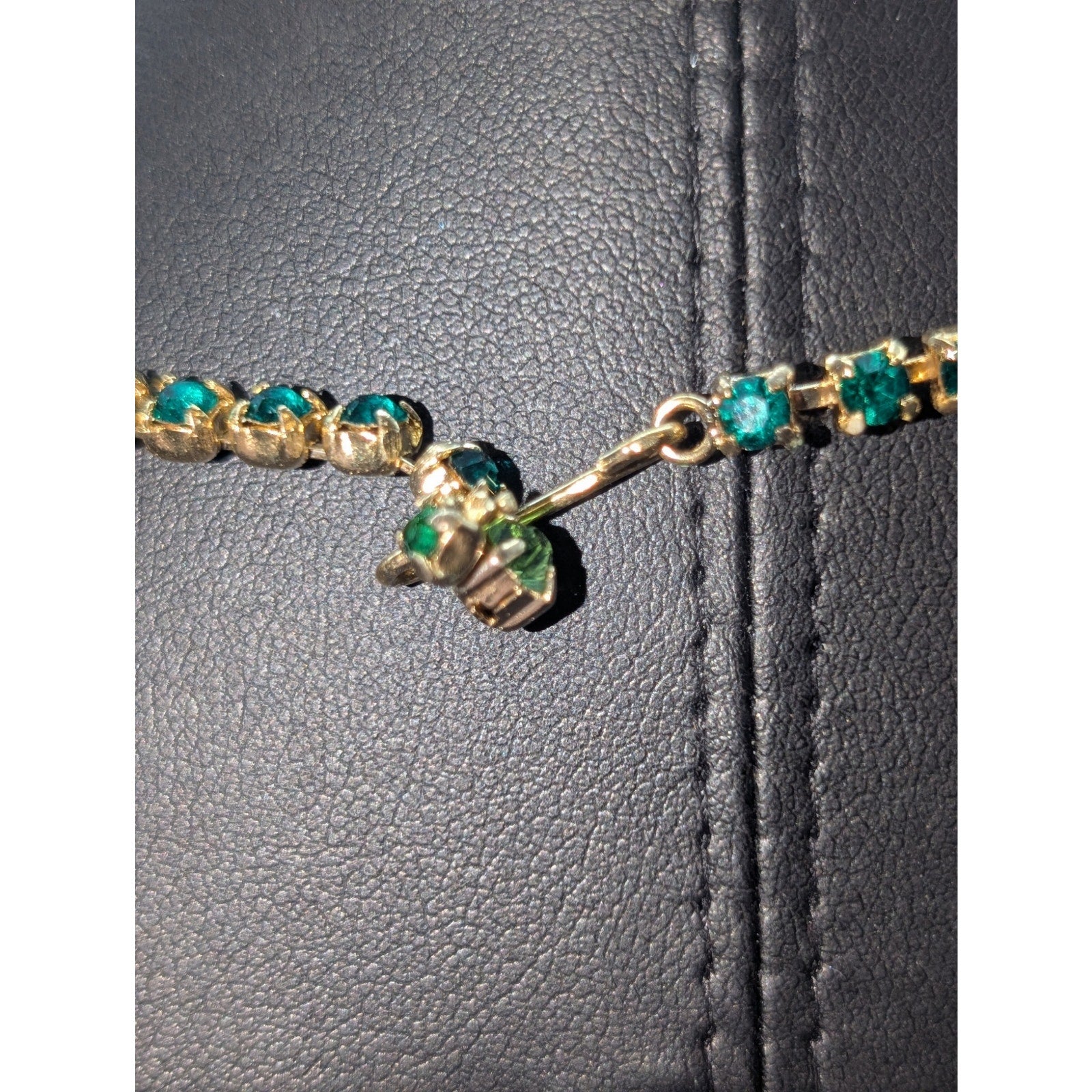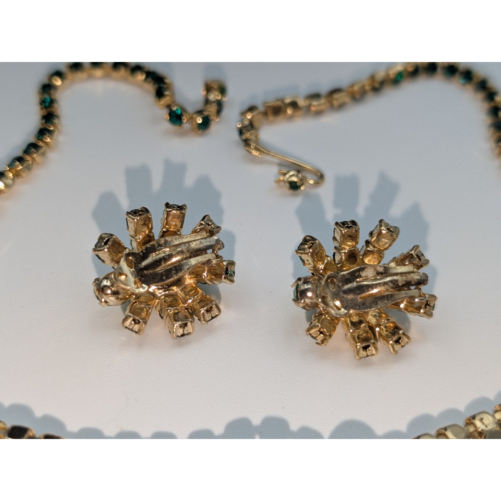 Vintage Light Green Dark Green Gold Tone 15.5" Necklace & Clip On Earring Set. Pre-owned, this green rhinestone jewelry set is in excellent vintage condition.