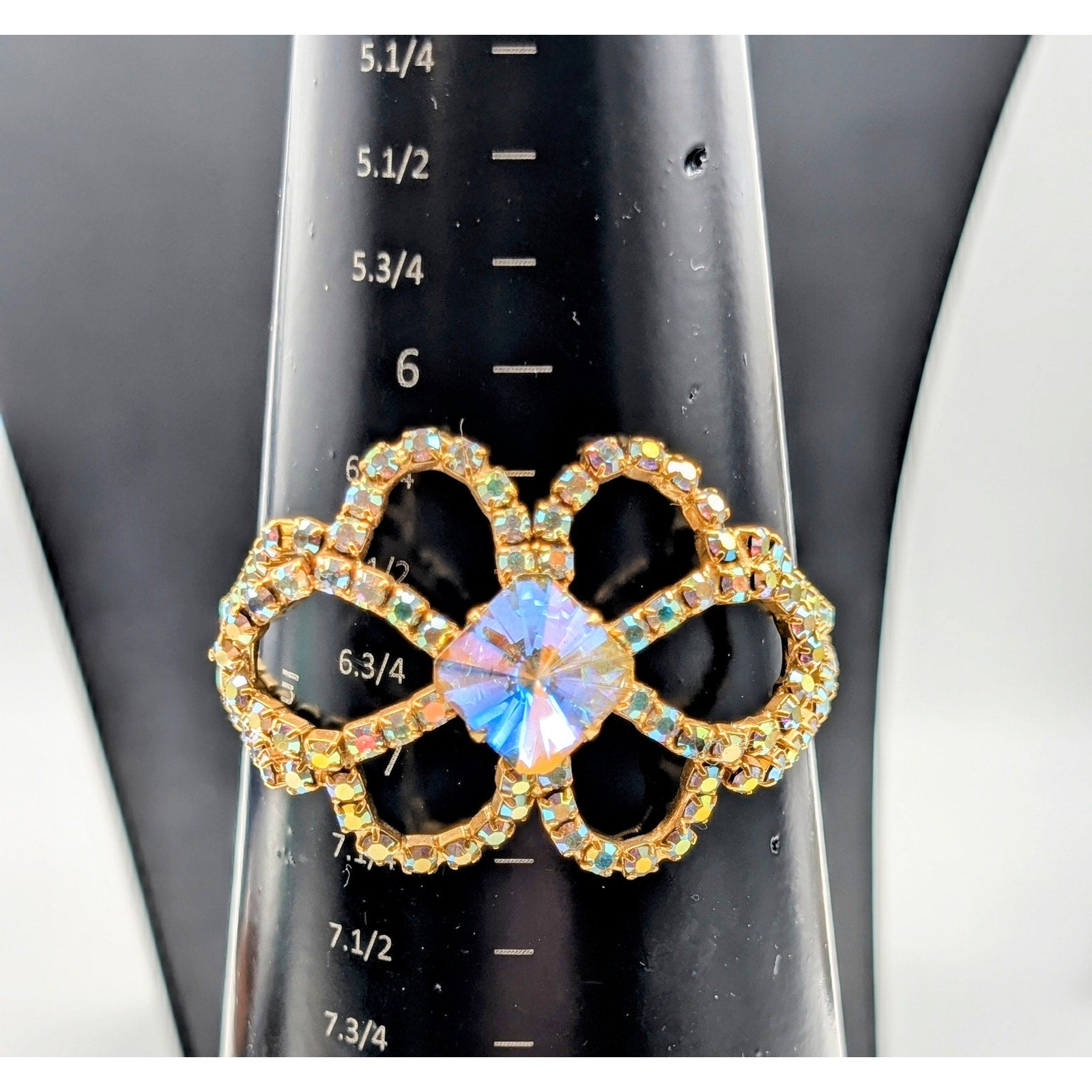 Vintage Mid-Century AB Crystal Rhinestone Gold Tone Bracelet W/ Safety Chain. Slide in clasp with safety chain will keep this securely on your wrist. Pre-owned, this bracelet is in excellent condition.