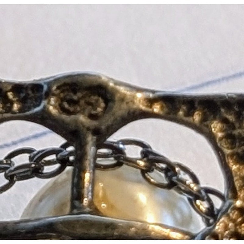 Vintage Modernist 14K 925 Open Basketweave Floating Pearl Pendant Necklace. It took me awhile to research this piece, but to the best of my knowledge the little hallmark on the side of the back was used by George Schuler & Company of Pleasantville, New York. Founded c.1908. Acquired by Krementz & Company in 1965. They made a lot of jewelry for Tiffany. I could be wrong, but I cannot find a piece like it. Pre-owned, this necklace is in excellent condition. I did not polish the silver leaving the patina on it and so as not to damage the pearl. I have not been able to find another one like it on the internet.