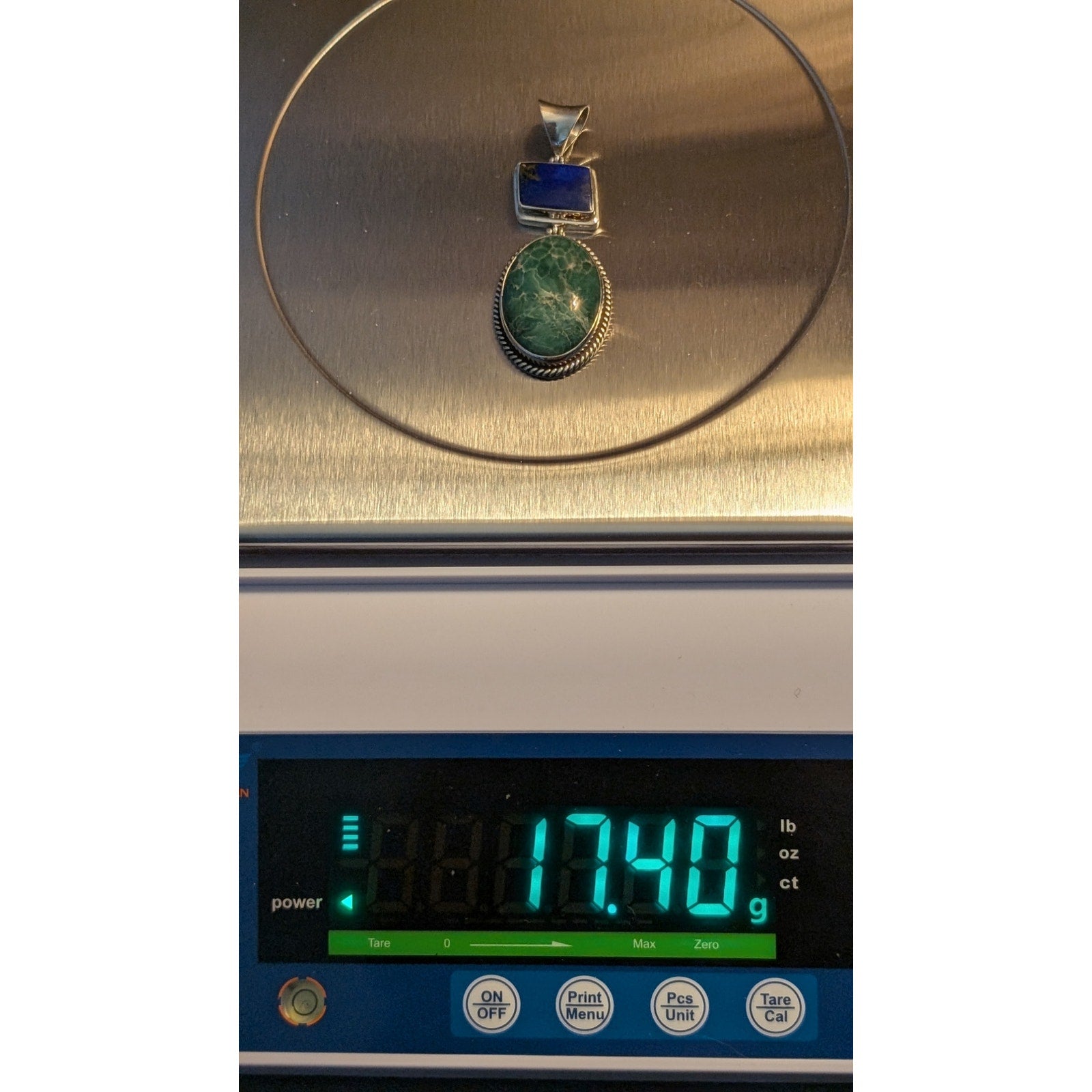Vintage Native American Green Marbled Stone & Blue Lapiz Hinged 925 Pendant. Gorgeous. Pre-owned, this vintage piece is in excellent condition.