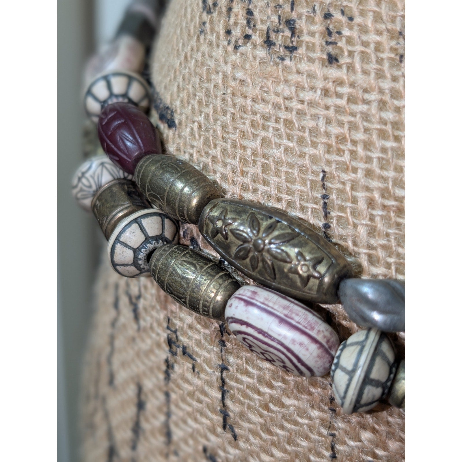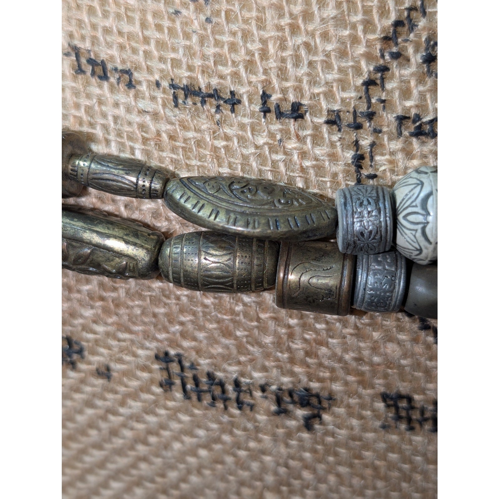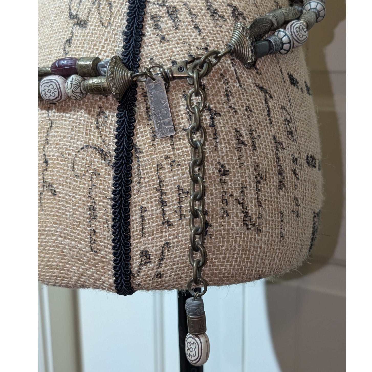 Vintage New York Studio Tribal Bead Double Strand Bronze Metal 33"-38" Belt. Pre-owned, this belt is in excellent vintage condition. The first place you can hook the belt is at the 33" point. When considering size, determine how much of a drape and dangle you want. The belt measures 38" in total length.