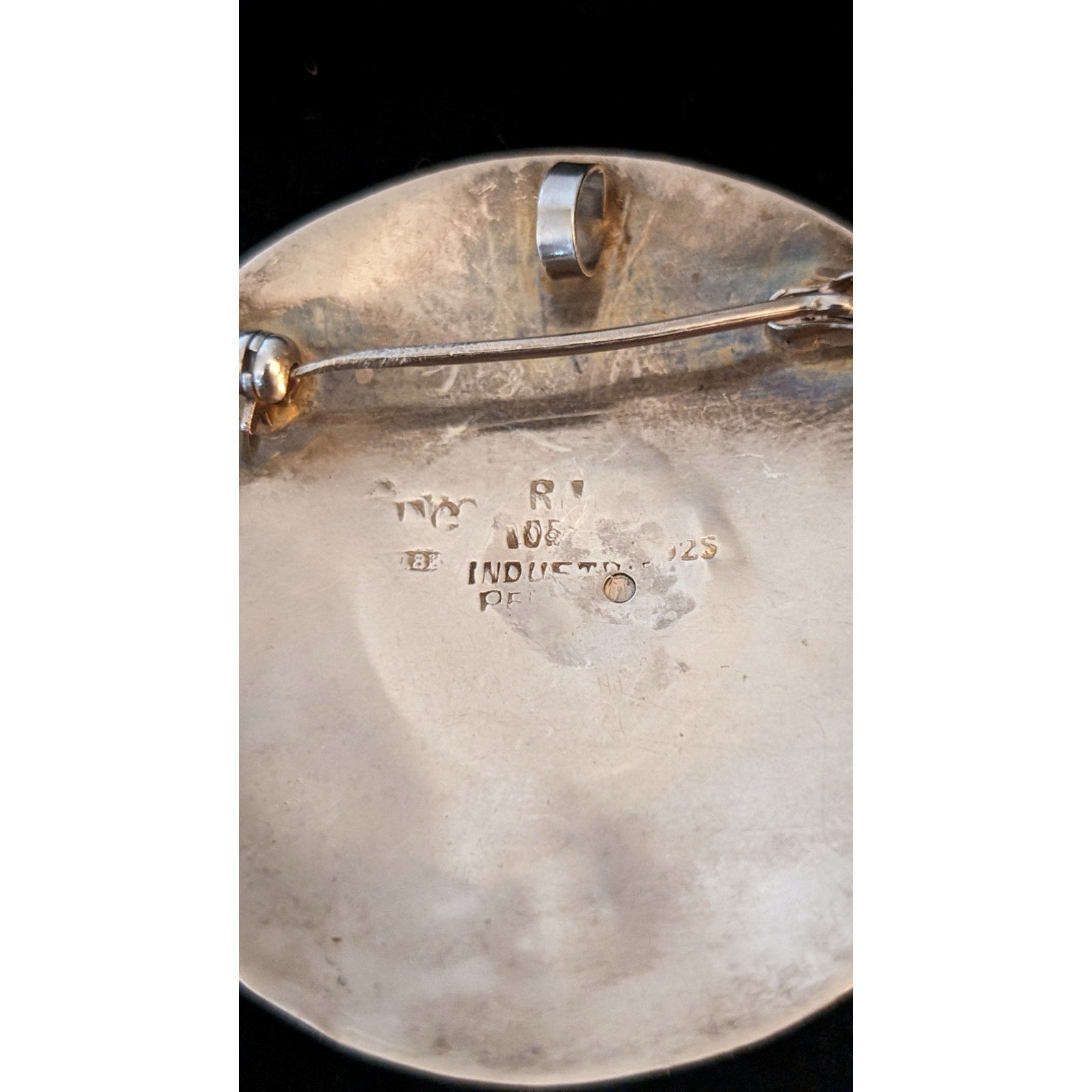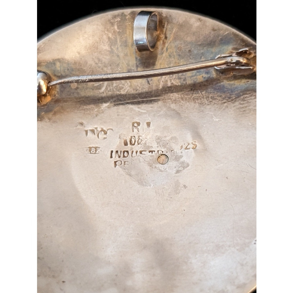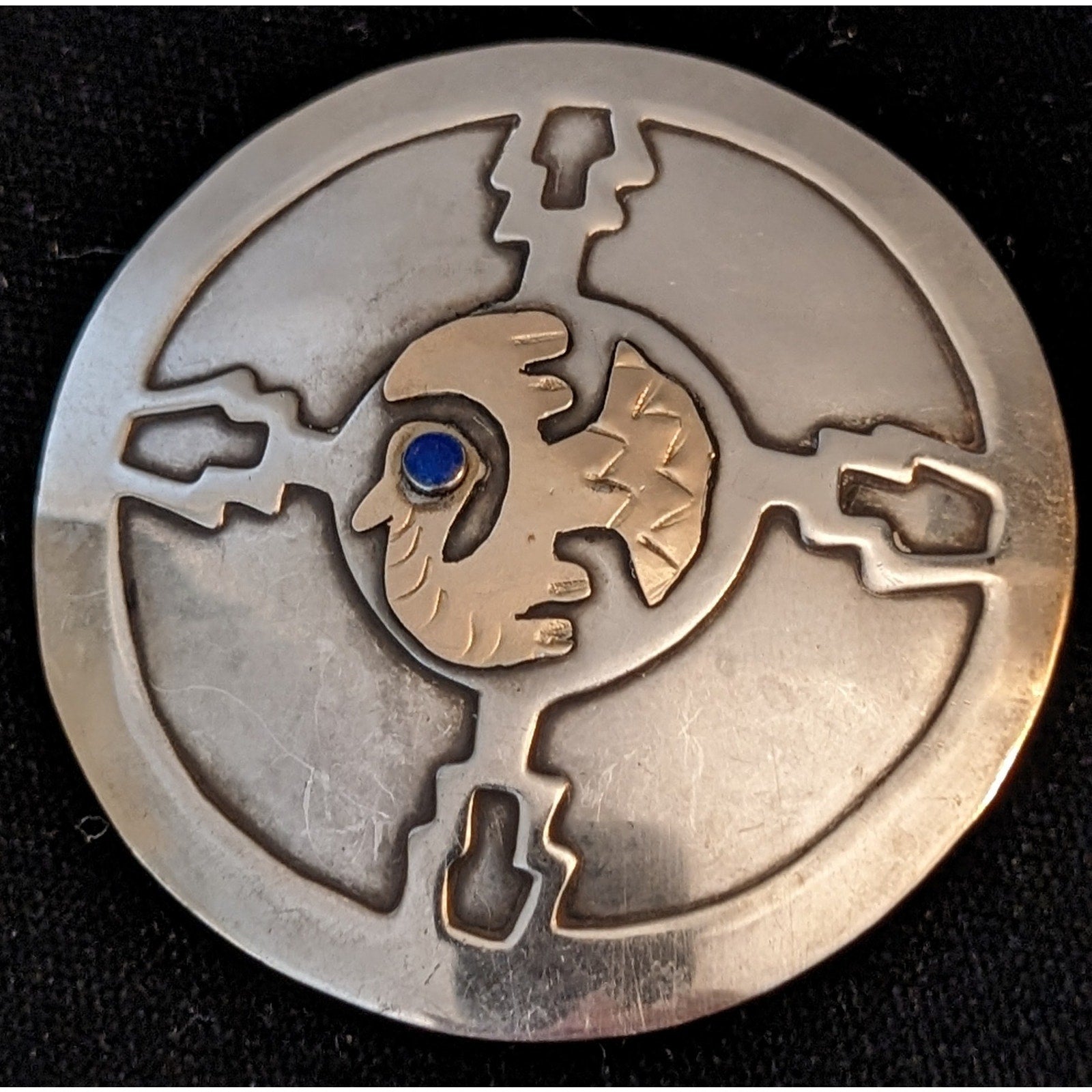 Vintage Peru 2" Round 925 Sterling Silver 18K Gold Turquoise Inca Bird Brooch/Pendant. Hand-crafted Mid-Century Peruvian brooch/pendant cast in sterling silver and 18K yellow gold. I can't read the maker hallmark. Pre-owned, this brooch is in excellent vintage condition.