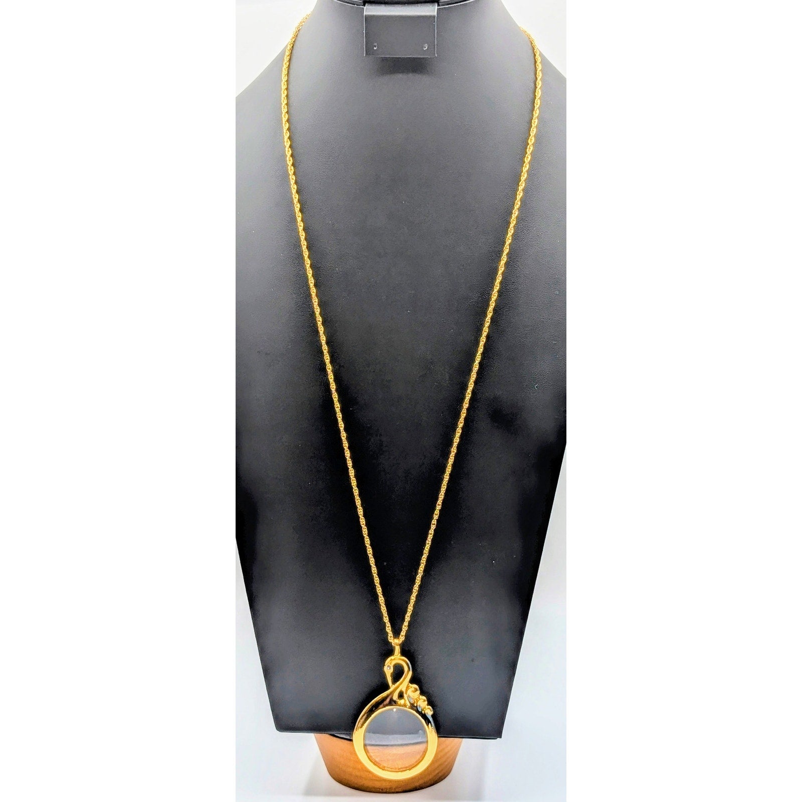 The pendant, made of yellow gold-plated metal and clear glass, remains in superb vintage condition, with only a few minor scratches on the glass. The magnifying glass is both decorative and practical—perfect for reading small print in style.