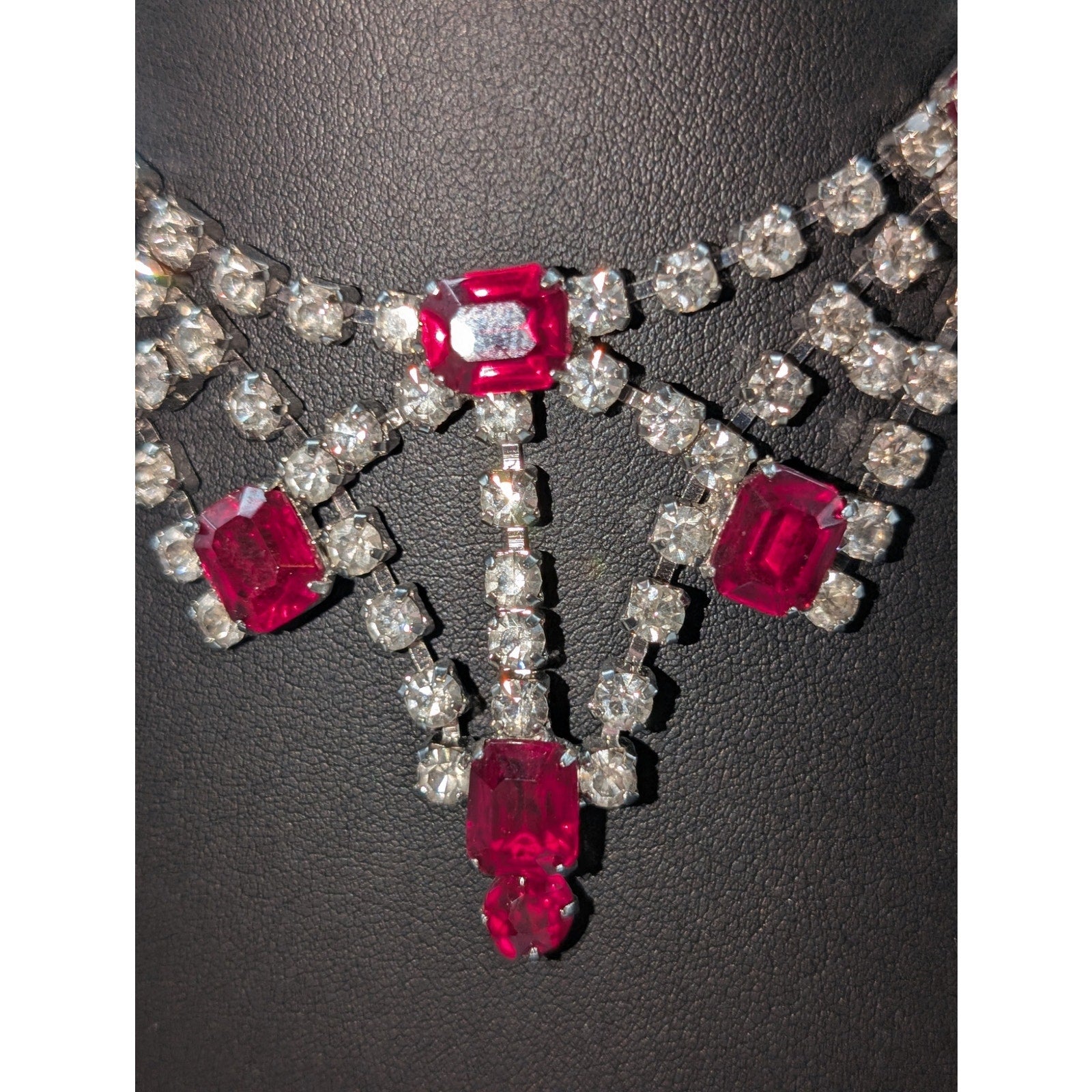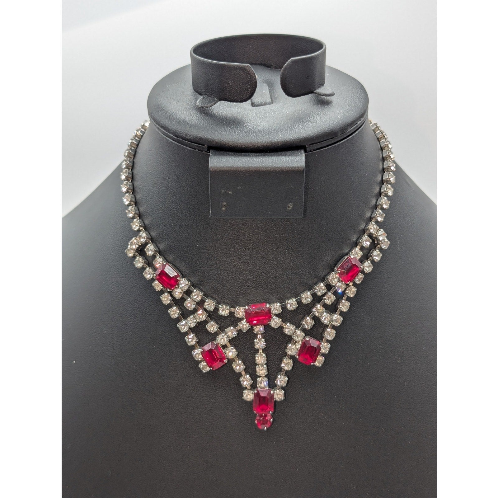 Vintage Red Ruby & Clear Rhinestone Collar Hook 15" Silver Tone Collar Necklace. Pre-owned, this necklace is in excellent vintage condition. Often, my photos are enlarged to show detail so you know exactly what you are purchasing. Photos are part of the description.