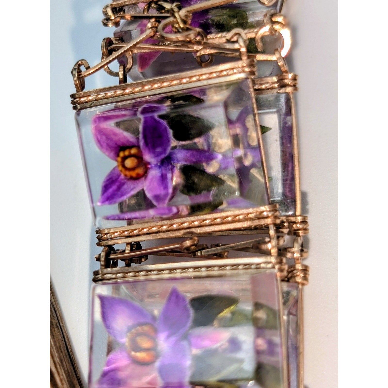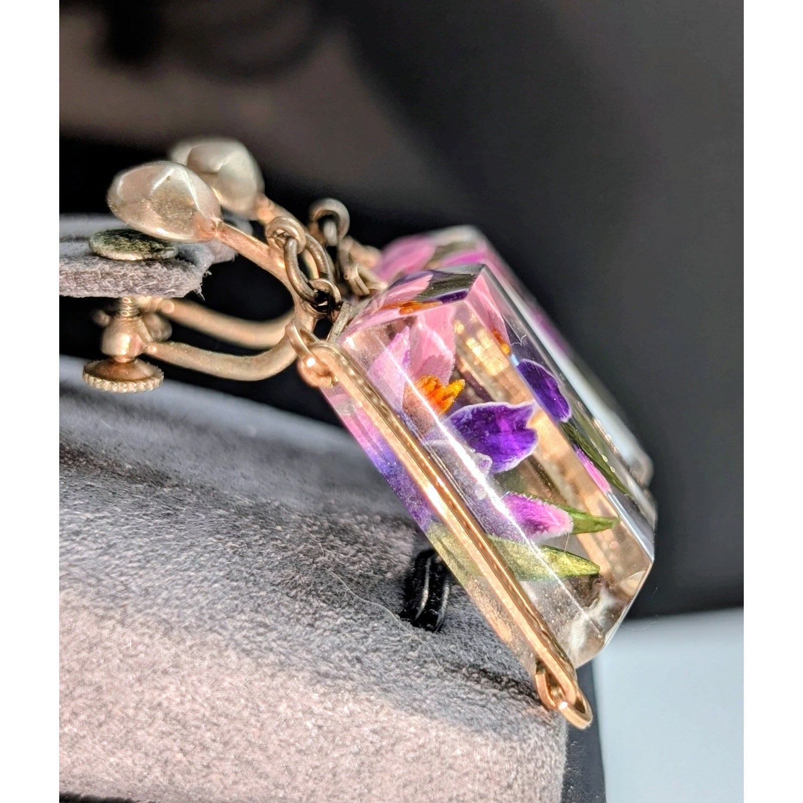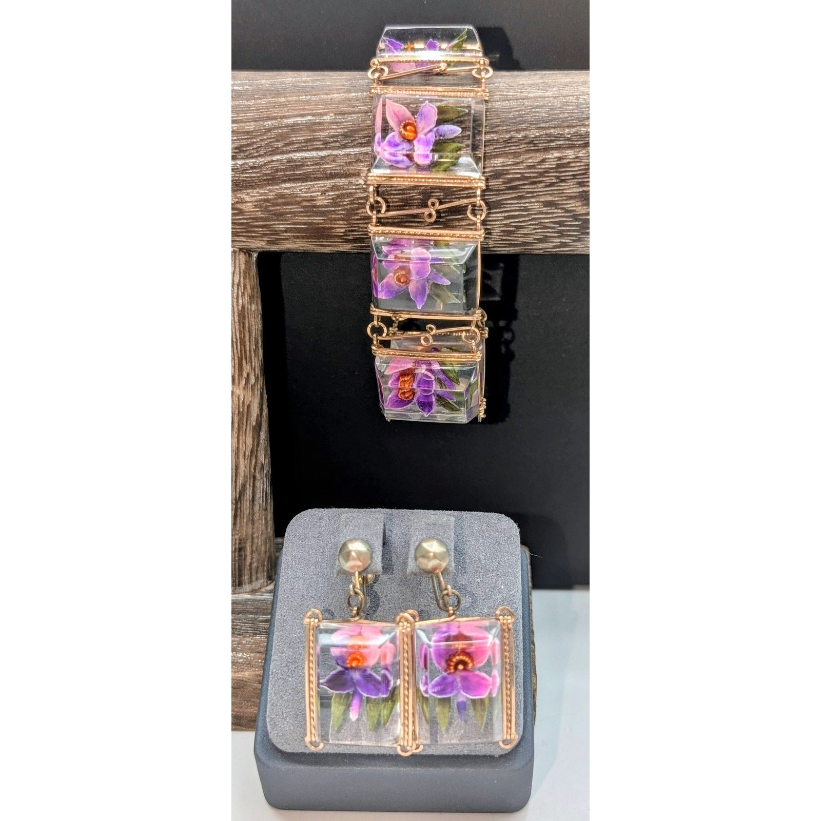 Vintage Reverse Carved Lucite Orchid Link Bracelet & Screw On Earring Set. Pre-owned, this bracelet and earring set is in excellent vintage condition. Probably from late 40s or 50s. Minor wear for age of jewelry. Bracelet measures 8".