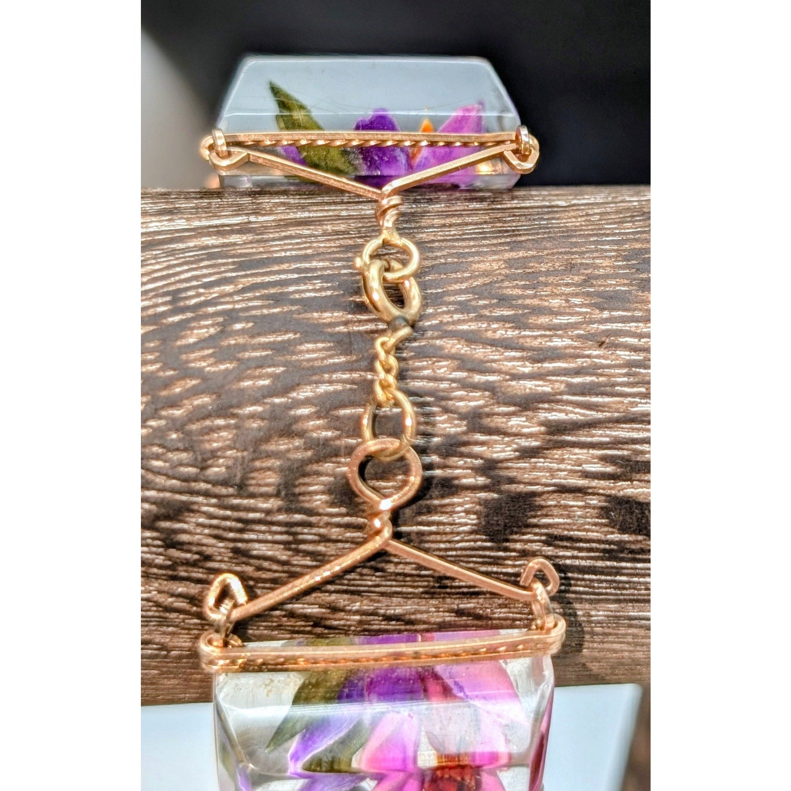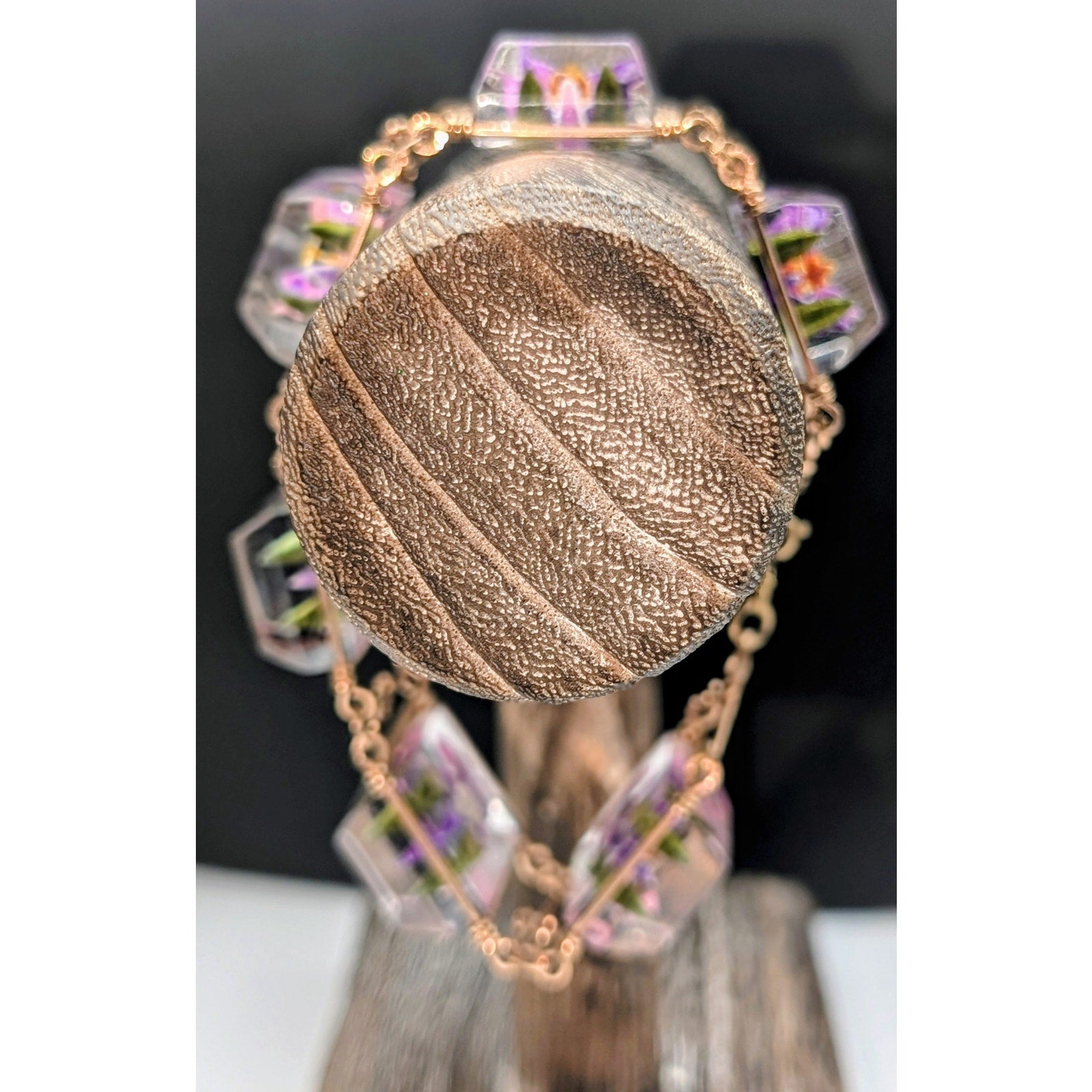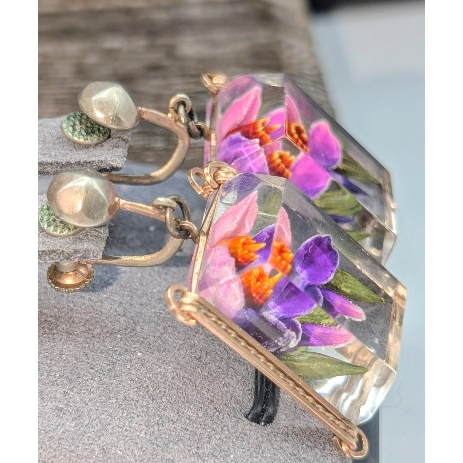 Vintage Reverse Carved Lucite Orchid Link Bracelet & Screw On Earring Set. Pre-owned, this bracelet and earring set is in excellent vintage condition. Probably from late 40s or 50s. Minor wear for age of jewelry. Bracelet measures 8".