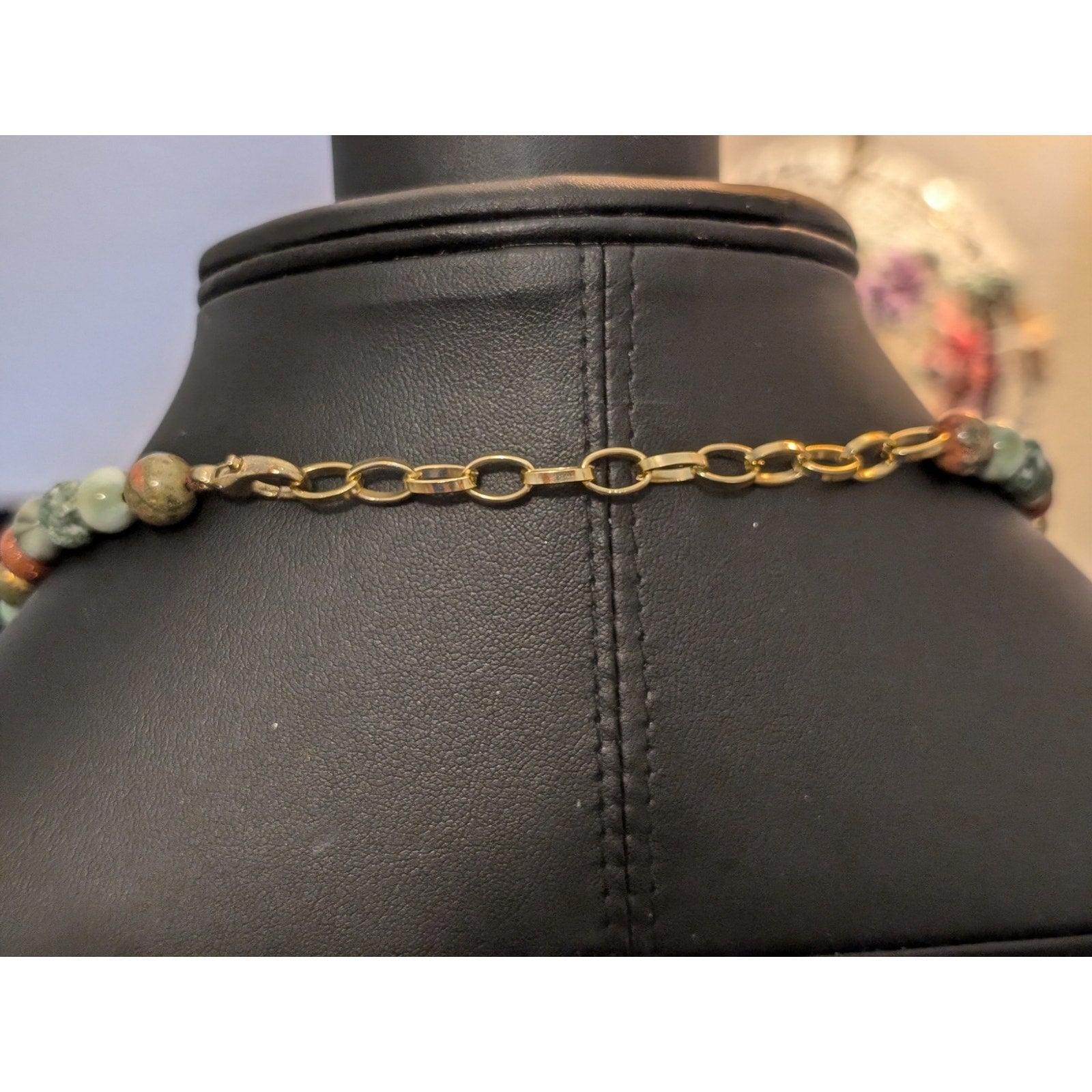 Vintage Rhodonite & Gold Stone Multi-Gemstone Graduated 18.5" - 21.5" Necklace. So lovely for your Fall wardrobe with warm earthtones and a hint of glitter in the gold stones. Greens and browns and gold tone metal. This would be a fabulous accessory to dress up some camo in your wardrobe or to wear with your loden green. Pre-owned, this necklace is in excellent vintage condition. Large lobster claw clasp and nice extender chain.