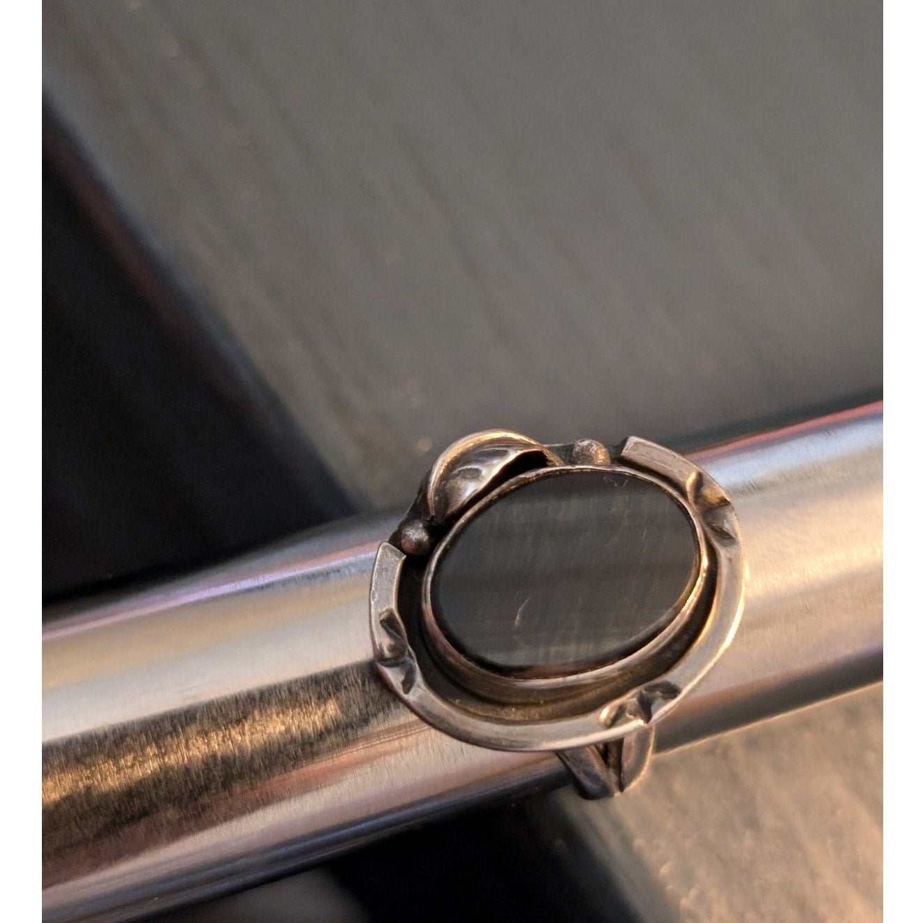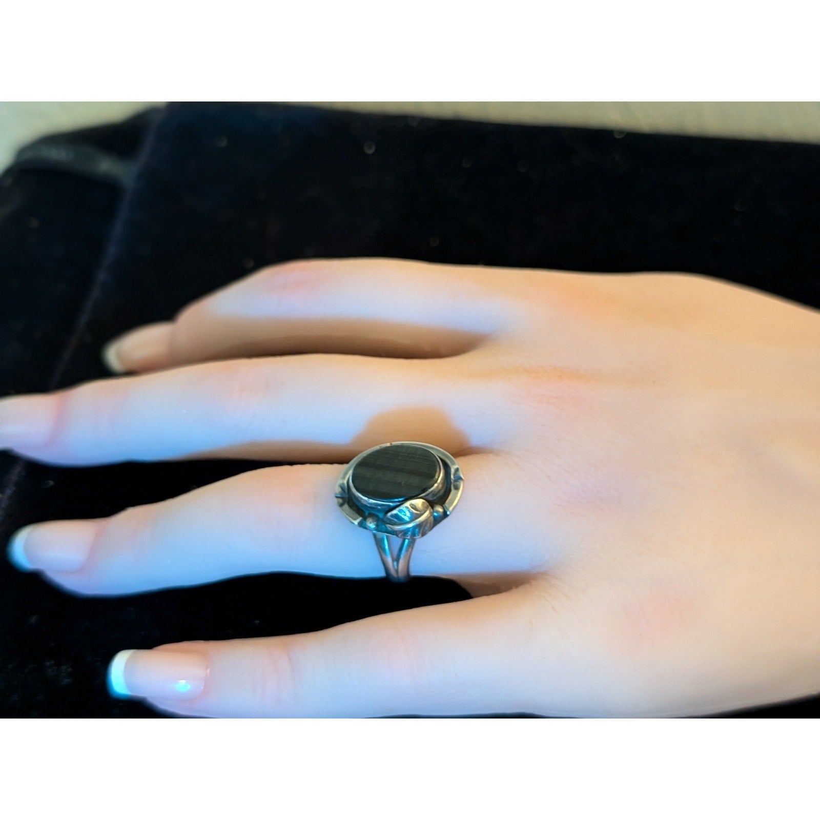 Vintage Signed GF15 Sterling Mexico Black Stone Native American Ring Size 6.5. Pre-owned, this ring is in excellent condition. I tried to show in the photos the lines in this black stone which gives it a real sheen when looking at it straight on. Lovely, well-made ring.
