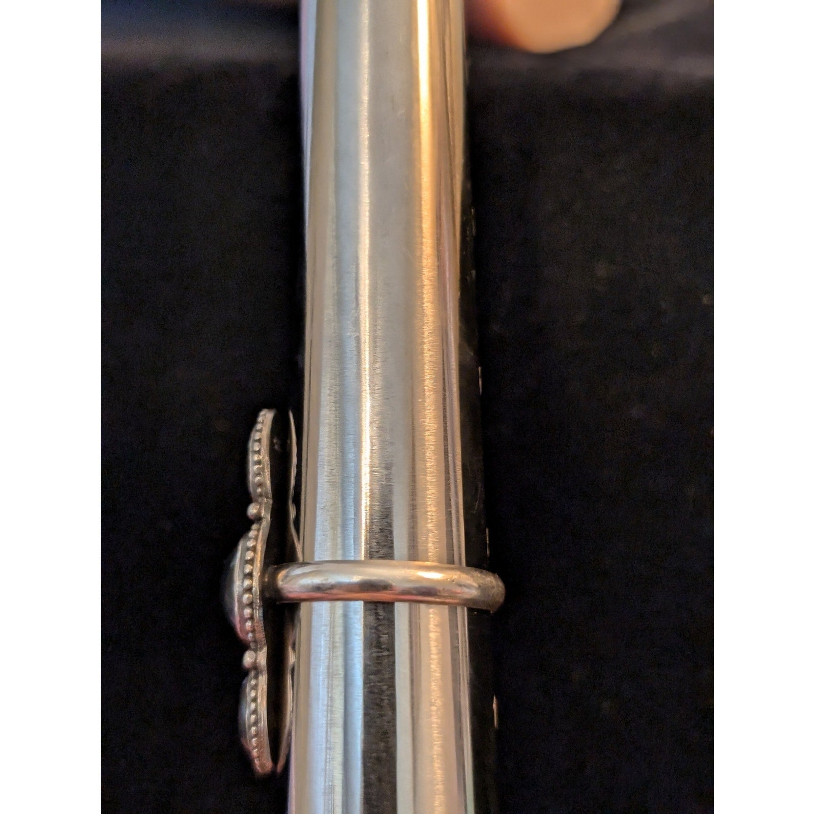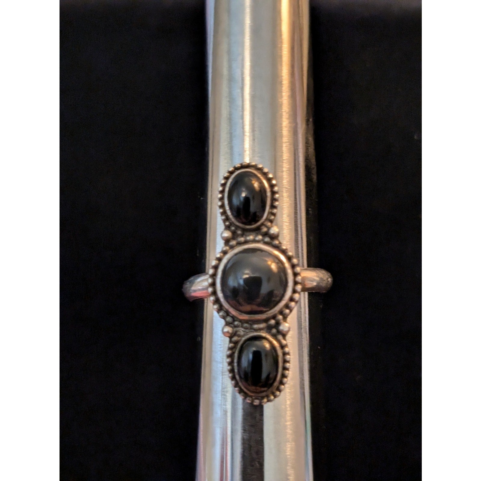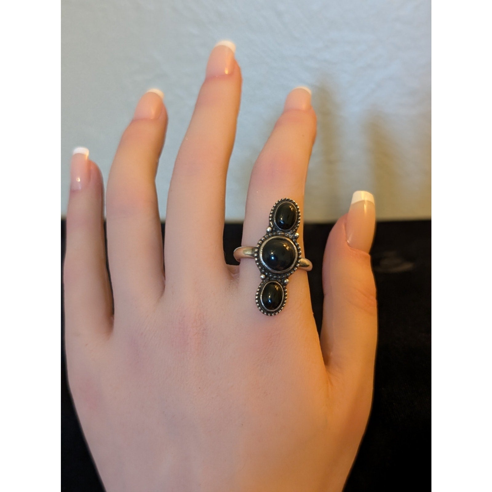 Vintage Signed Navajo 925 Sterling Silver Three Black Onyx Vertically Set Stone Ring Size 9.25. Pre-owned, this ring is in excellent vintage condition.