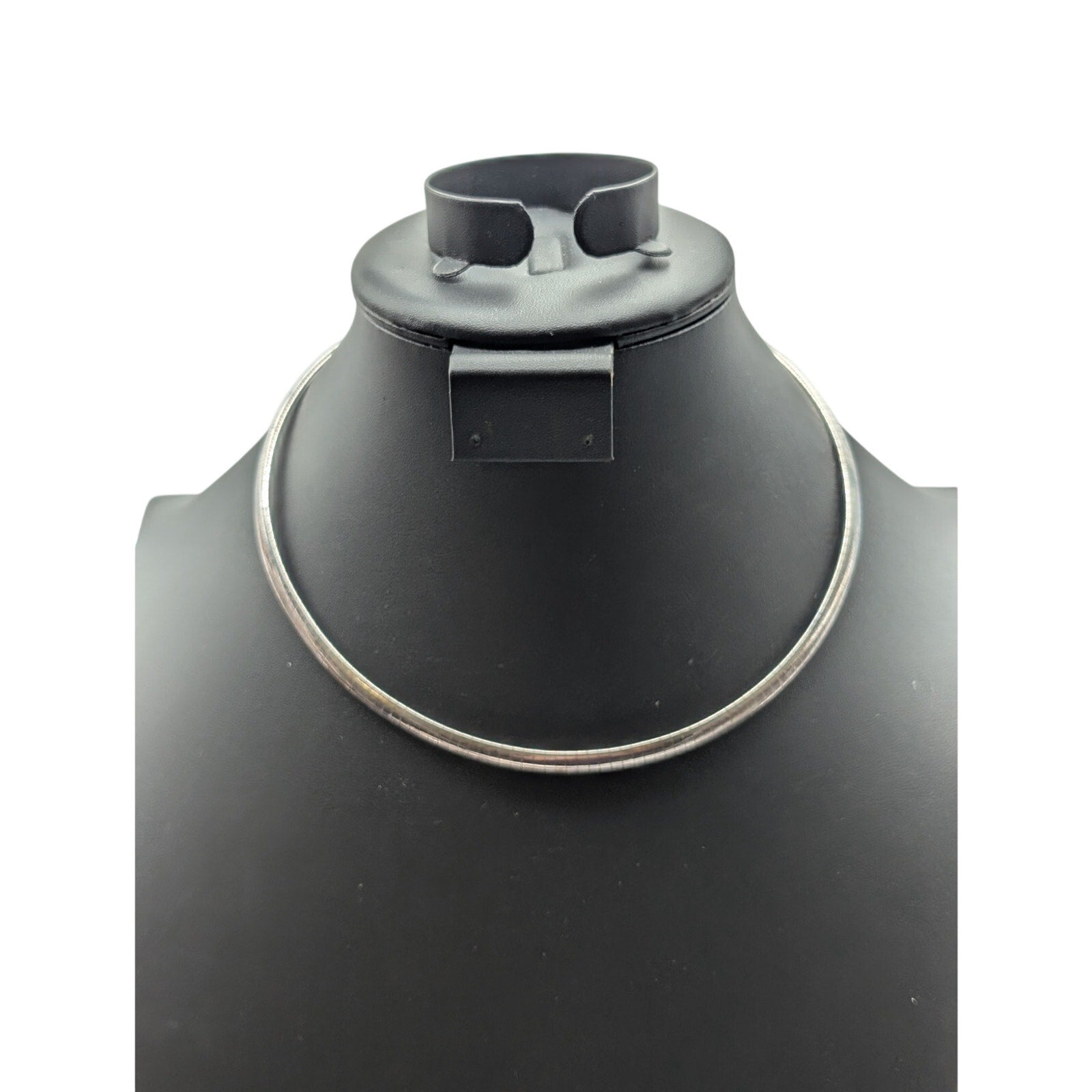 Vintage Silver Tone Omega Fold Over Clasp Necklace. Approximately 16" round and 1/4" wide. Pre-owned, this omega necklace is in good vintage condition.