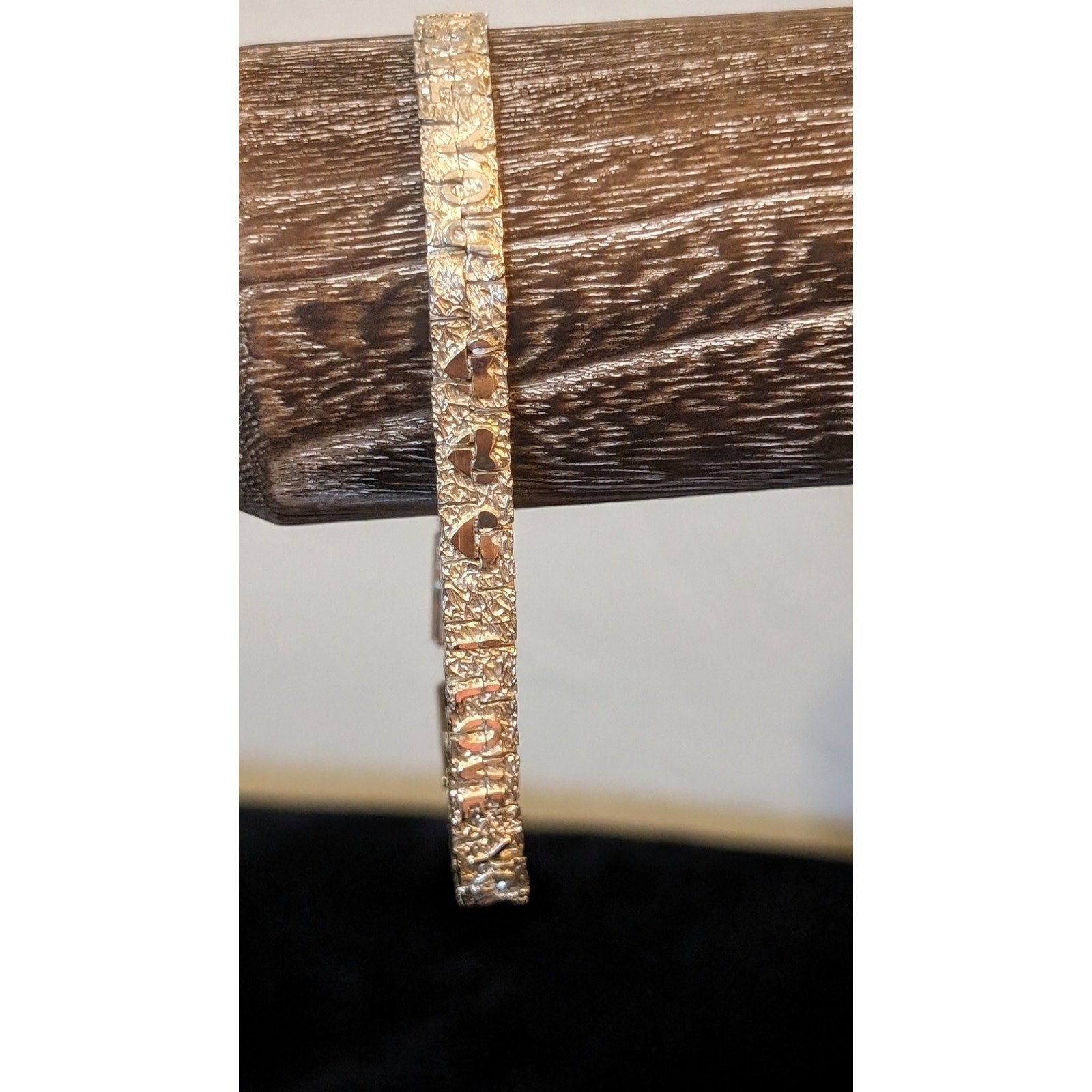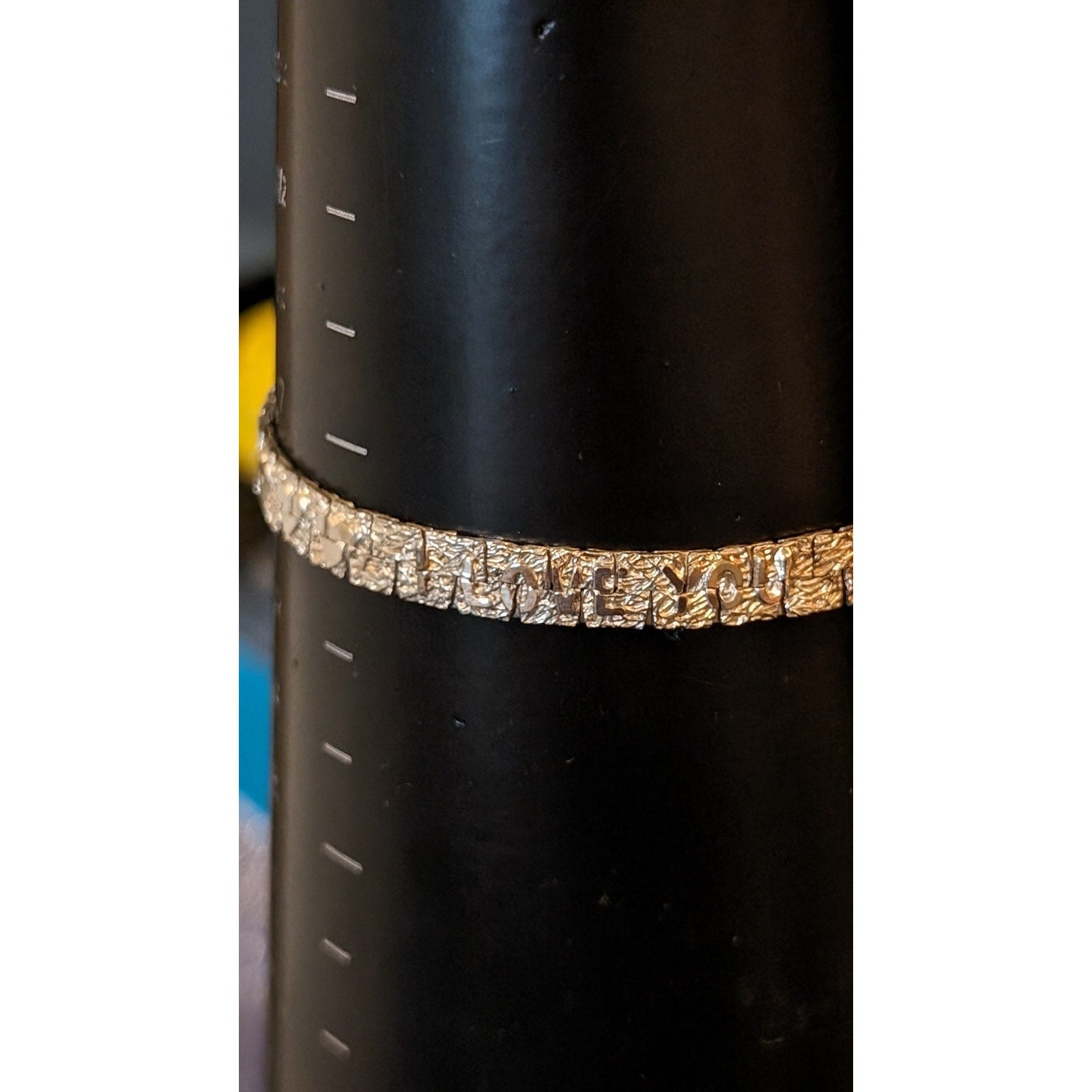 Vintage Silver Tone Silver Nugget 'I Love You' Bracelet W/ Fold Over Clasp. Measures 1/4" wide. Pre-owned, this vintage piece is in great condition.