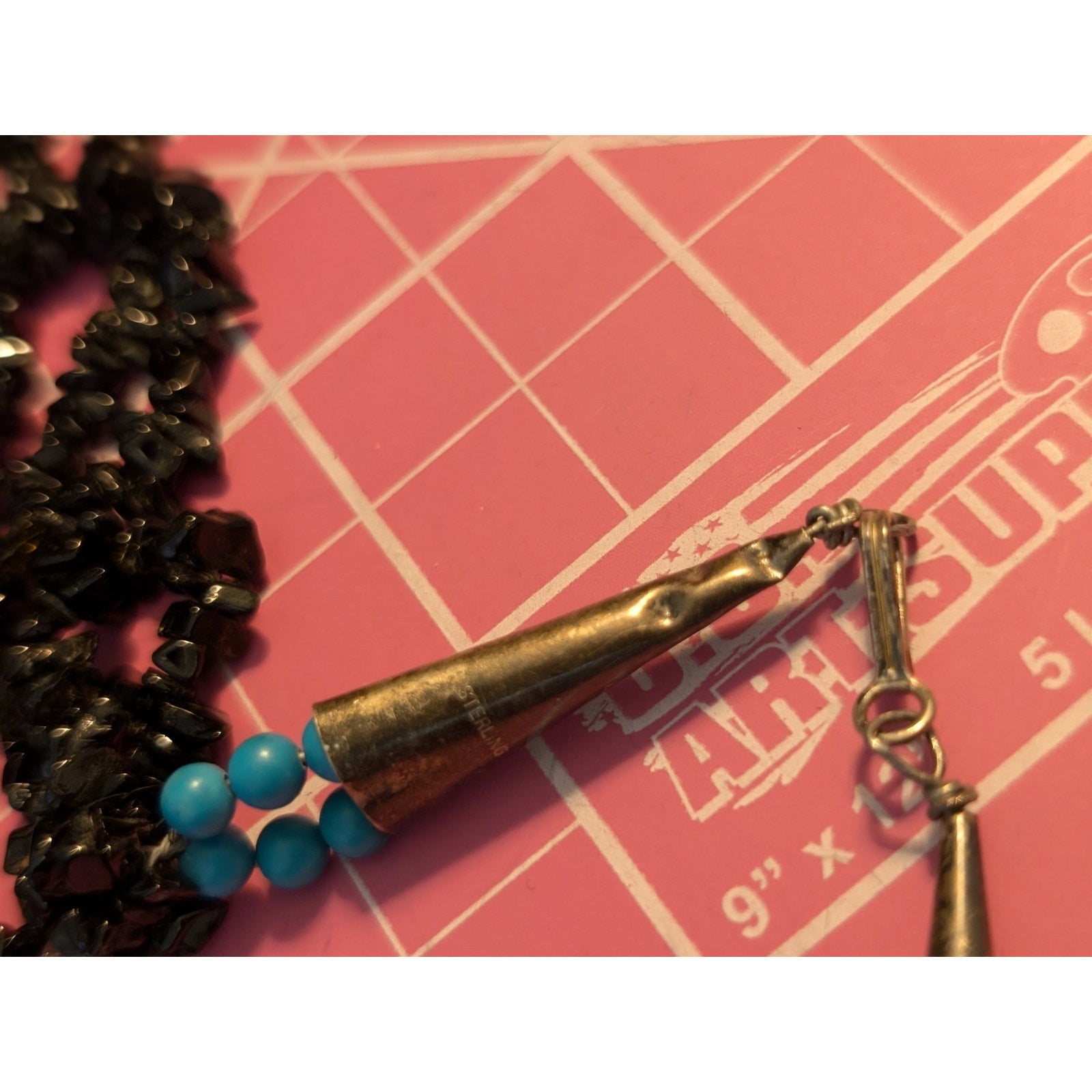 Vintage Southwest 4-Strand Black Stone Chip Bead Necklace W/ Sterling Cone Ends