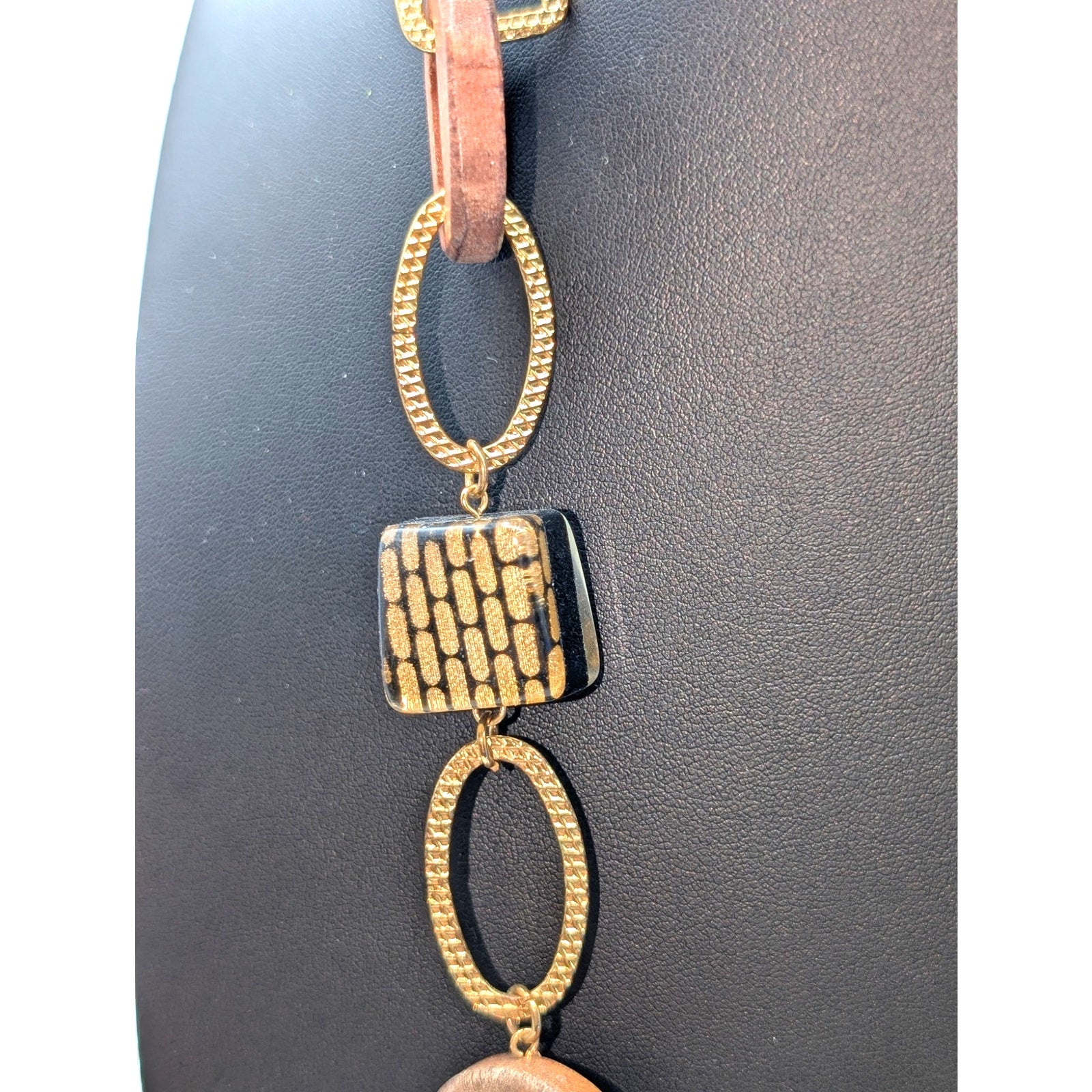 Vintage Thick Sparkle Gold 'Brick' Lucite Wooden Disk Gold Tone Chain 34" Necklace. Pre-owned, this necklace is in great vintage condition. Looks great as a wear alone piece or layered with others.