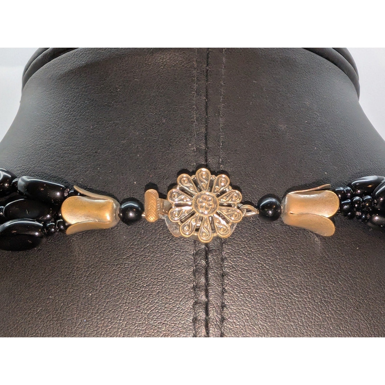 Vintage Three Strand Black Glass Beaded Slide In Fancy Clasp Necklace. Pre-owned, this necklace is in great vintage condition.