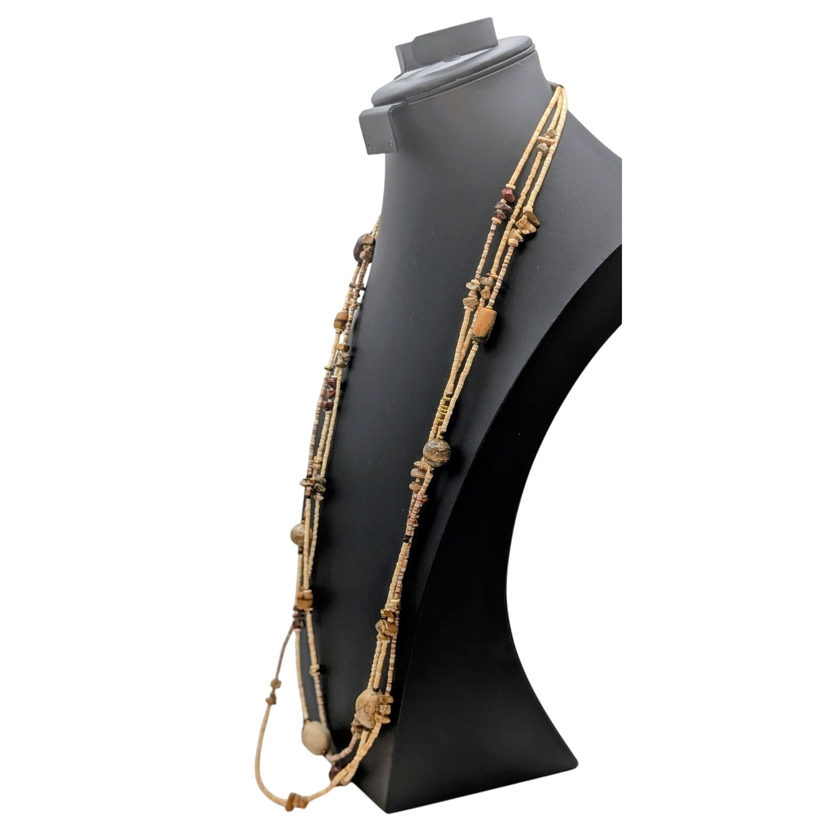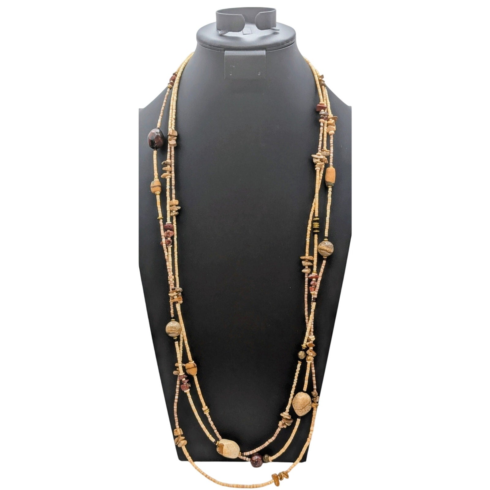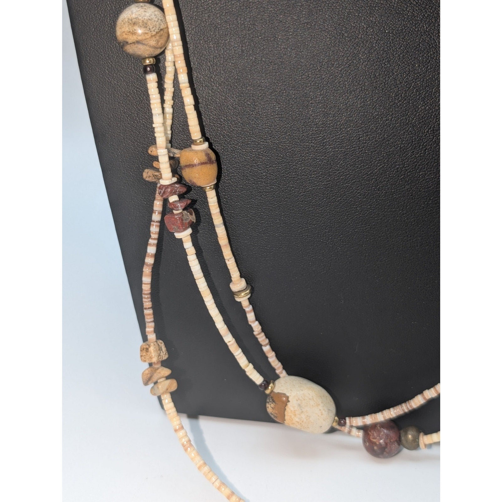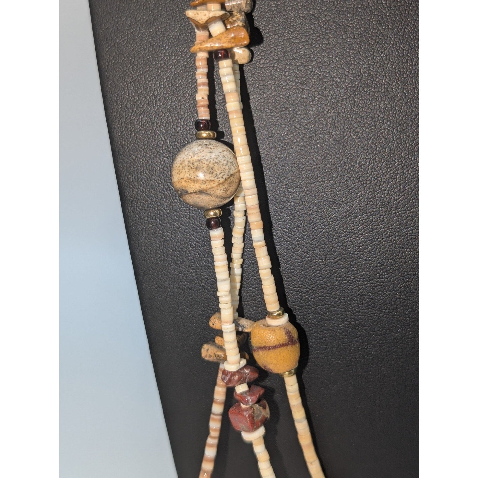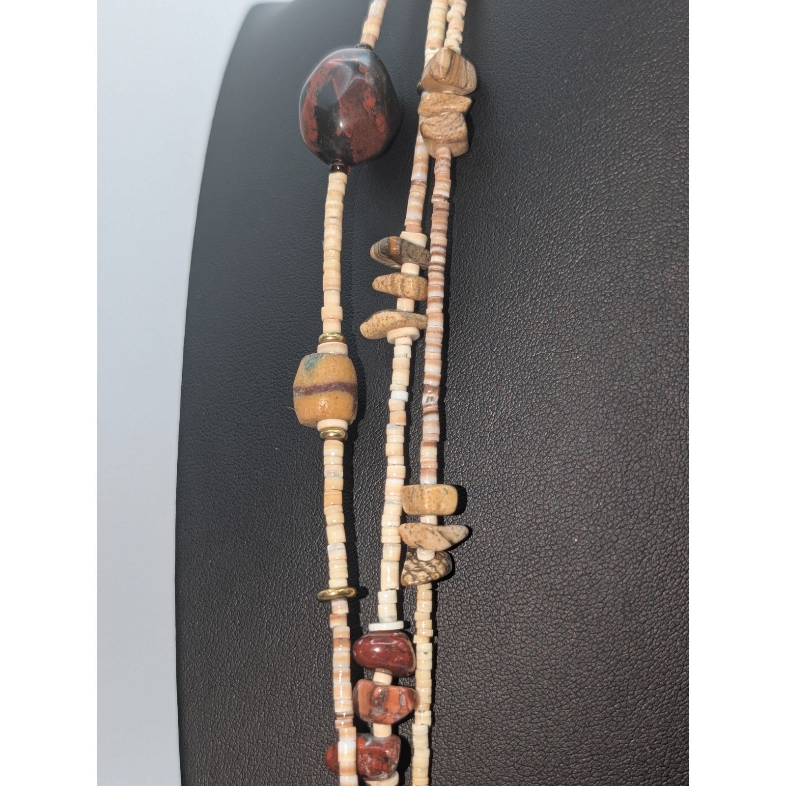 Vintage Three Strand Tiny Heishi Shell Bead Jasper Stone Station Long Necklace