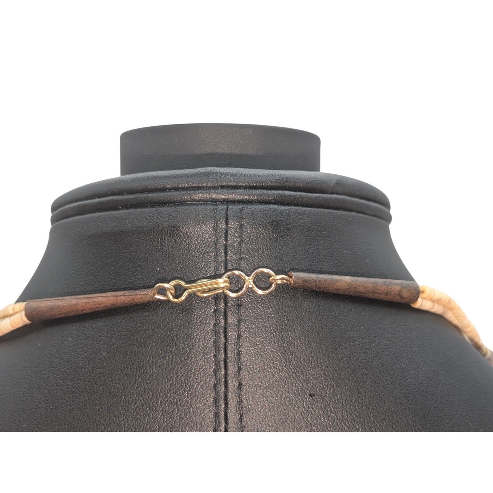 Vintage Three Strand Tiny Heishi Shell Bead Jasper Stone Station Long Necklace. Approximately 36" on the shortest strand. Gorgeous neutral colors. Hook clasp. Bugle end cap beads have a nice bronze patina. Gold tone clasp and small spacer beads. Pre-owned, this necklace is in excellent condition.
