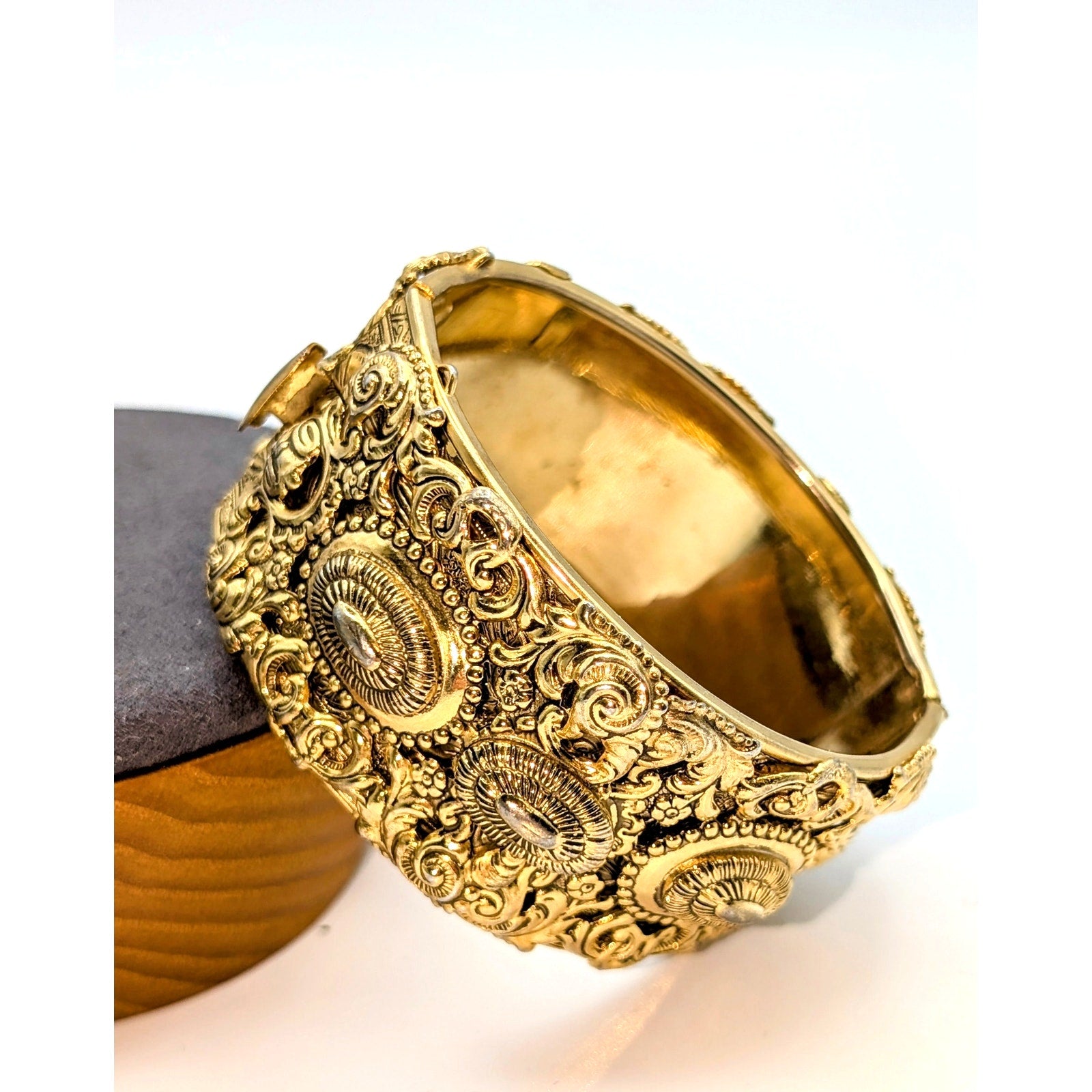 Vintage Victorian Revival Repousse Hinged Gold Tone Estate Bangle