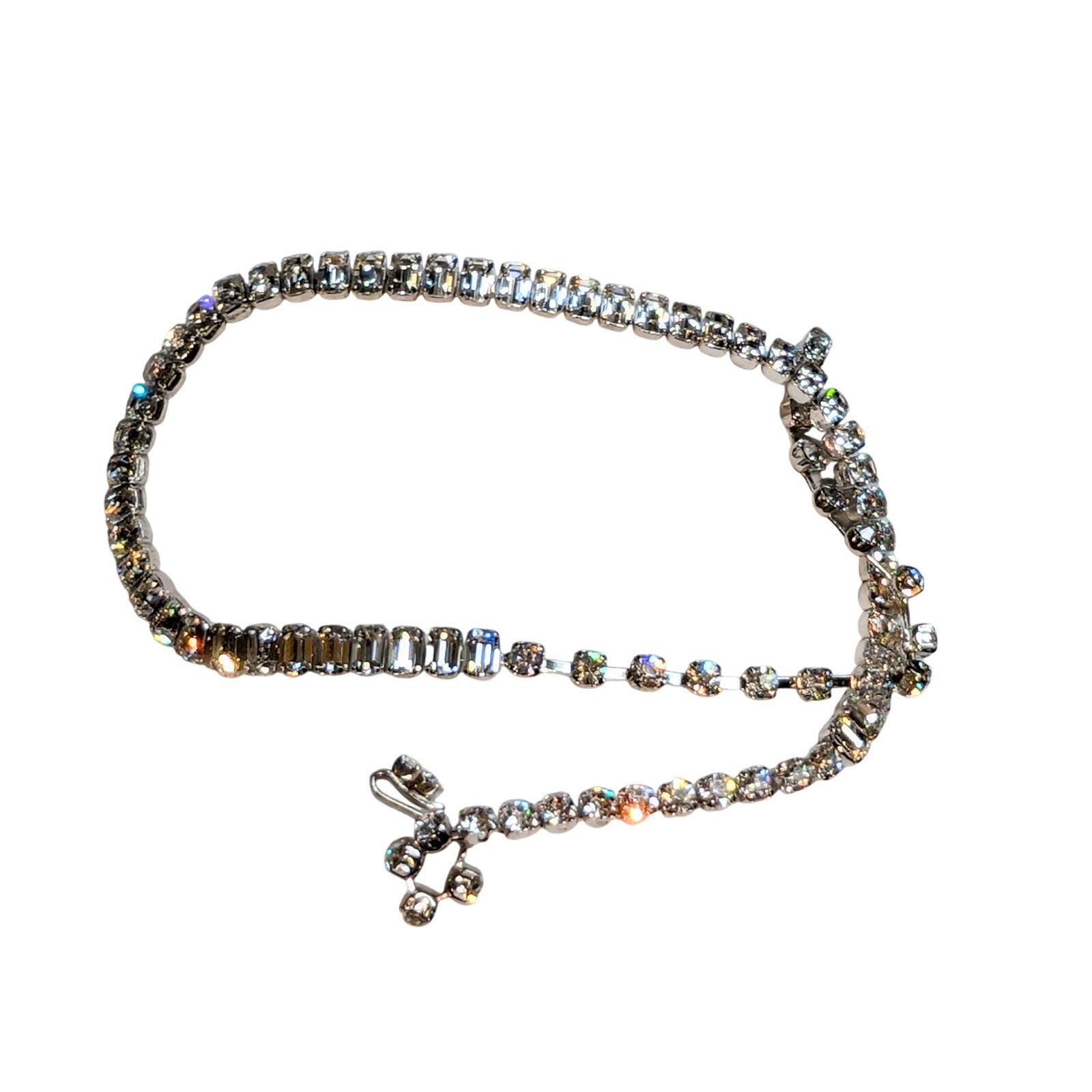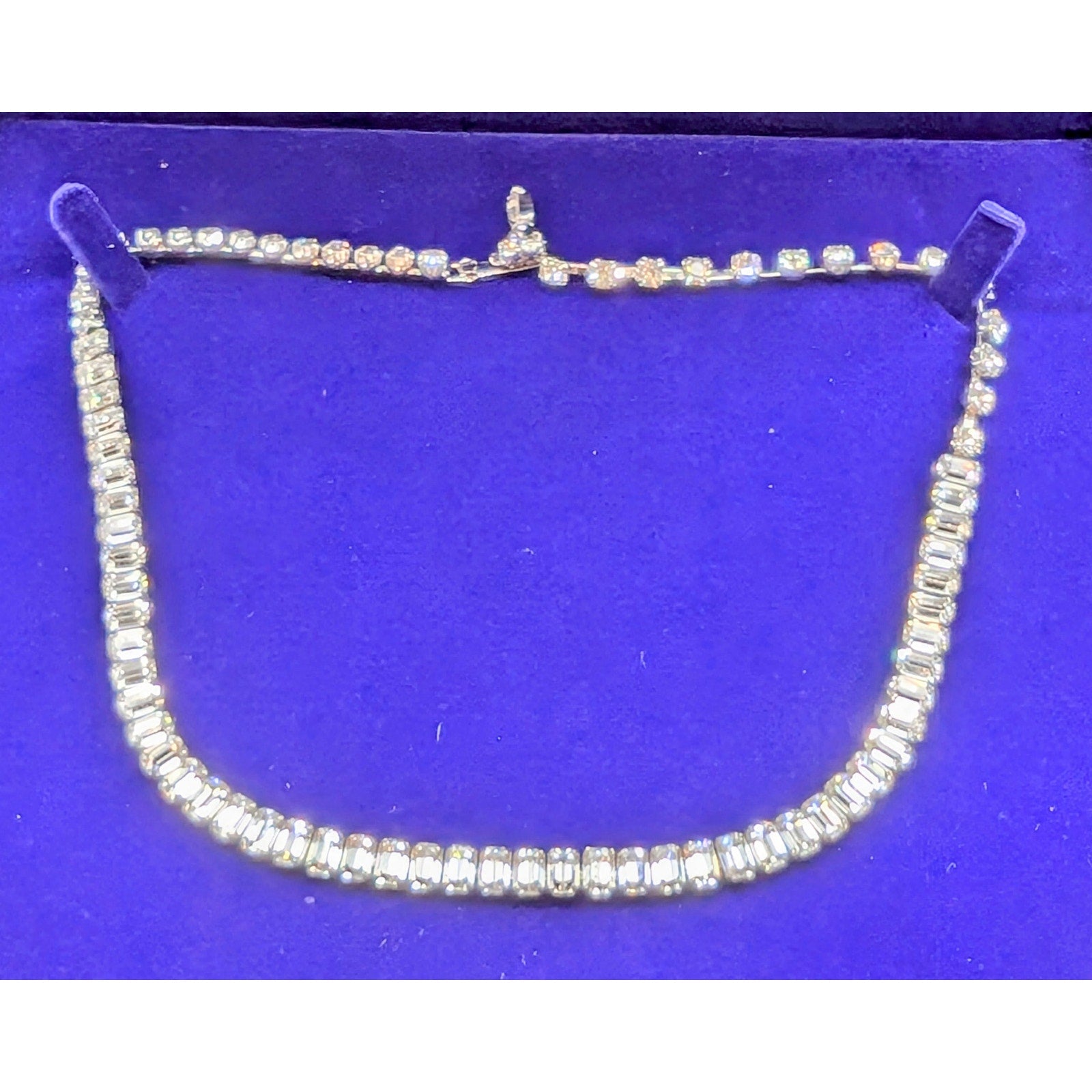 Vintage Weiss Signed Clear Rhinestone Choker Necklace. Featuring a stunning 16.5" choker necklace with baguette and brilliant cut clear rhinestones. The necklace is marked Weiss and is in excellent condition. The baguettes are standing up side by side. No wear on this necklace. The sparkle is spectacular!