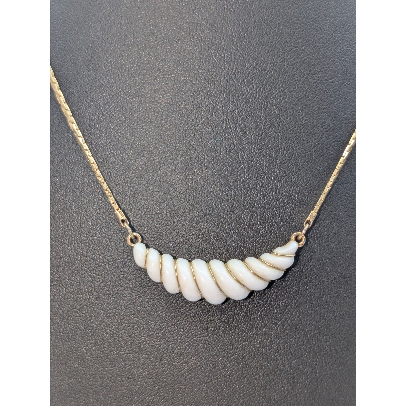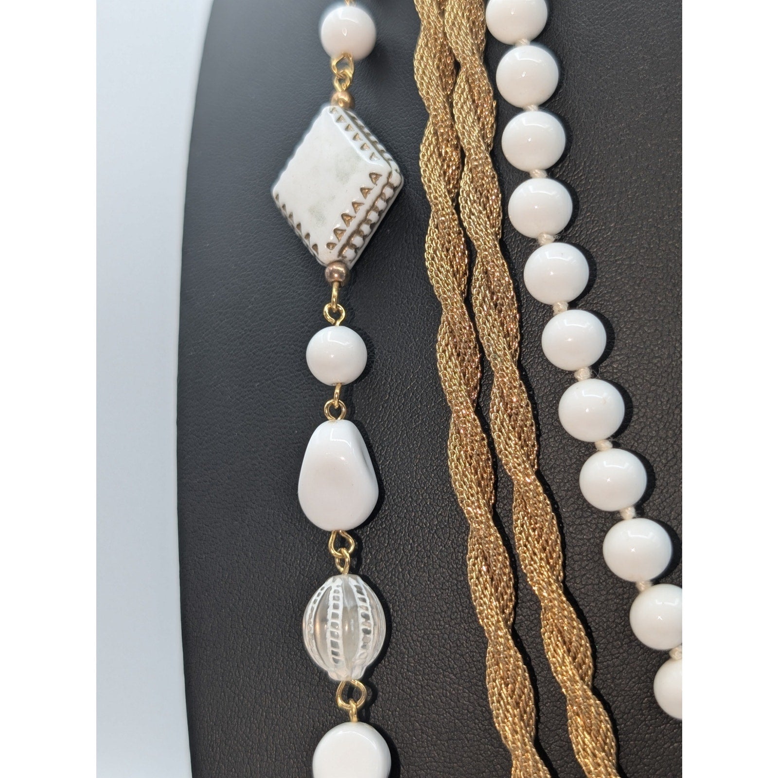 Vintage White & Gold Layered Necklace Jewelry Lot. Vintage Avon Gatsby Necklace circa 1981. Monet white glass knotted bead necklace. Twisted mesh muted metallic gold chain. Lastly, white, clear, gold acrylic beaded over the head vintage necklace. Pre-owned, all these pieces are in excellent condition.