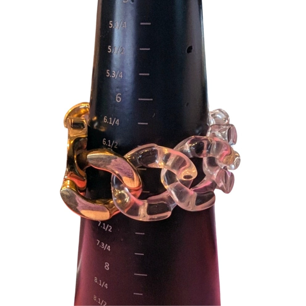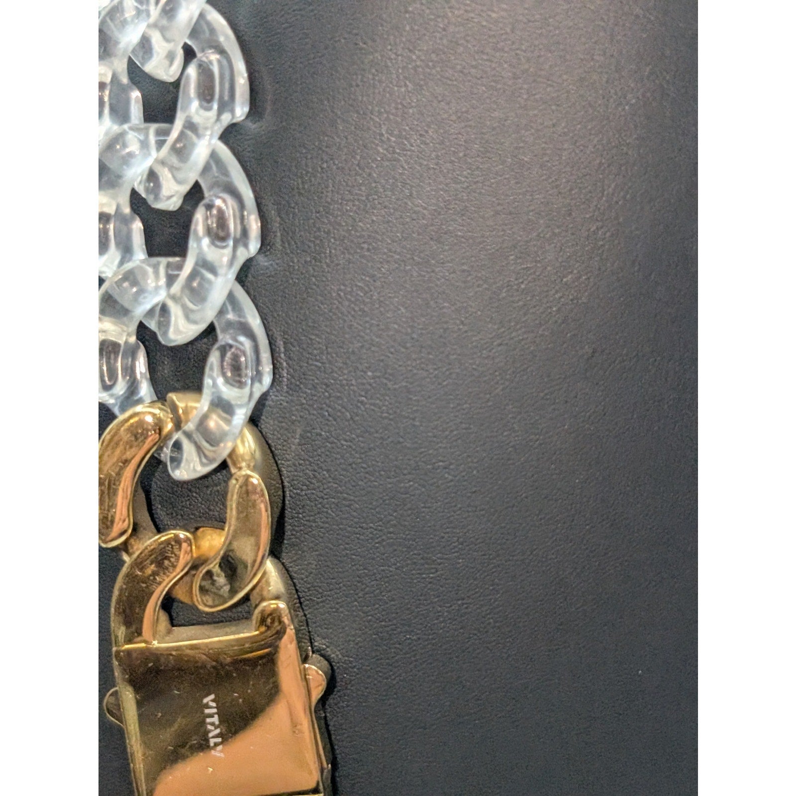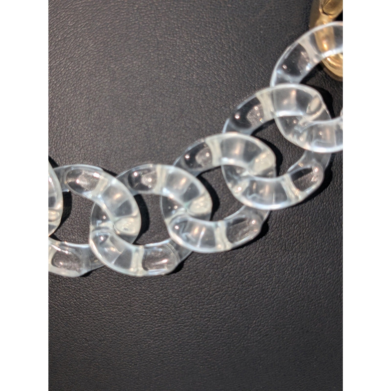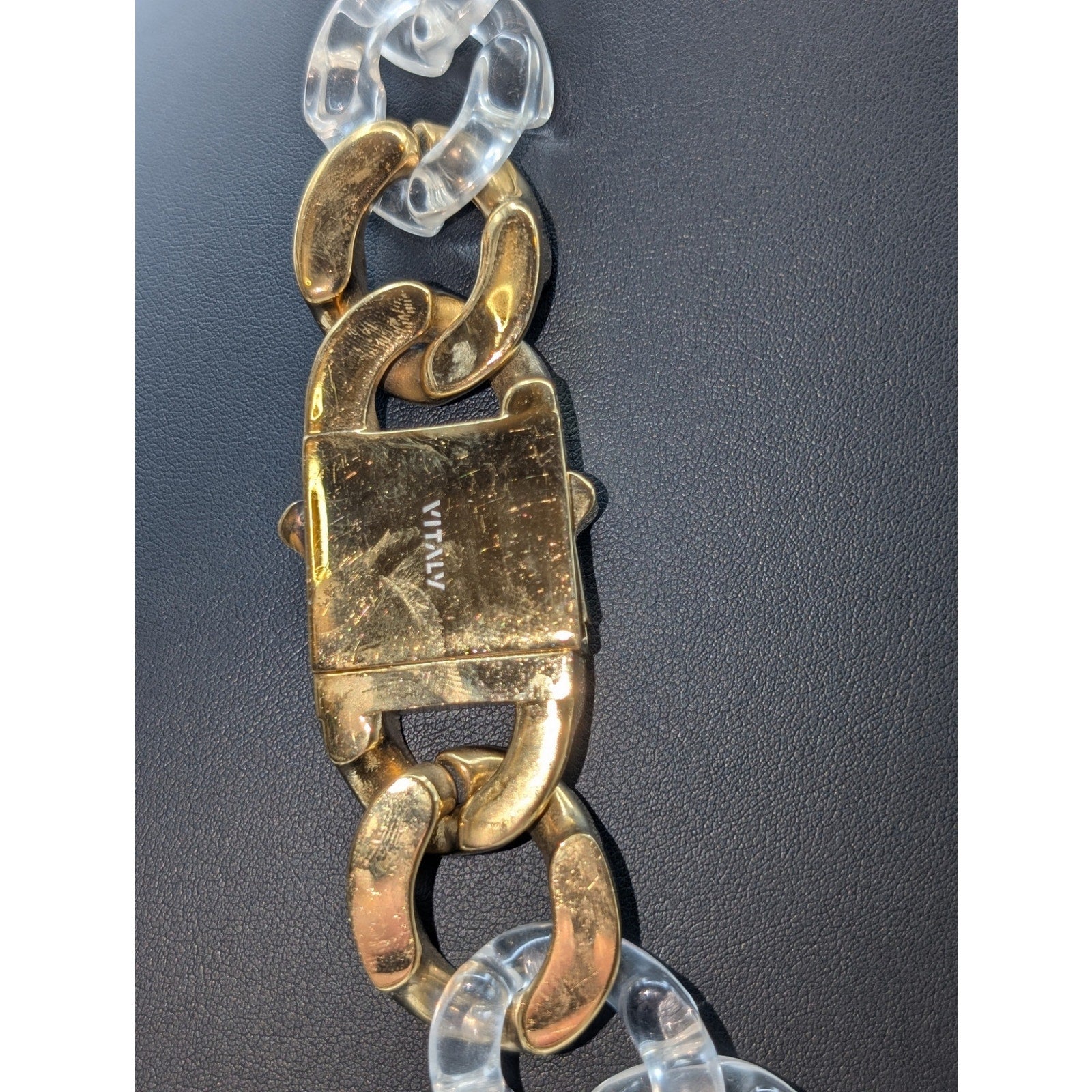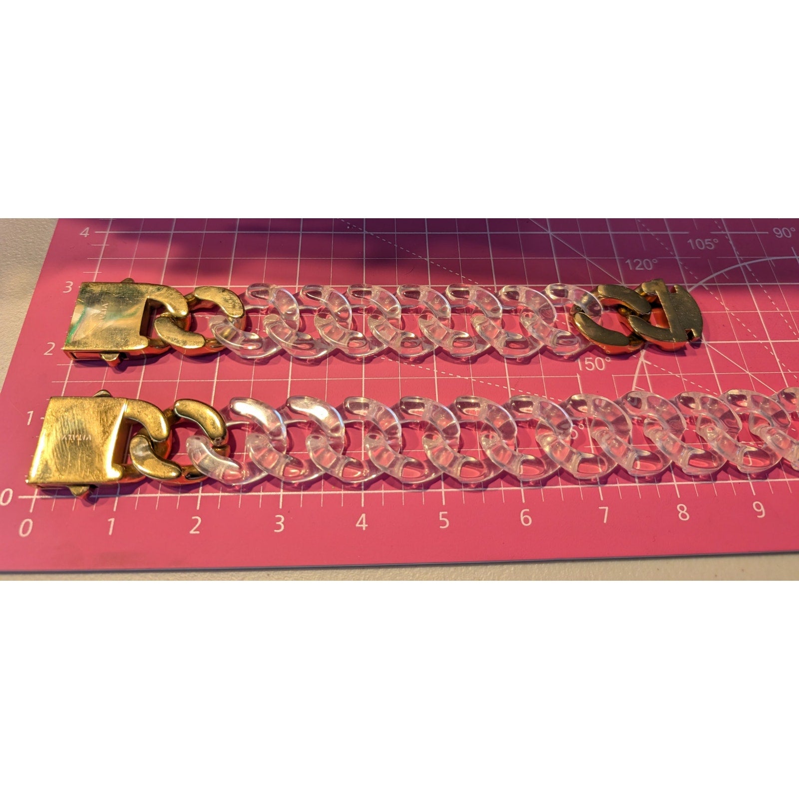Vitaly Clear Lucite Cuban Chain Gold Tone Buckle Clasp Necklace & Bracelet Set. Not for the faint of heart. This heavy weight chain is approximately 26mm wide. Can be worn together as one longer chain or as a necklace and bracelet. Pre-owned, this is some very minor surface scratching on the clasp and is in overall great condition.