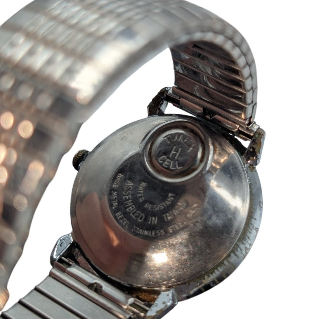Vtg 1980 Timex Q Stainless Steel H Cell 57119 England 05580 Signed Quartz Watch. Pre-owned, this vintage watch has some wear as seen in the photos. I have not attempted to replace any batteries or clean the watch. This watch has not been tested for accuracy or full functionality.