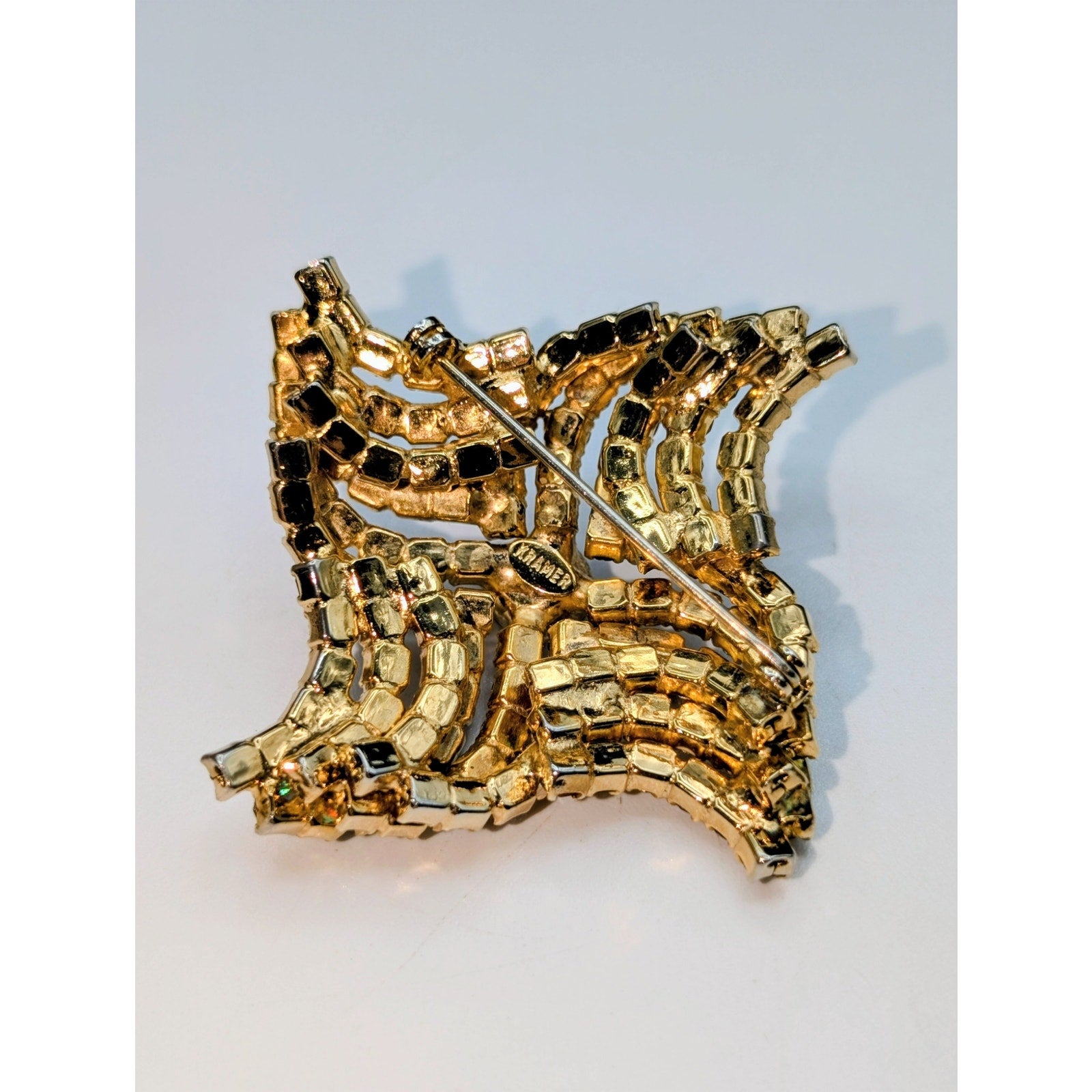 VTG 60s Kramer Gold Tone Vortex Wave Style Topaz & AB Rhinestone Pin Brooch. Pre-owned, this gorgeous brooch is in excellent vintage condition. All rhinestones present.