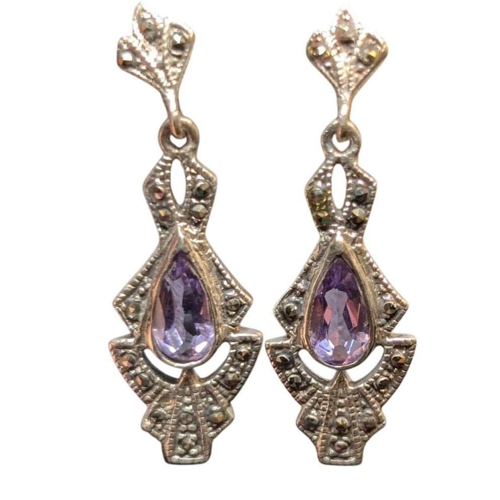 Vintage 80s Art Deco Sterling Silver Teardrop Amethyst Marcasite Post Drop Earrings. Pre-owned, these earrings are in excellent vintage condition.