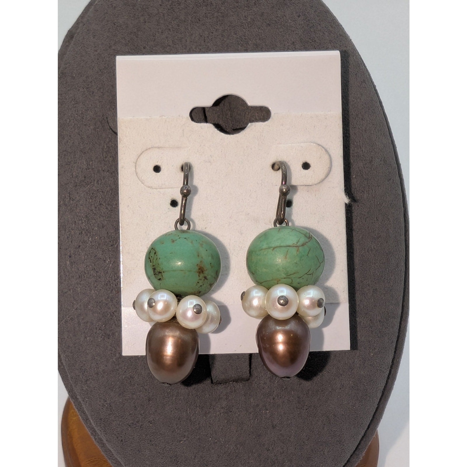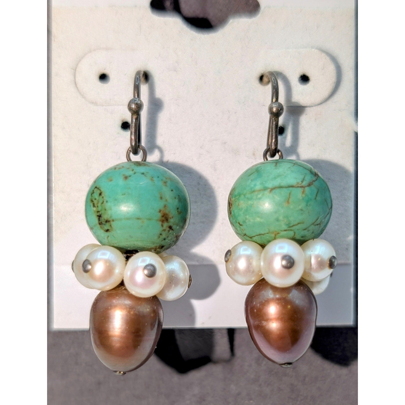 VTG 925 Green Turquoise Freshwater White and Chocolate Pearl Dangle Earrings