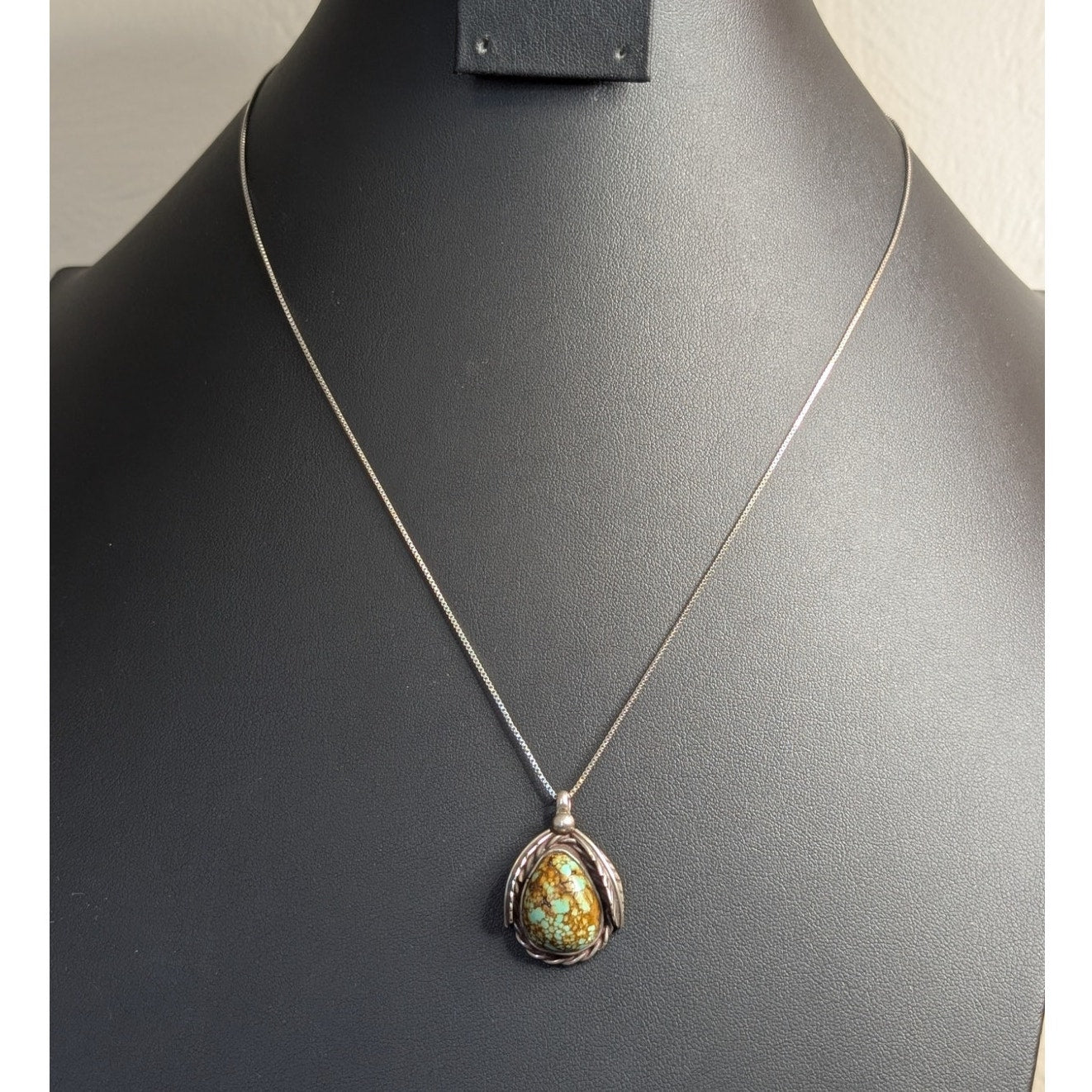 VTG 925 Sterling Navajo Brown Web Pear Shape Turquoise Leaf Pendant Necklace