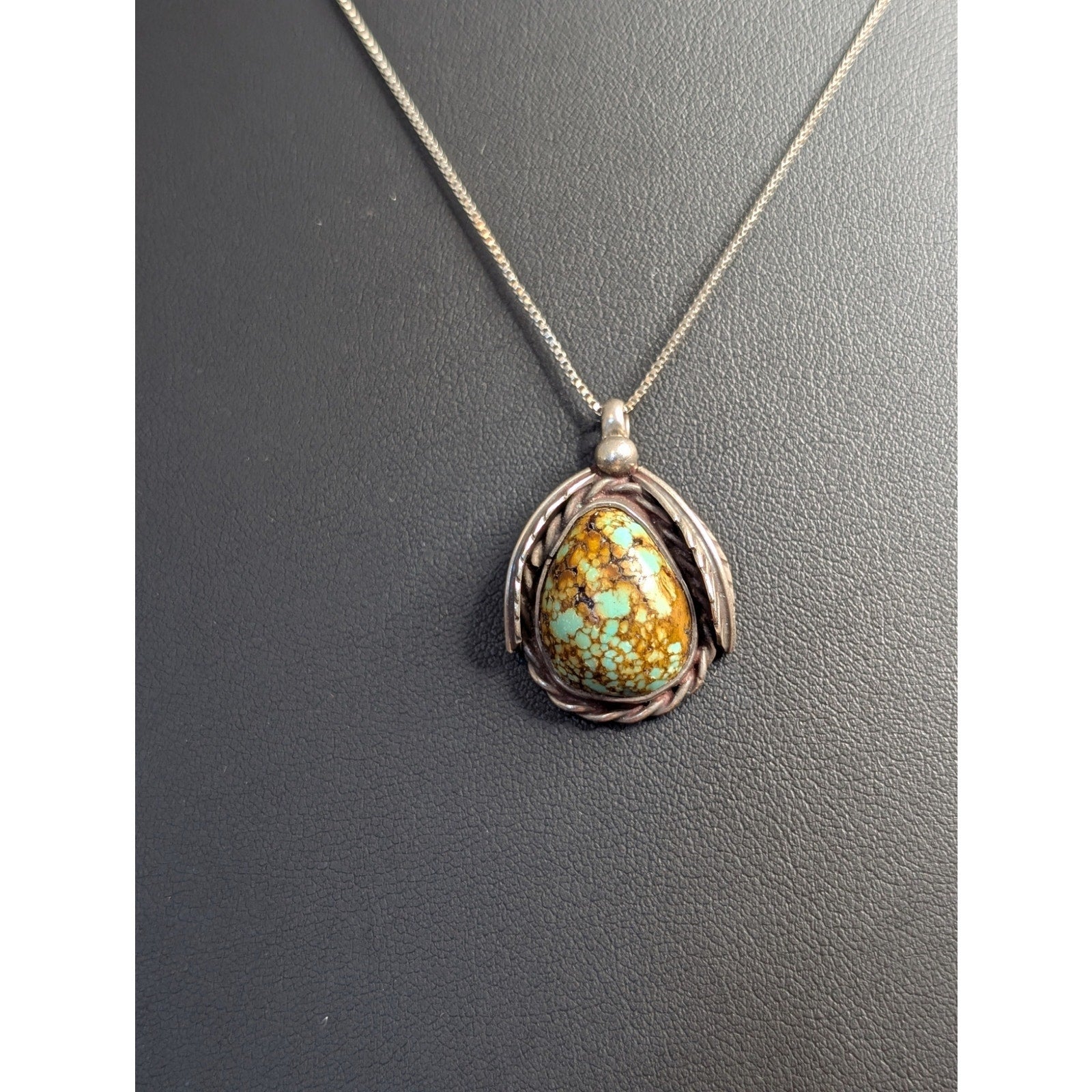 VTG 925 Sterling Navajo Brown Web Pear Shape Turquoise Leaf Pendant Necklace. Pendant, including bale, measures approximately 1.25" long by .75" wide. Sterling box chain is 18"-20" long.