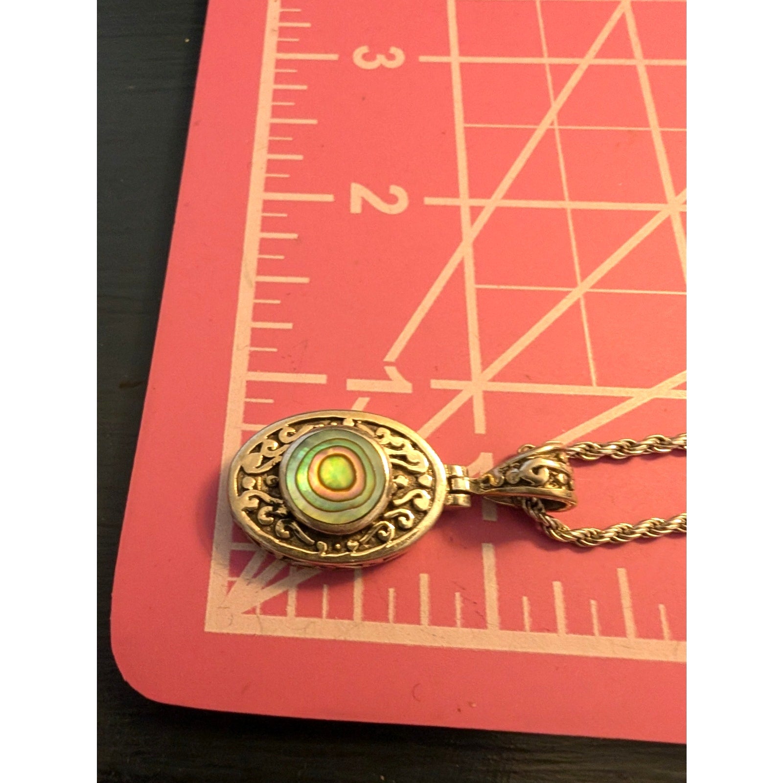 VTG 925 Sterling Silver Filigree Abalone Shell Hinged Pendant Rope 24" Chain Necklace. Pre-owned, this vintage necklace is in excellent condition.