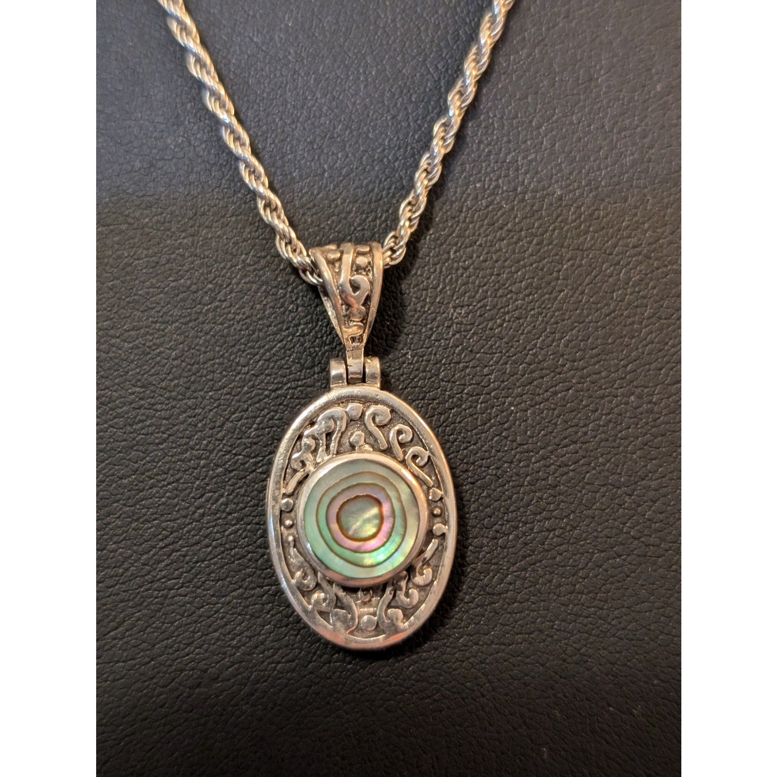 VTG 925 Sterling Silver Filigree Abalone Shell Pendant Rope 24" Chain Necklace