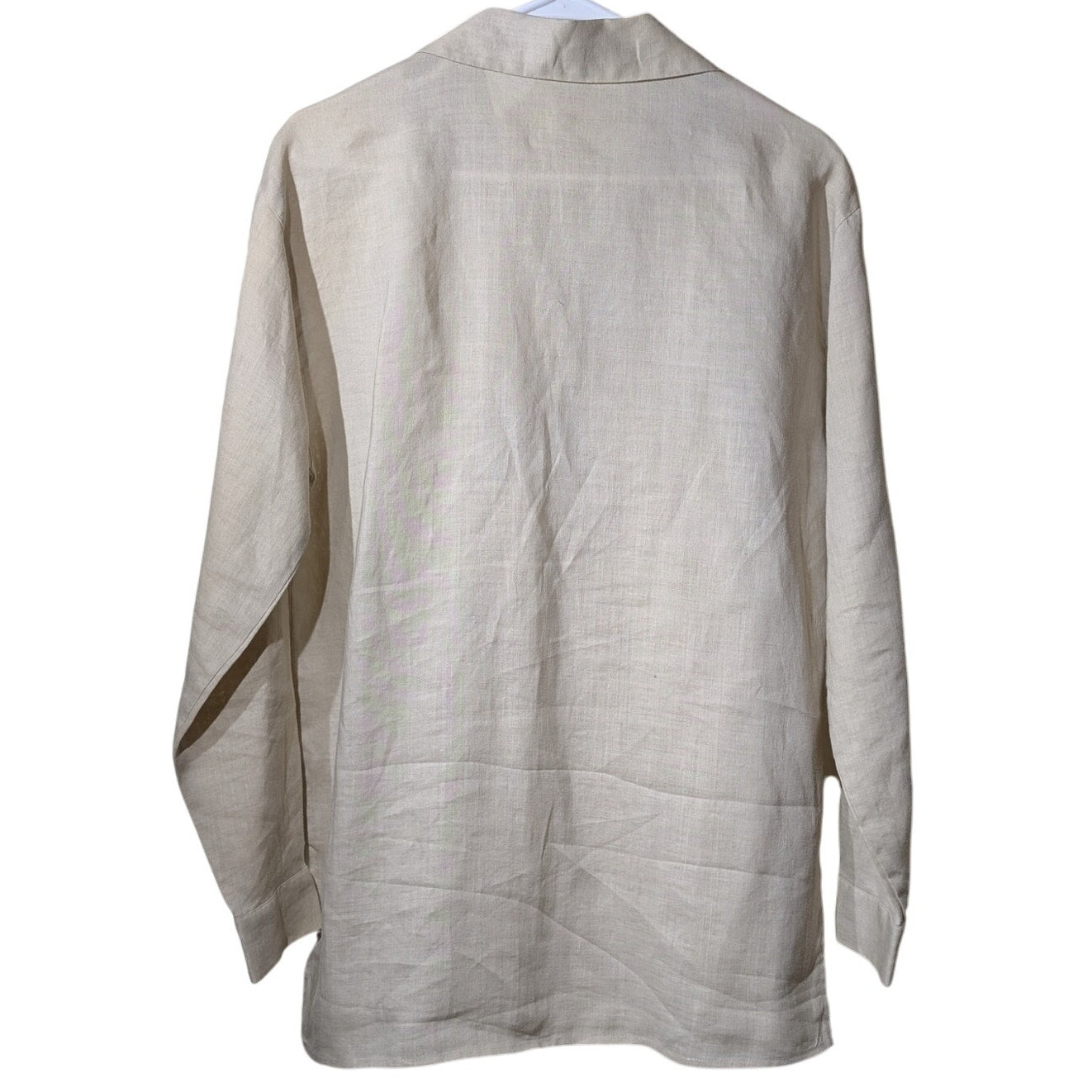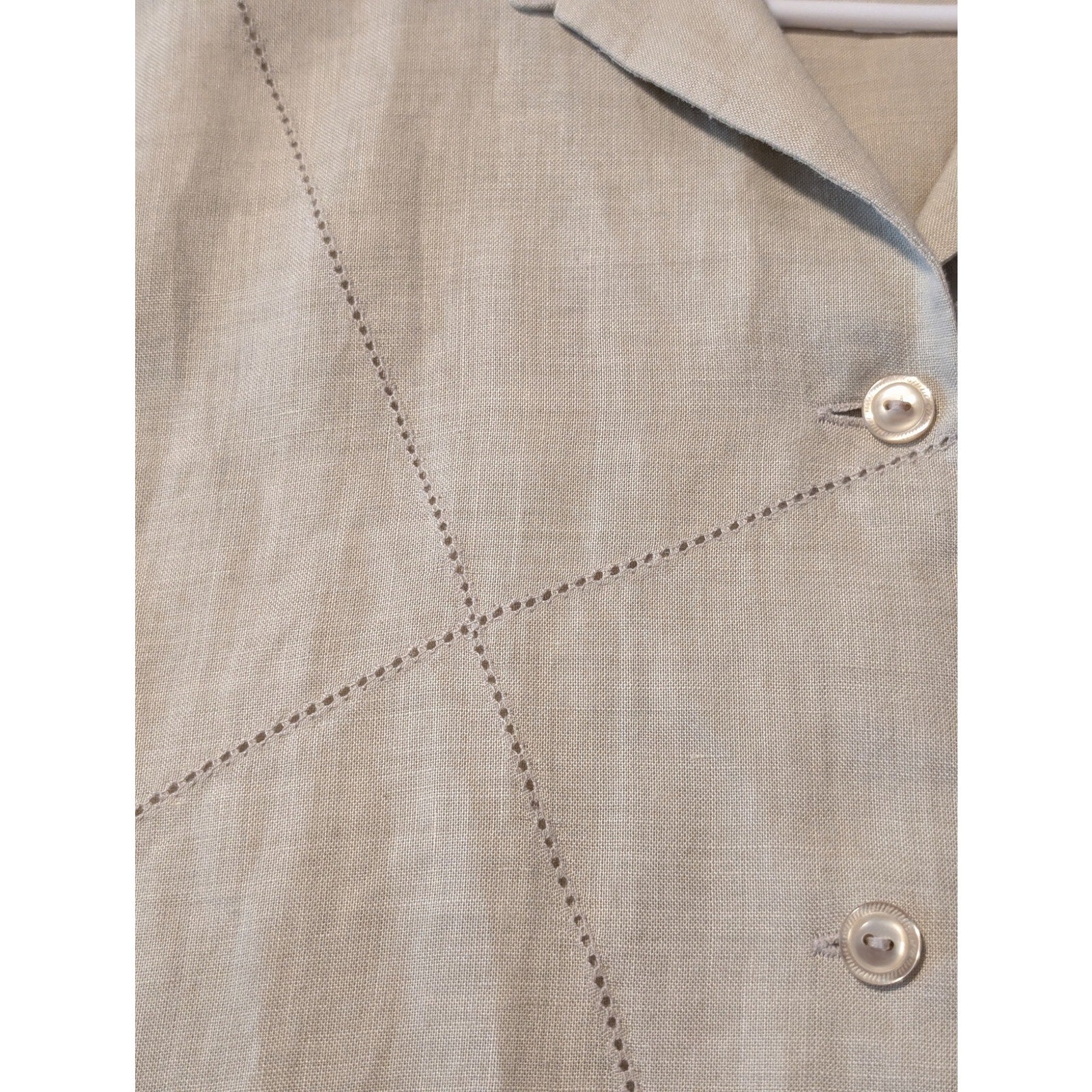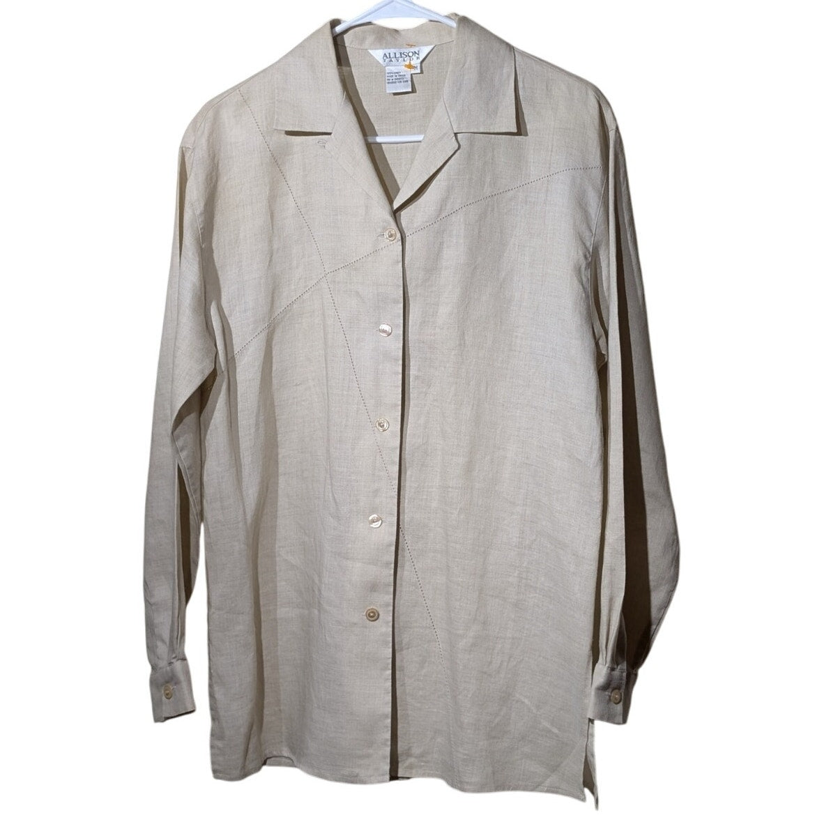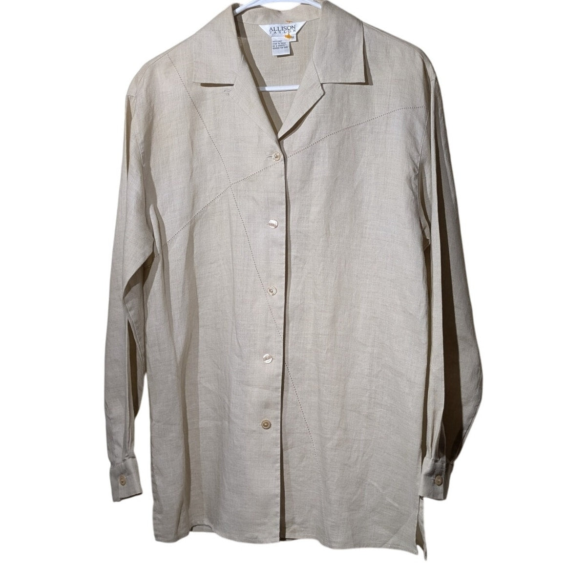 Vtg Allison Taylor Ecru Linen Cut Out Stitch Detailing Side Slit Button Front Top Sz M. Pre-owned, this blouse is in excellent condition. It measures 29" long and 19.5" armpit to armpit.
