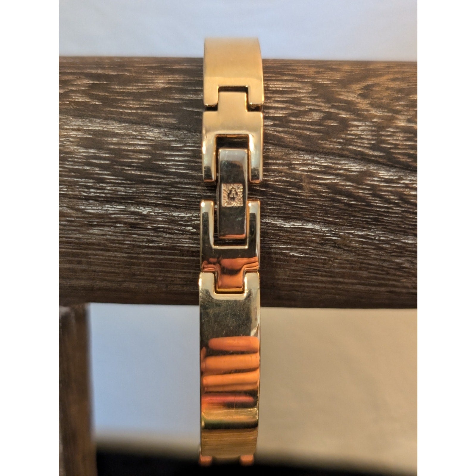 Vintage Anne Klein Gold Tone Logo Lion Head Cut Out Lion Pierced Earrings & Oval Bar Hinge Bracelet. Pre-owned, these pieces are in great condition. The posts on the earrings are slightly bent, and I don't want to mess with them for fear I would break them.