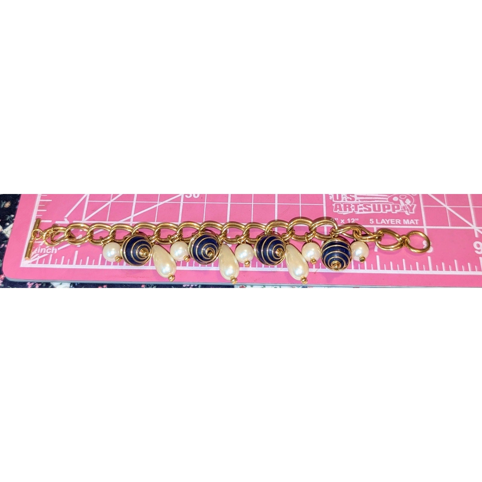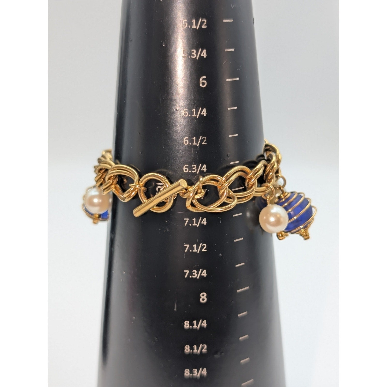 VTG Blue Cage Bead Faux Pearl Charm Gold Tone Chain Link Toggle Clasp Bracelet