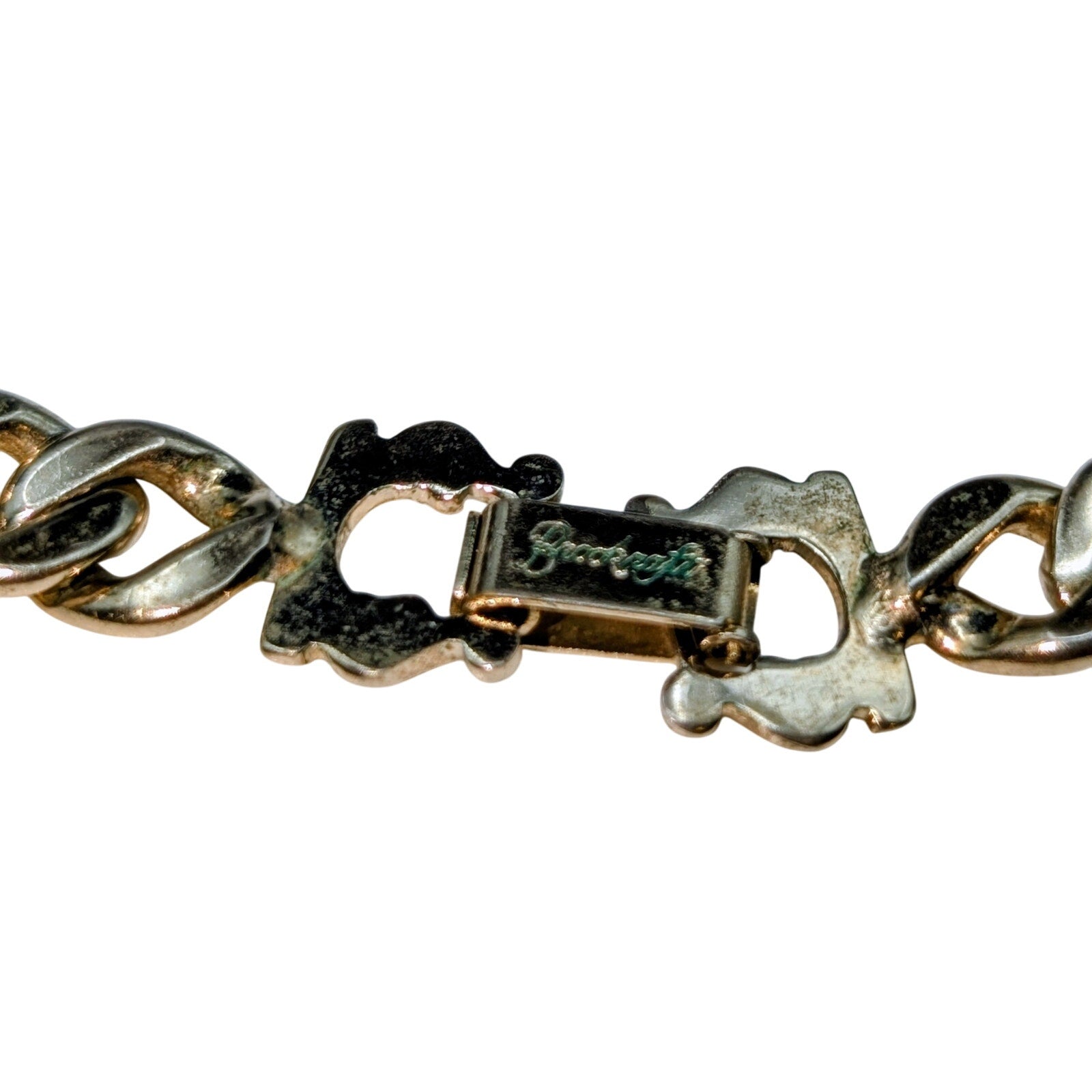 VTG Brookraft Emerald Green Rhinestone Embossed Goldtone Chain 15" Choker Necklace. Fold over clasp. Pre-owned, this rhinestone necklace is in gorgeous vintage condition. A tiny bit of wear on the clasp. Soft, muted gold color and beautiful emerald green rhinestone stations. Often, photos are enlarged to show detail and are part of the description.