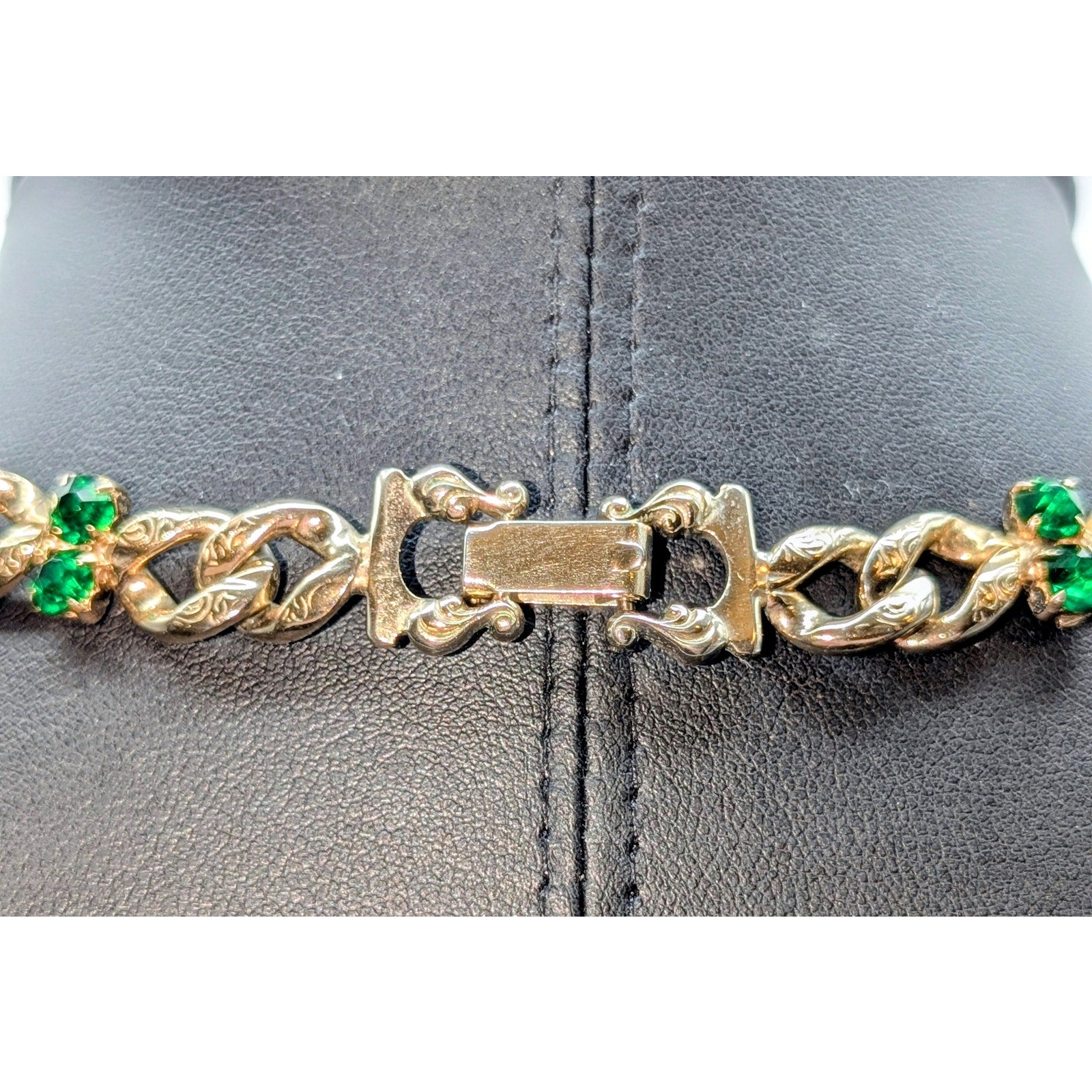 VTG Brookraft Emerald Green Rhinestone Embossed Goldtone Chain Choker Necklace